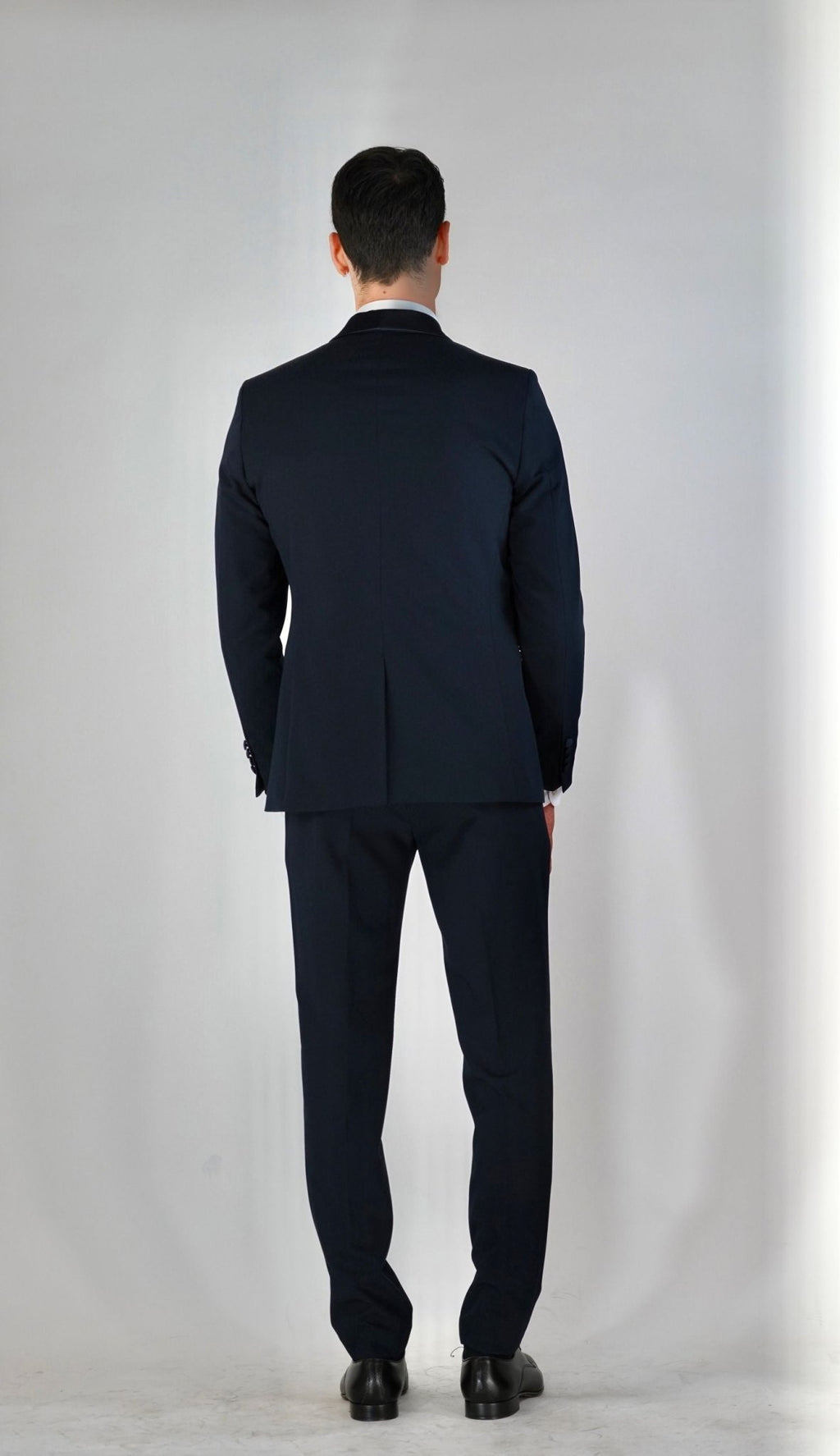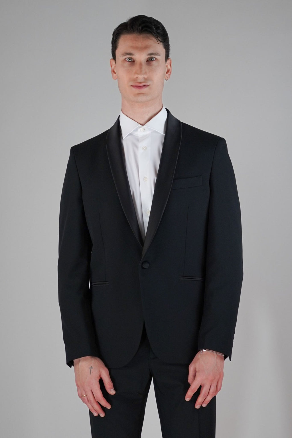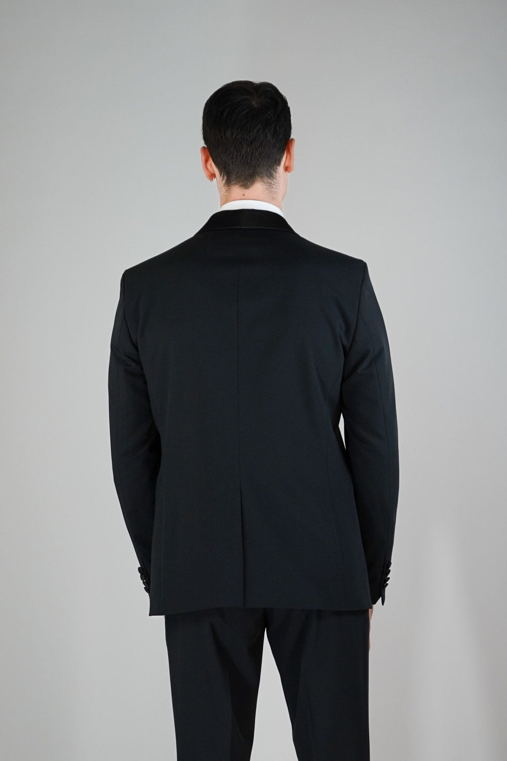 Smoking rever a scialle lucido, un bottone ricoperto, 2 tasche a filo ricoperte, taschino lato petto e spacco centrale