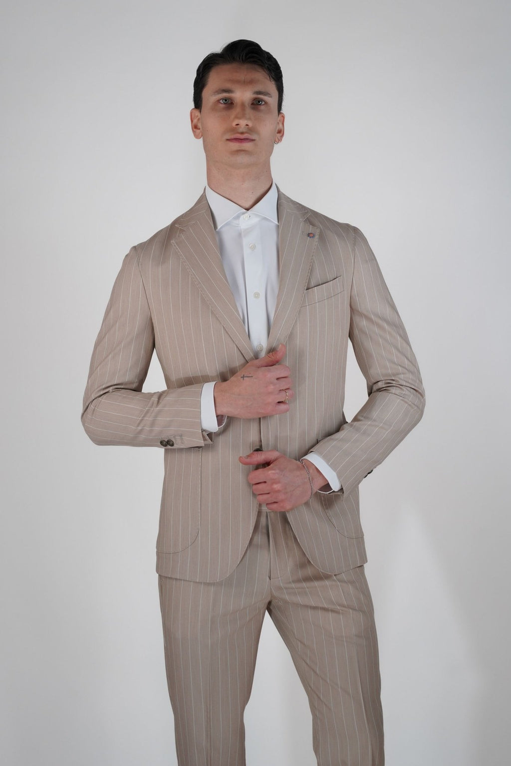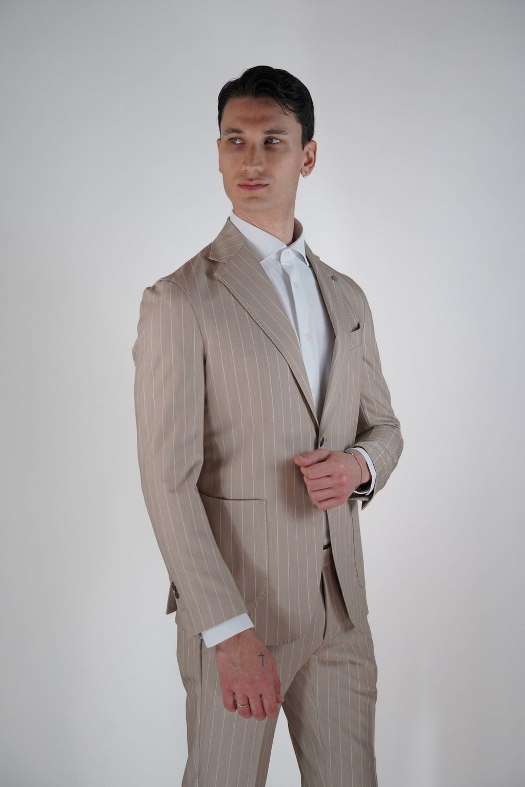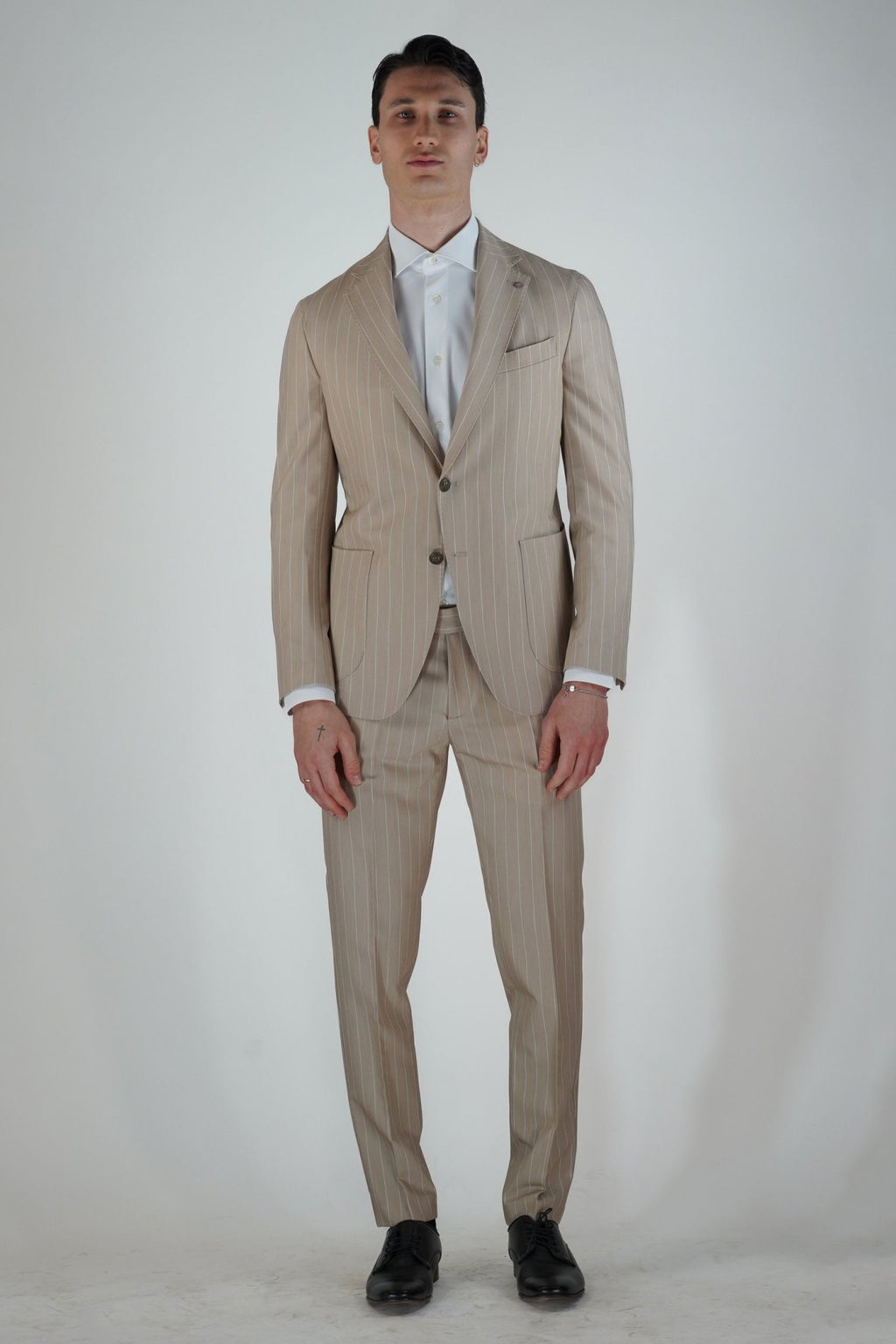 Abito 2 bottoni in metallo, 2 tasca a toppa, un taschino sul petto, rever classico impunturato, con due spacchi sul retro