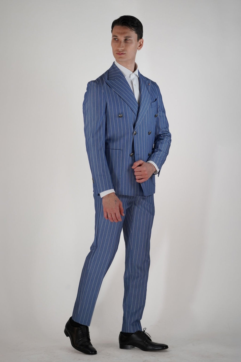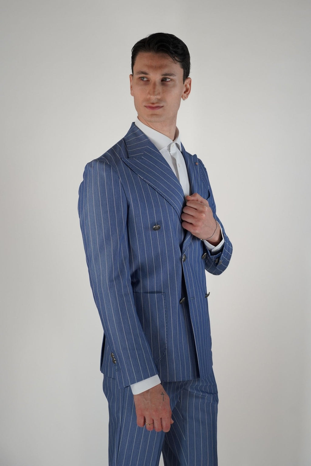 Abito gessato doppiopetto 6 bottoni in metallo, 2 tasca a toppa, un taschino sul petto, rever ampio a lancia impunturato, con due spacchi sul retro