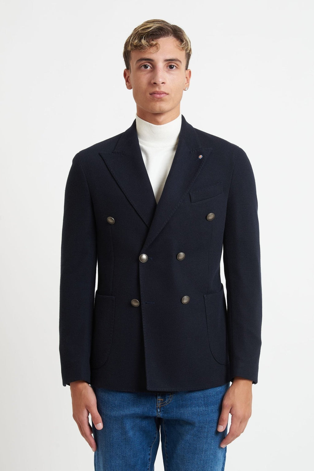 Un capo elegante e versatile, questa giacca doppiopetto sfoderata da uomo presenta rever a lancia, due tasche a toppa e un taschino frontale, e due spacchi sul retro per maggiore comodità. I quattro bottoni ai polsi e le finiture con impunture aggiungono dettagli raffinati e curati, perfetti per look formali o smart casual.