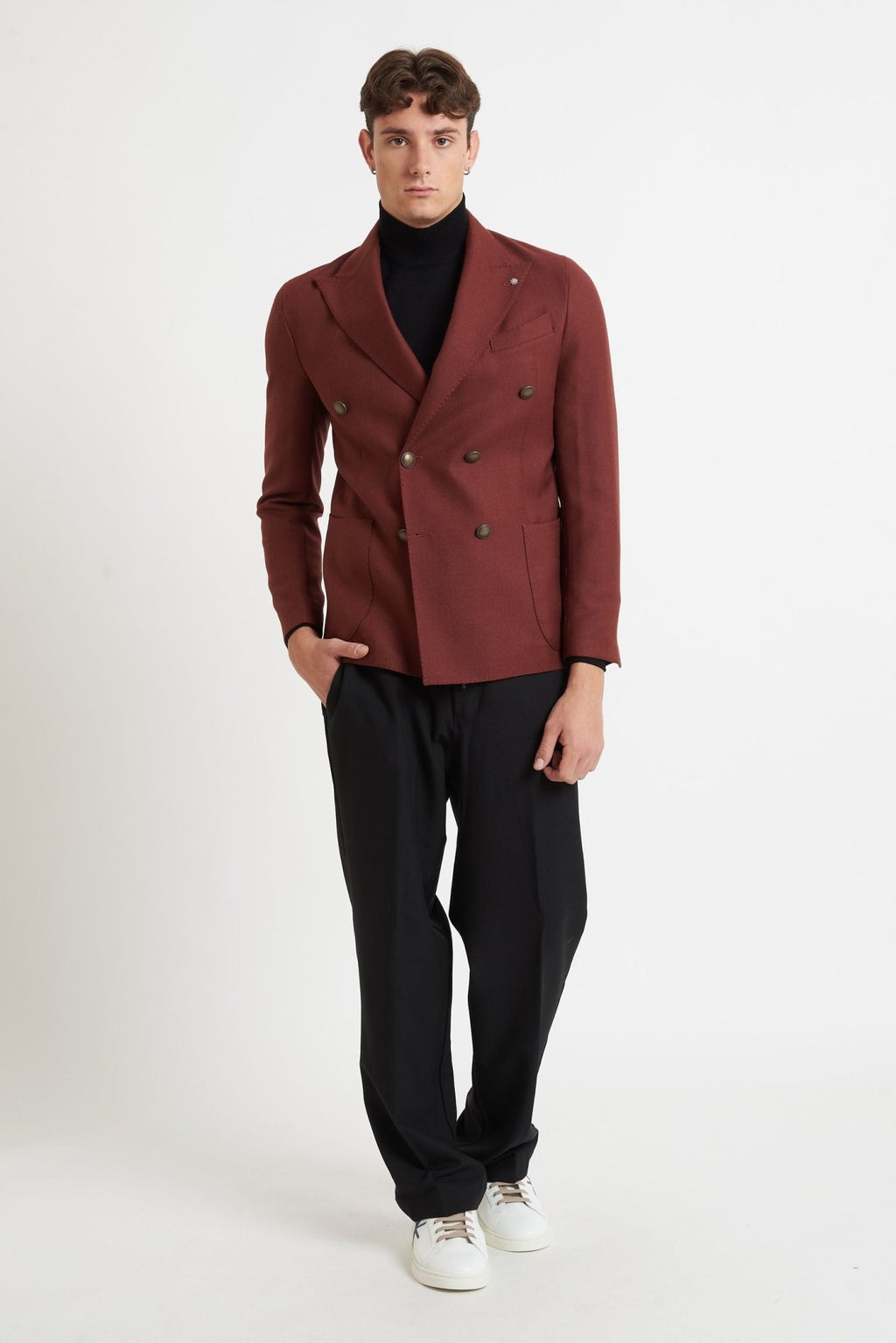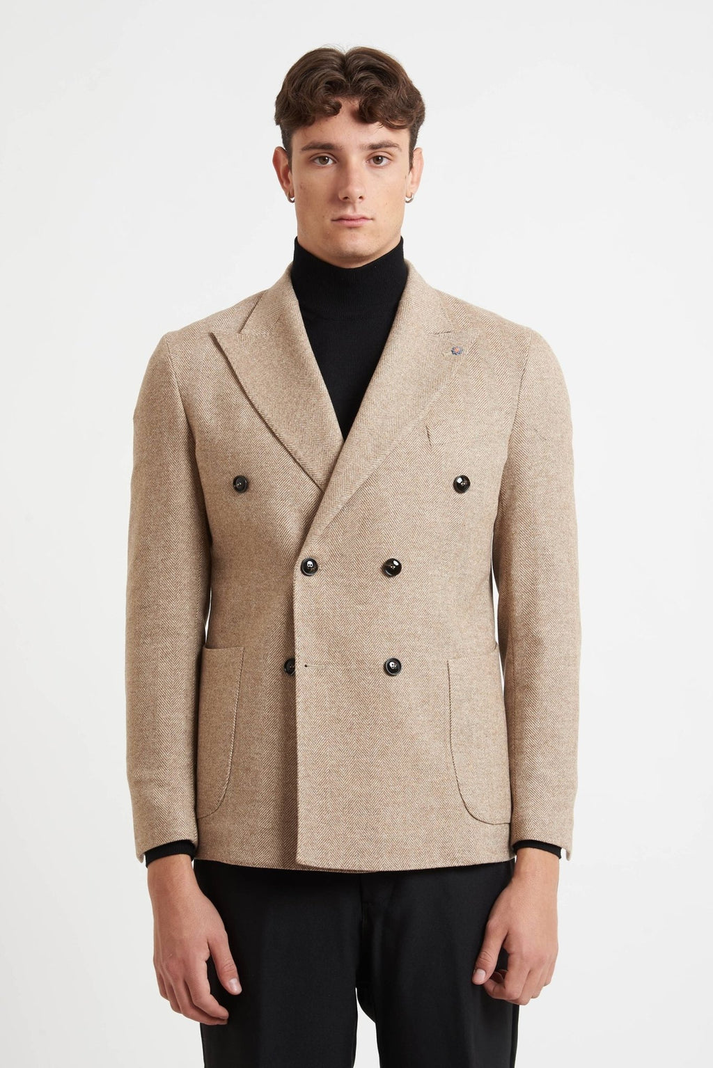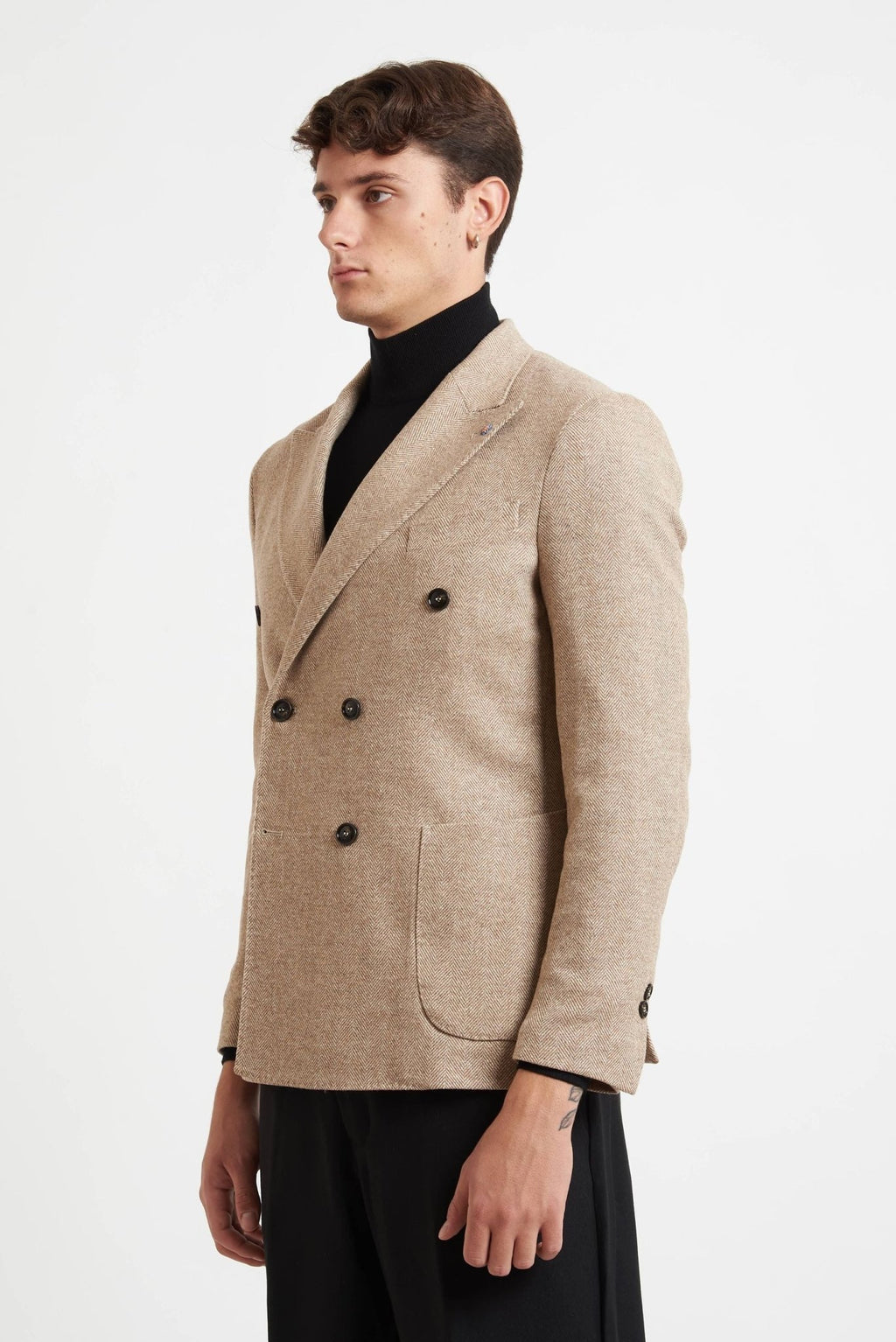 Eleganza e stile sartoriale definiscono questa giacca doppiopetto sfoderata da uomo, caratterizzata da rever a lancia, due tasche a toppa e un taschino frontale, e due spacchi sul retro per maggiore libertà di movimento. I quattro bottoni ai polsi e le finiture con impunture completano il design con dettagli raffinati.