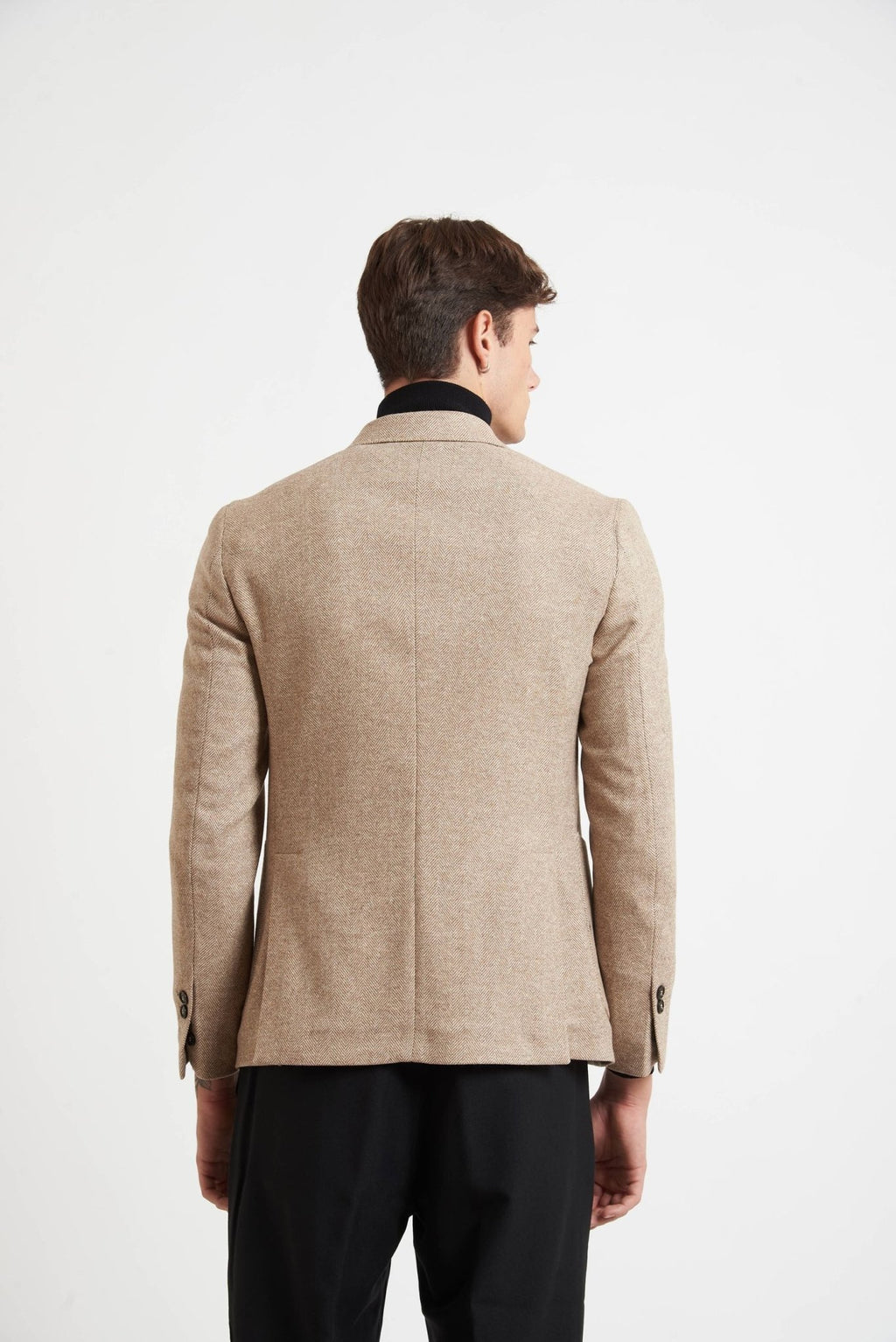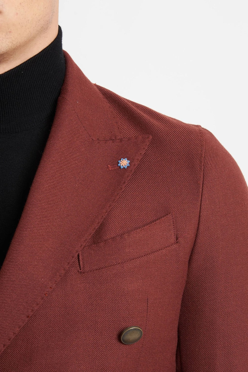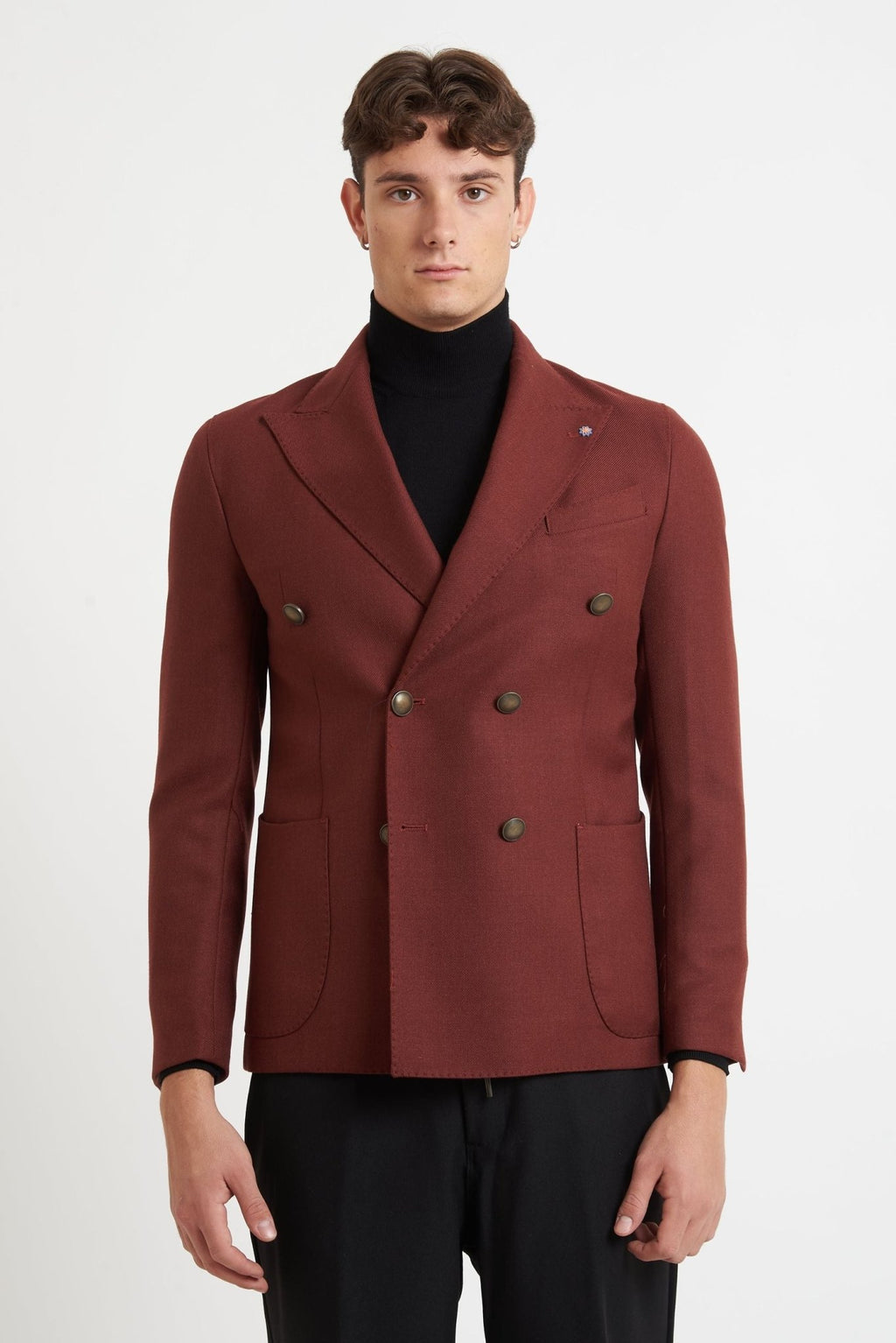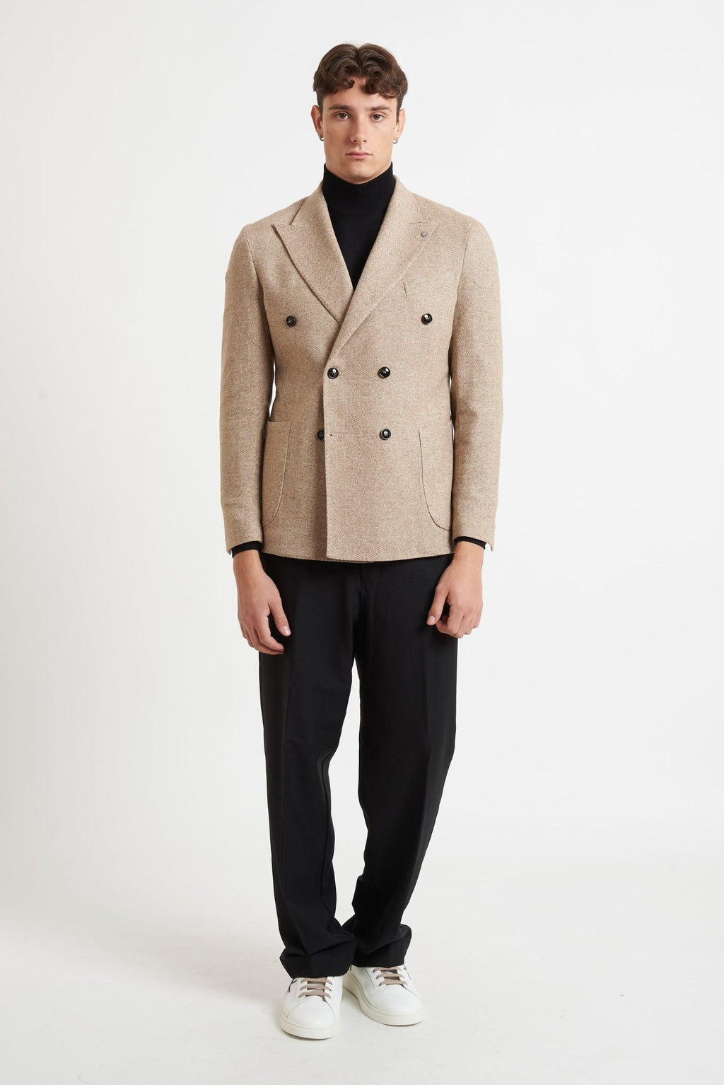 Eleganza e stile sartoriale definiscono questa giacca doppiopetto sfoderata da uomo, caratterizzata da rever a lancia, due tasche a toppa e un taschino frontale, e due spacchi sul retro per maggiore libertà di movimento. I quattro bottoni ai polsi e le finiture con impunture completano il design con dettagli raffinati.