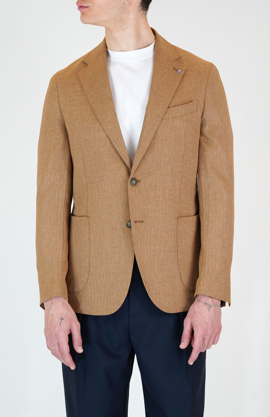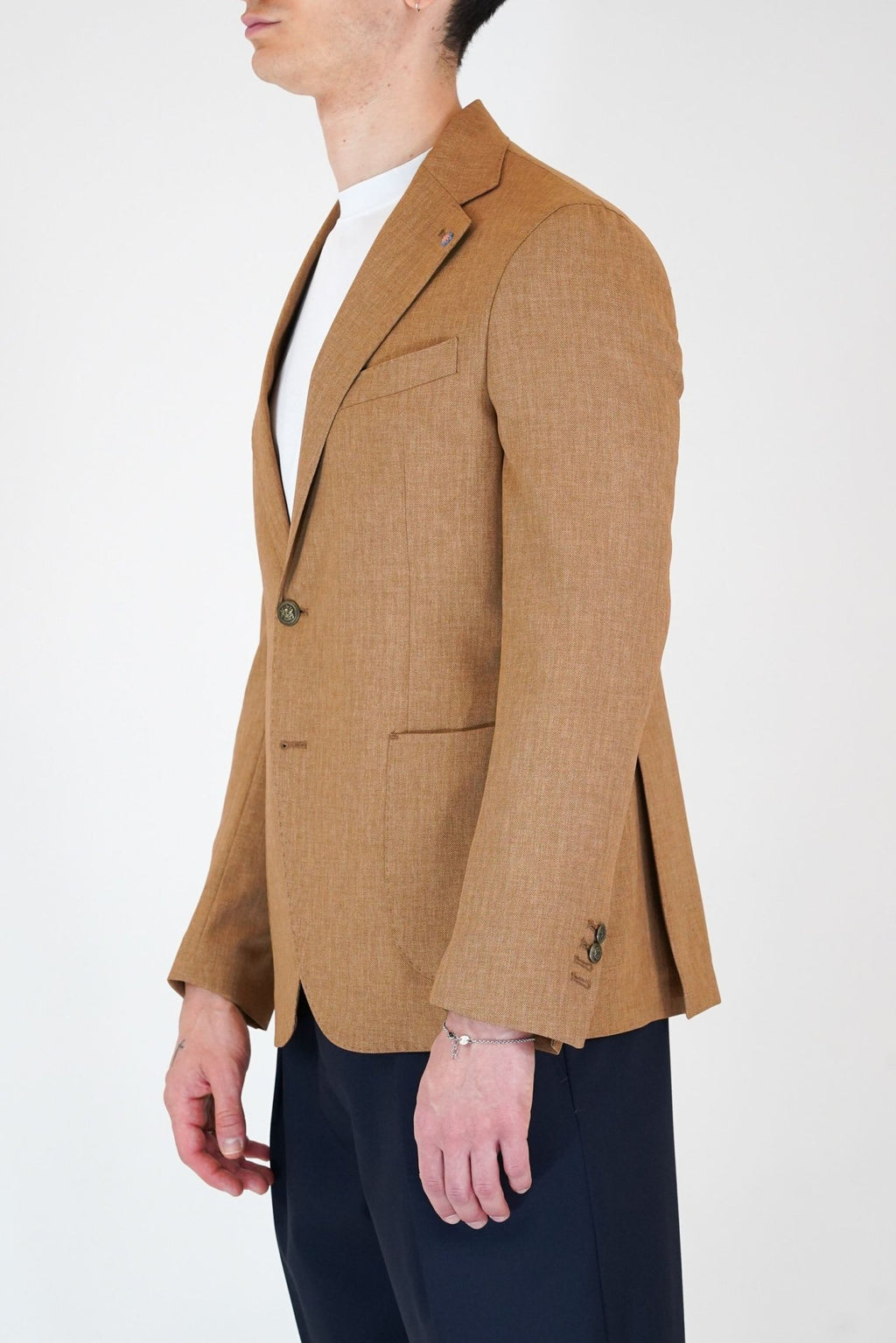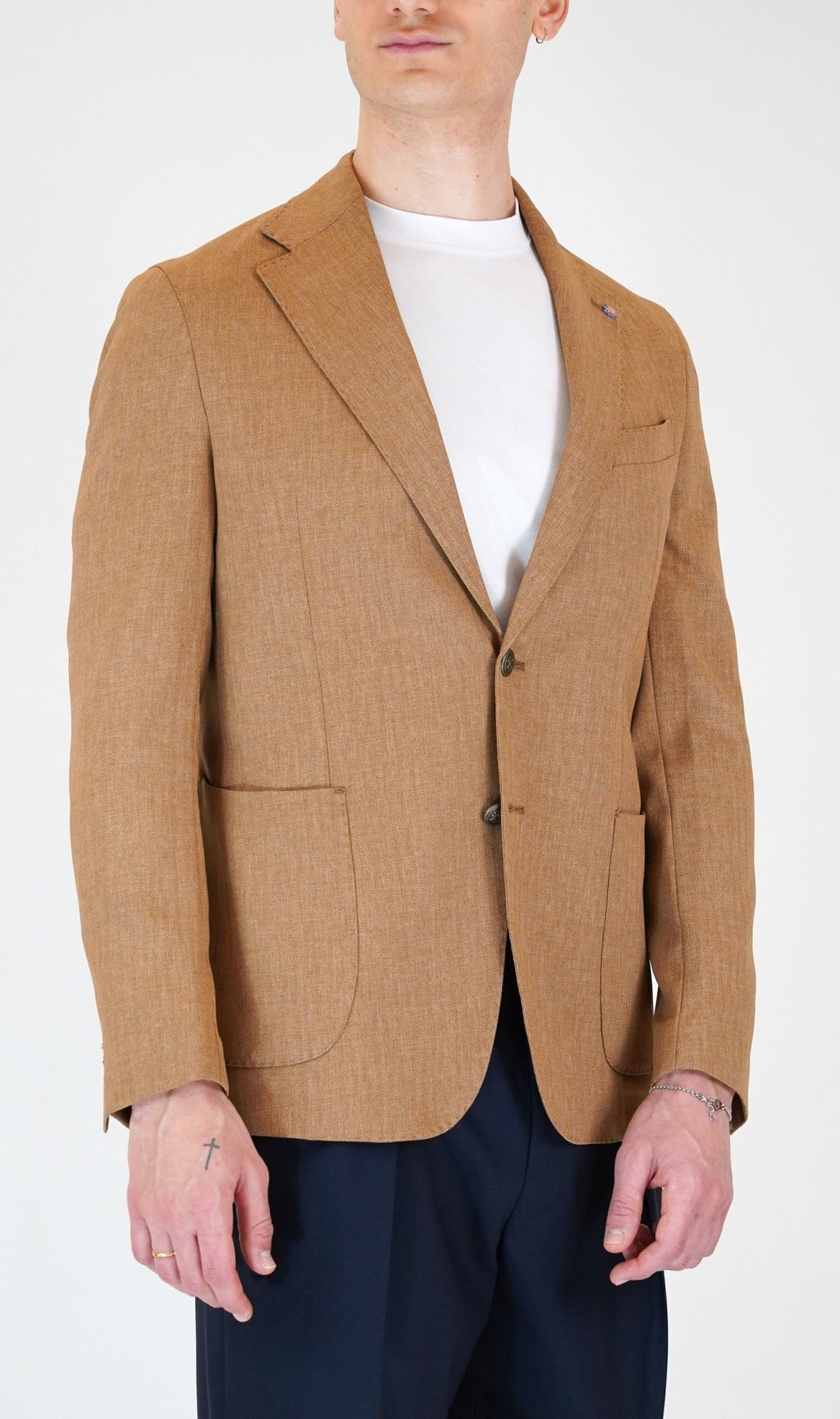 Giacca monopetto spina di pesce 2 bottoni in metallo, 2 tasca a toppa, un taschino sul petto, rever classico con cran aperto impunturato, con due spacchi sul retro