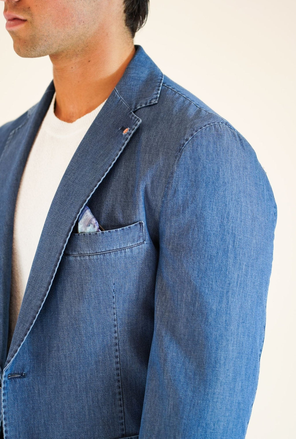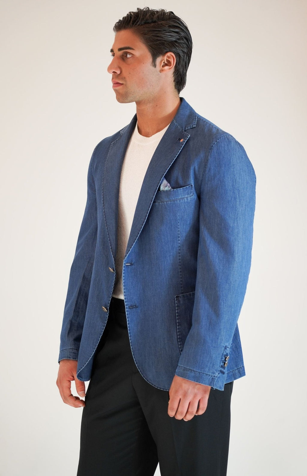 Giacca monopetto tessuto effetto jeans, 2 bottoni in metallo, tasca a toppa, un taschino lato petto, 2 spacchi, rever classico con cran aperto