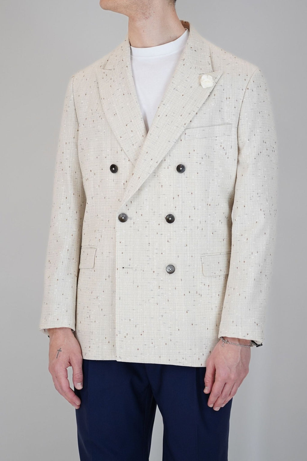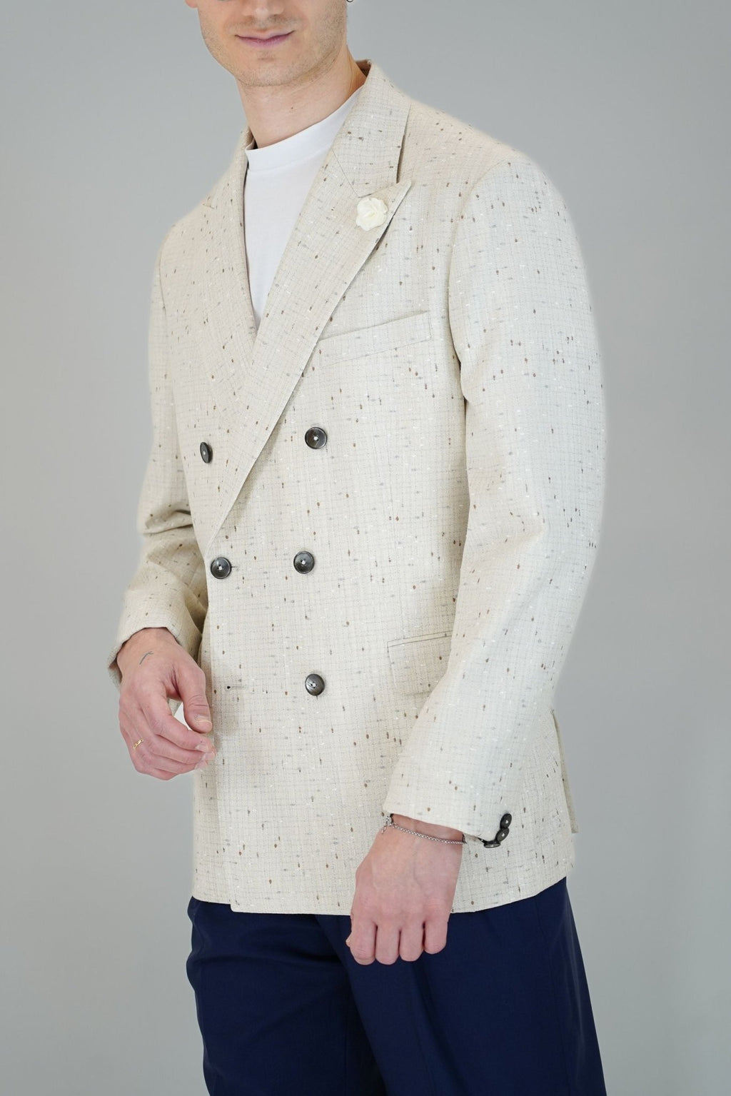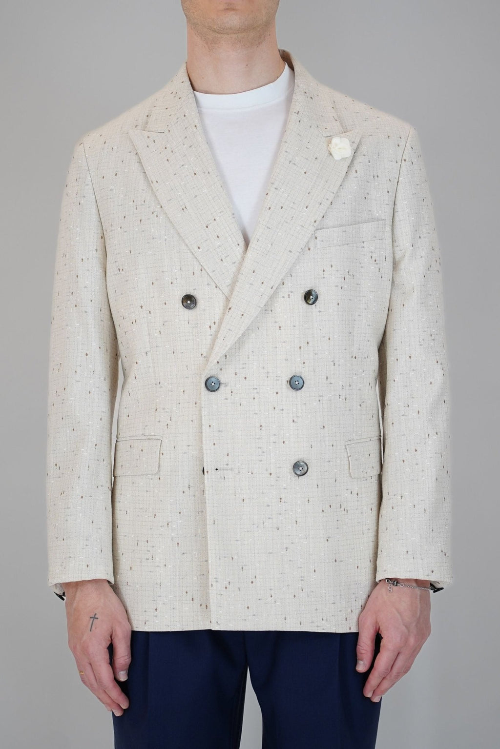 Giacca fantasia doppiopetto sfoderata, rever a lancia, due tasche a filo con pattina e un taschino frontale, due spacchi sul retro, quattro bottoni ai polsi.