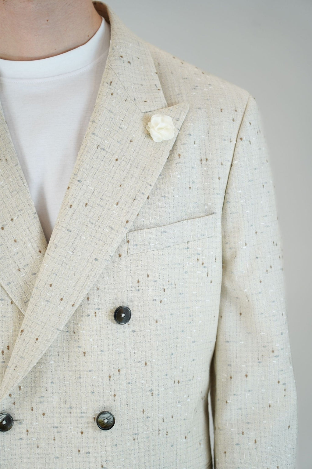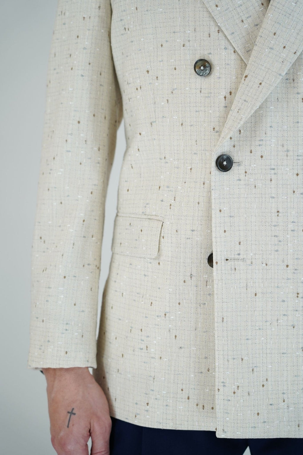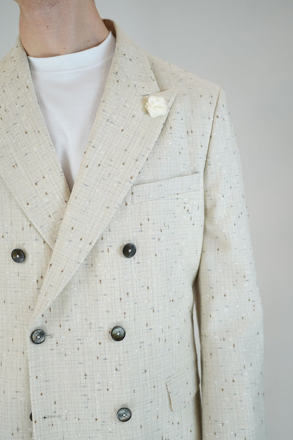 Giacca fantasia doppiopetto sfoderata, rever a lancia, due tasche a filo con pattina e un taschino frontale, due spacchi sul retro, quattro bottoni ai polsi.
