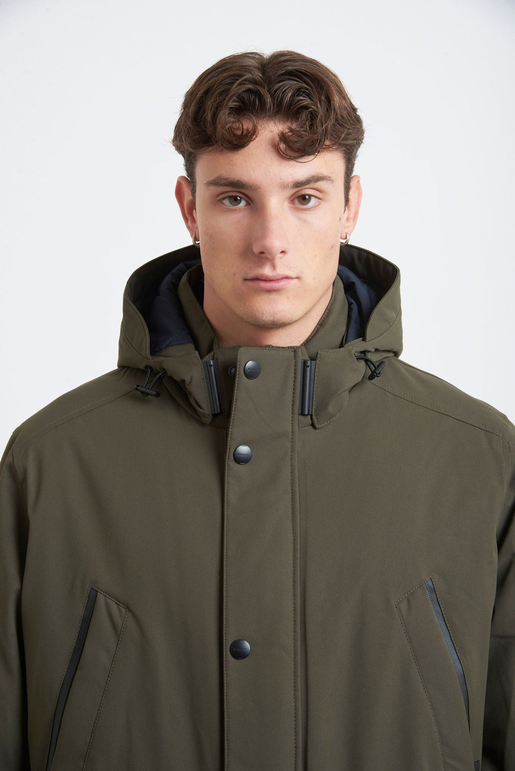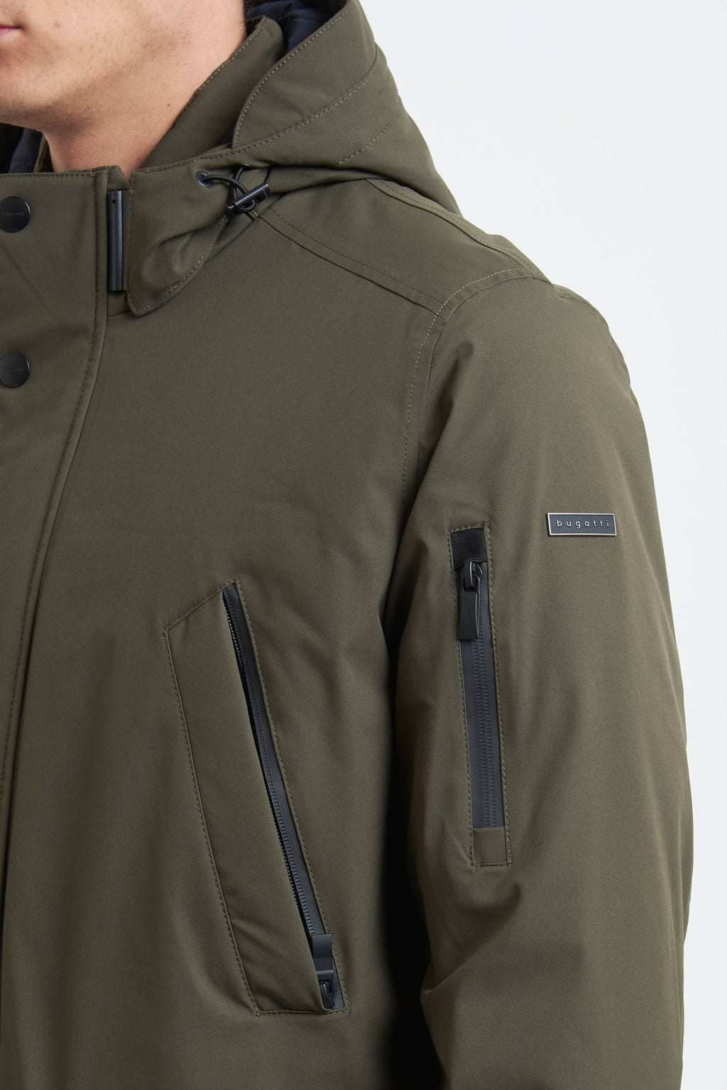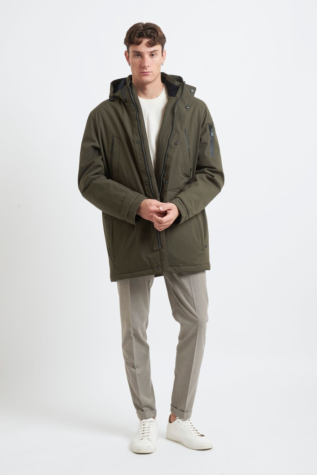 Water-repellent jacket, with zip fastening and concealed buttons, 4 pockets, 2 with zip on the chest and 2 at the bottom with flap and side zip, removable hood, adjustable sleeves