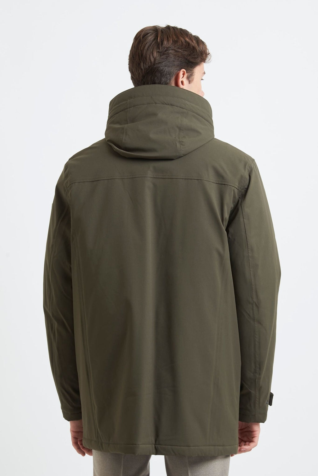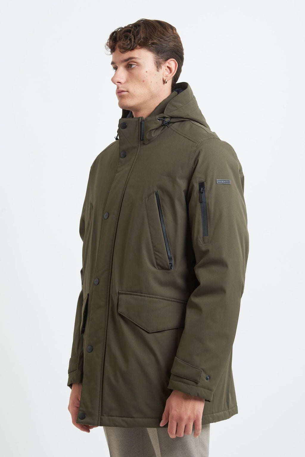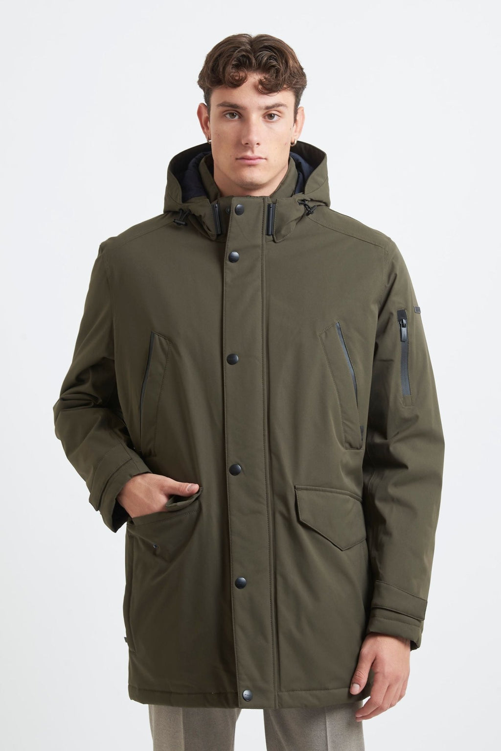 Water-repellent jacket, with zip fastening and concealed buttons, 4 pockets, 2 with zip on the chest and 2 at the bottom with flap and side zip, removable hood, adjustable sleeves