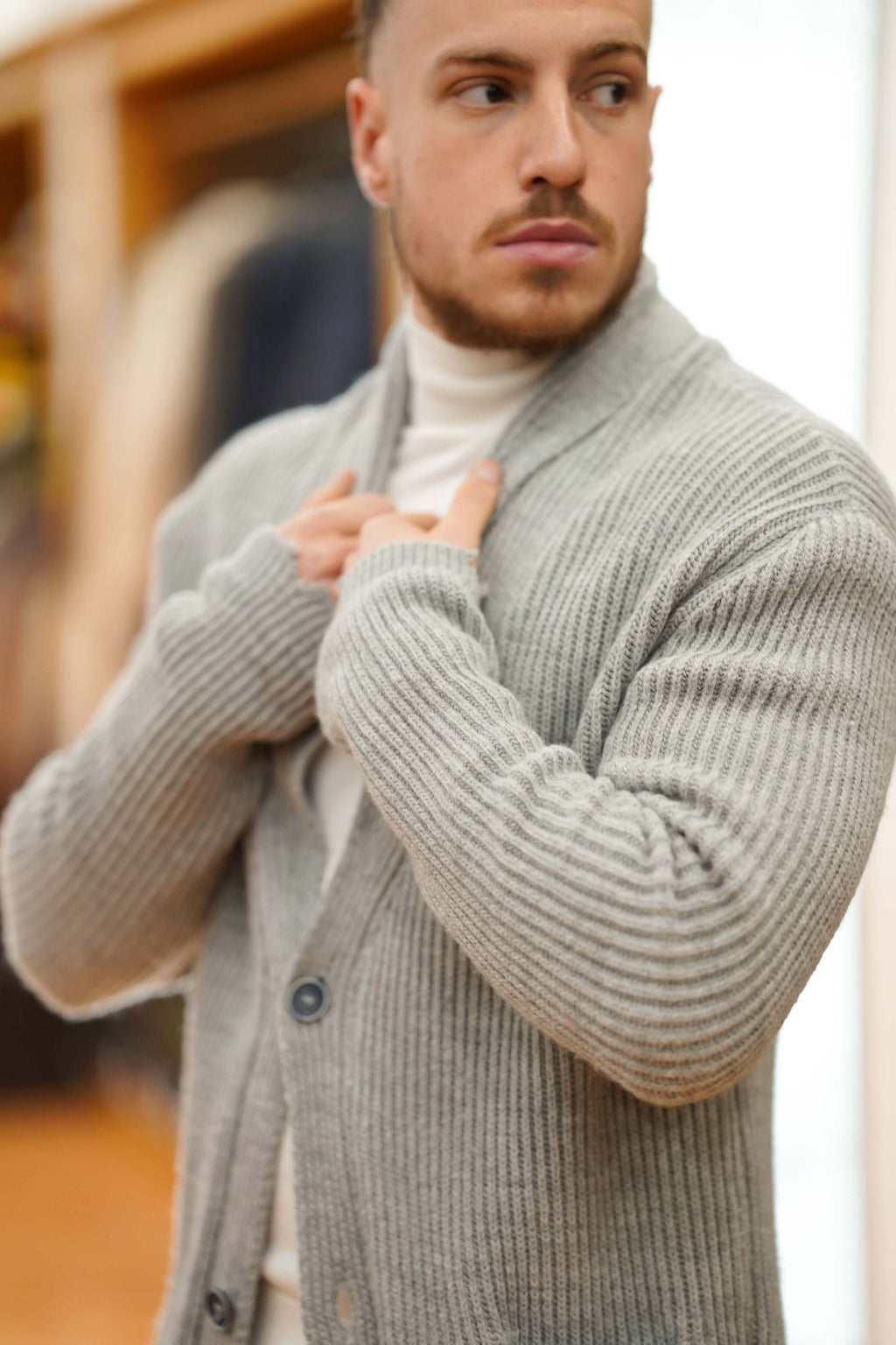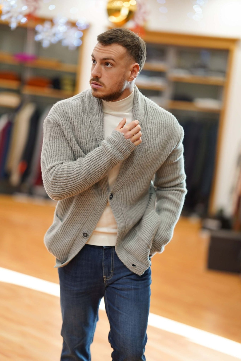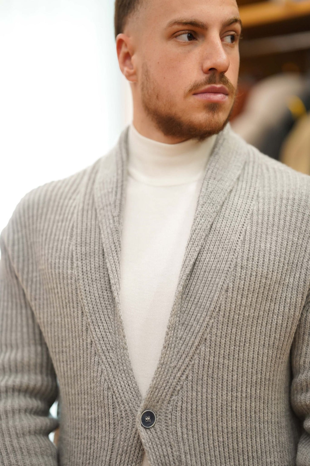 Design: Giacca in maglia con rever a scialle e due bottoni frontali