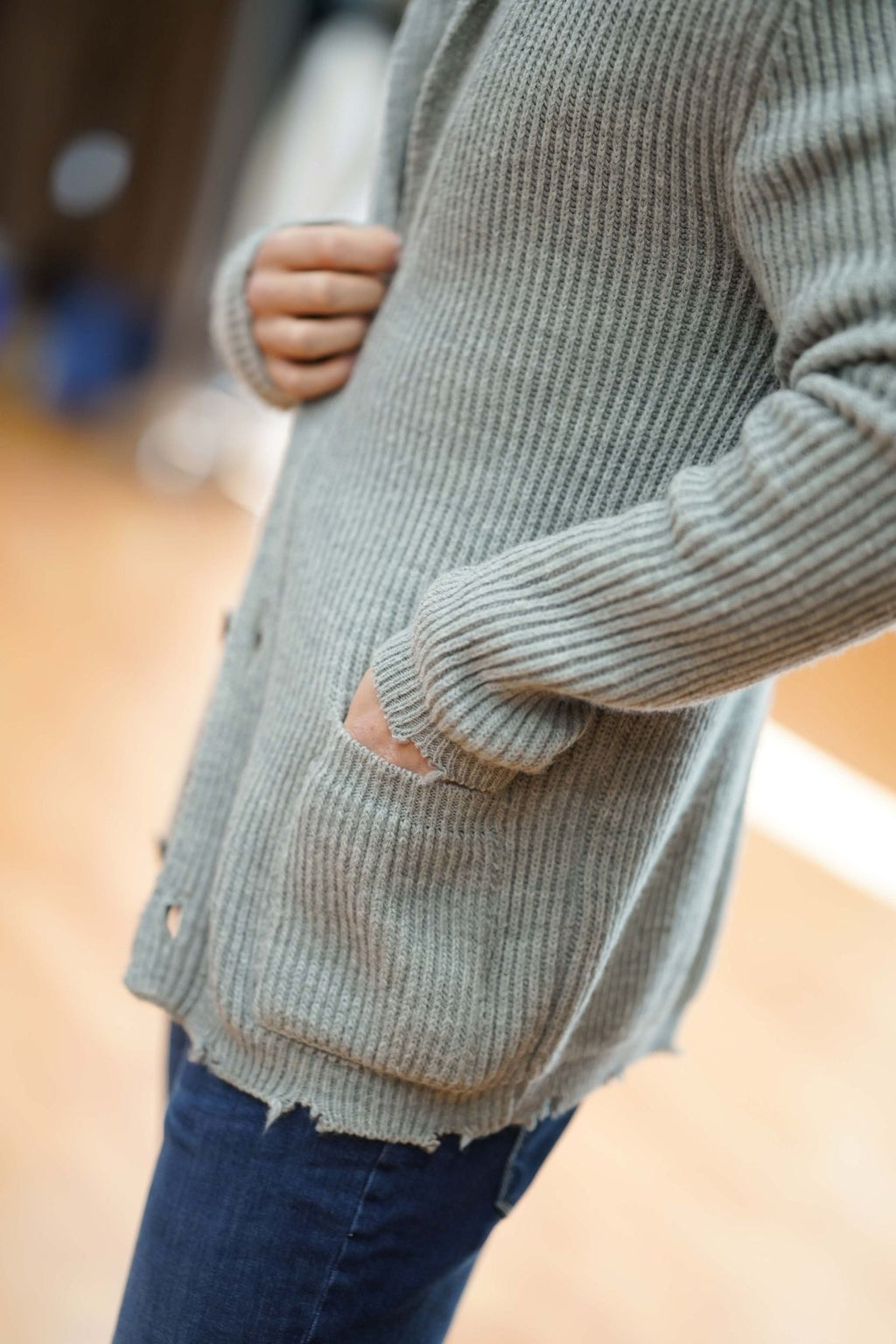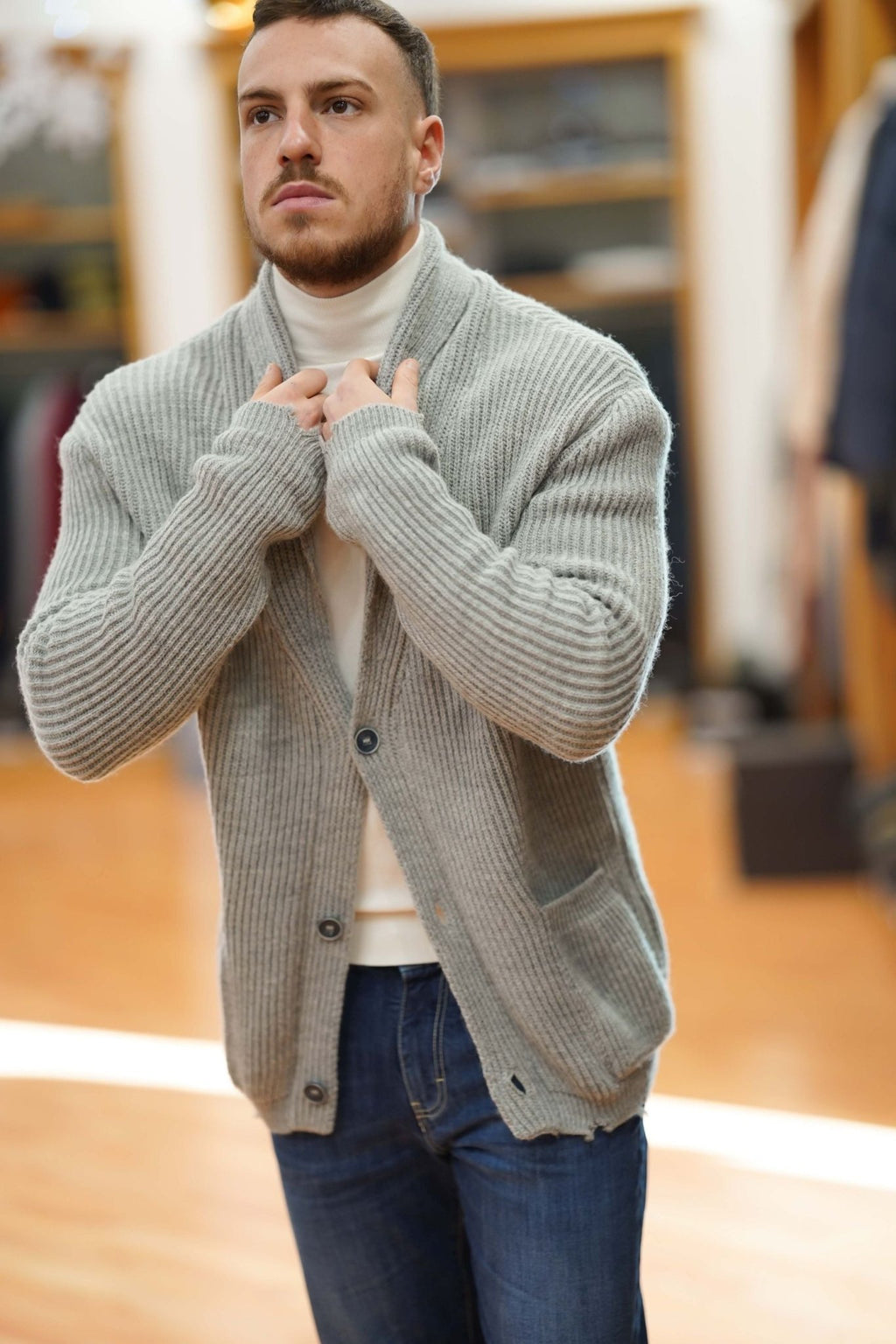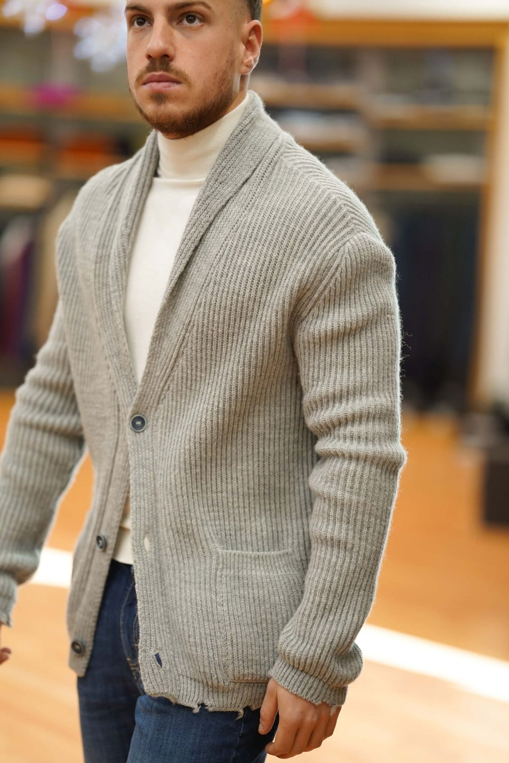 Moderna e di carattere, questa giacca da uomo in maglia è caratterizzata da rever a scialle, due bottoni frontali, due tasche a toppa e un effetto strappi sul fondo, perfetta per look casual contemporanei con un tocco grintoso.