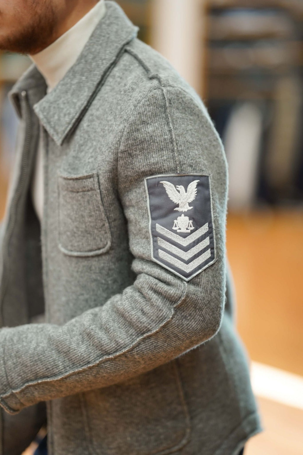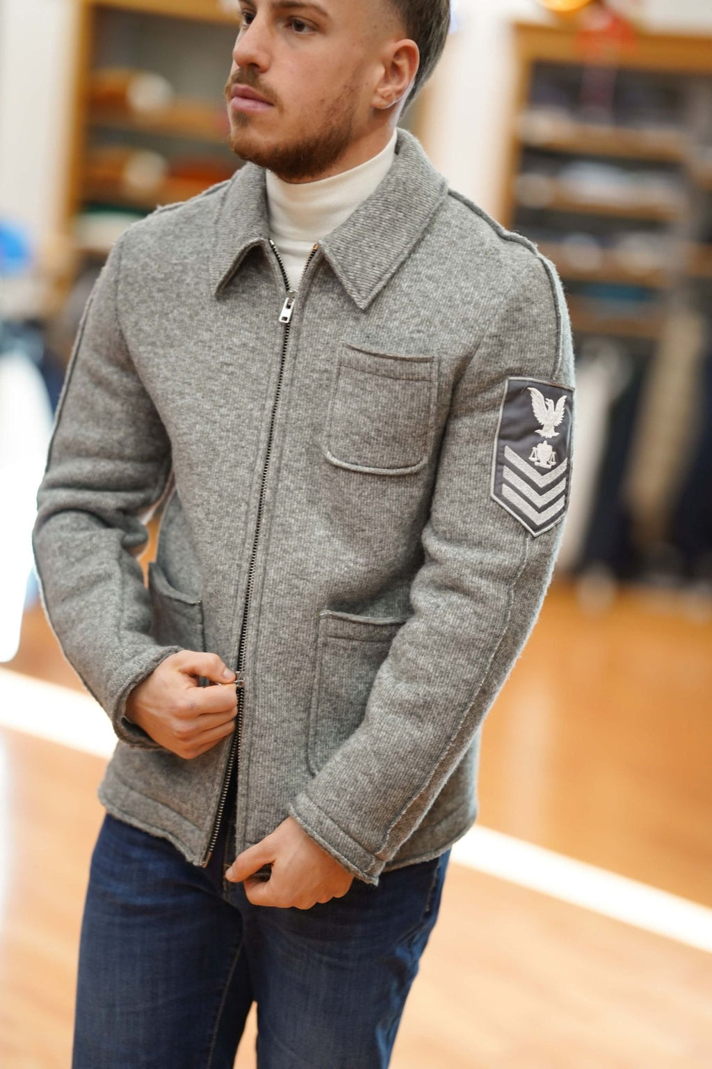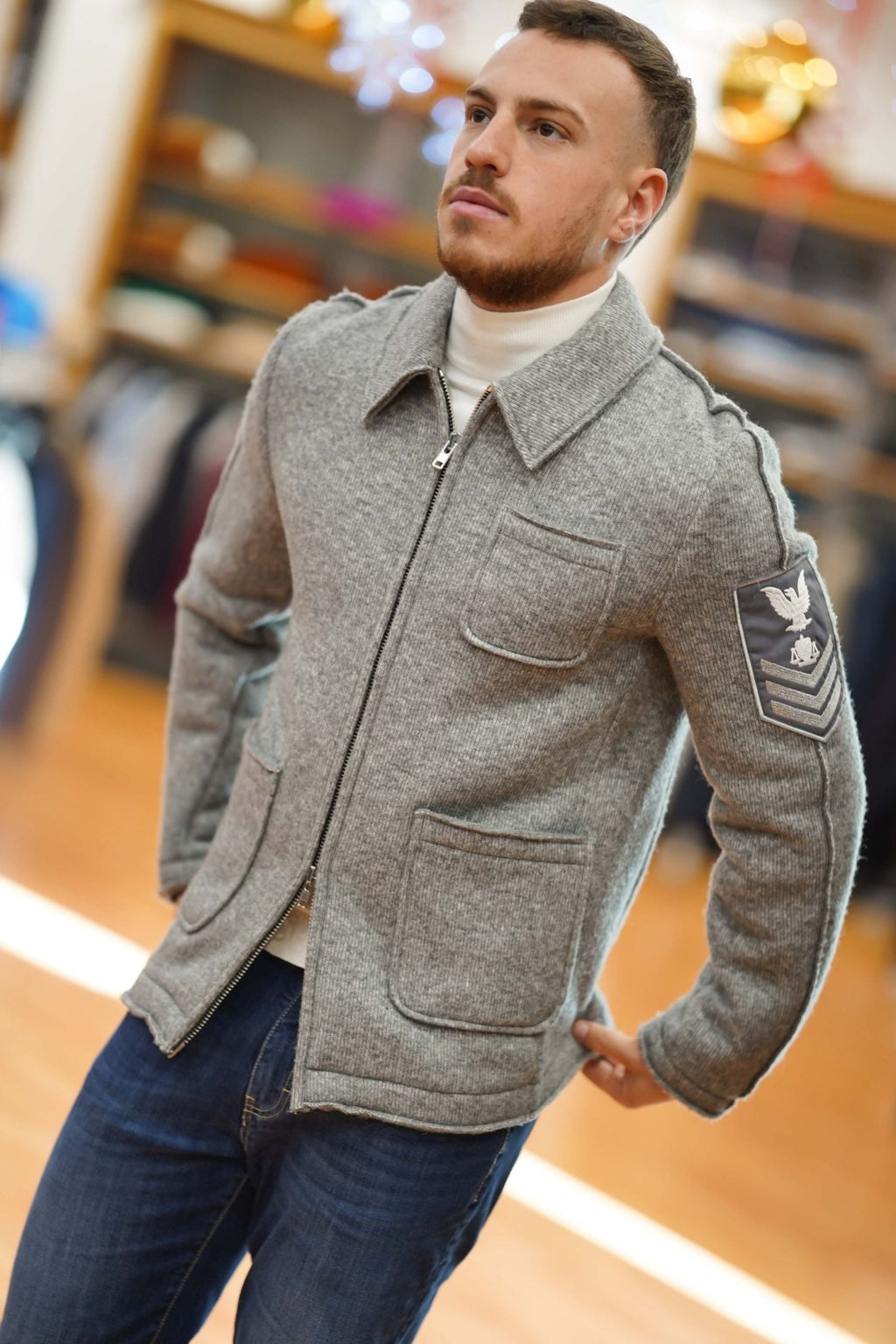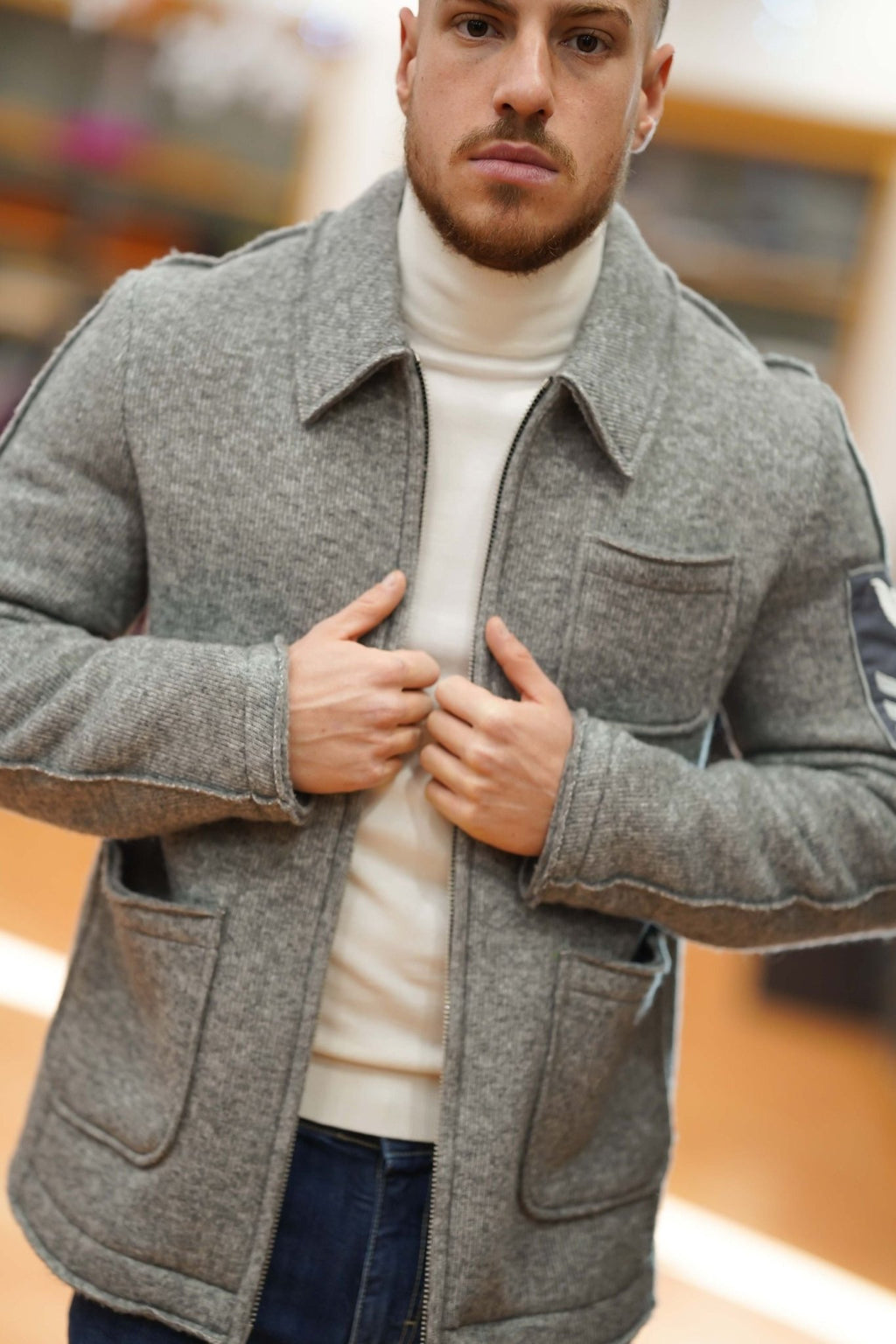Design: Giacca in maglia con collo loden e chiusura a cerniera