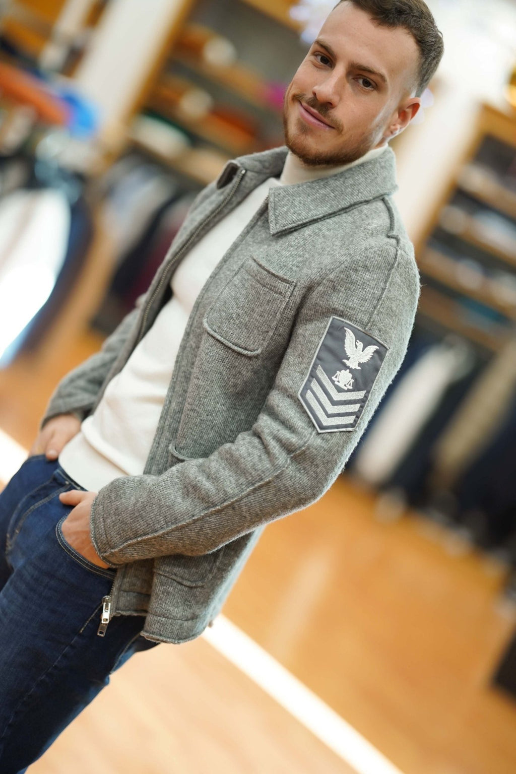 Moderna e funzionale, questa giacca da uomo in tessuto maglia è caratterizzata da collo modello loden, chiusura frontale con cerniera, due tasche a toppa e taschino sul petto, perfetta per look casual o layering su capi più leggeri.