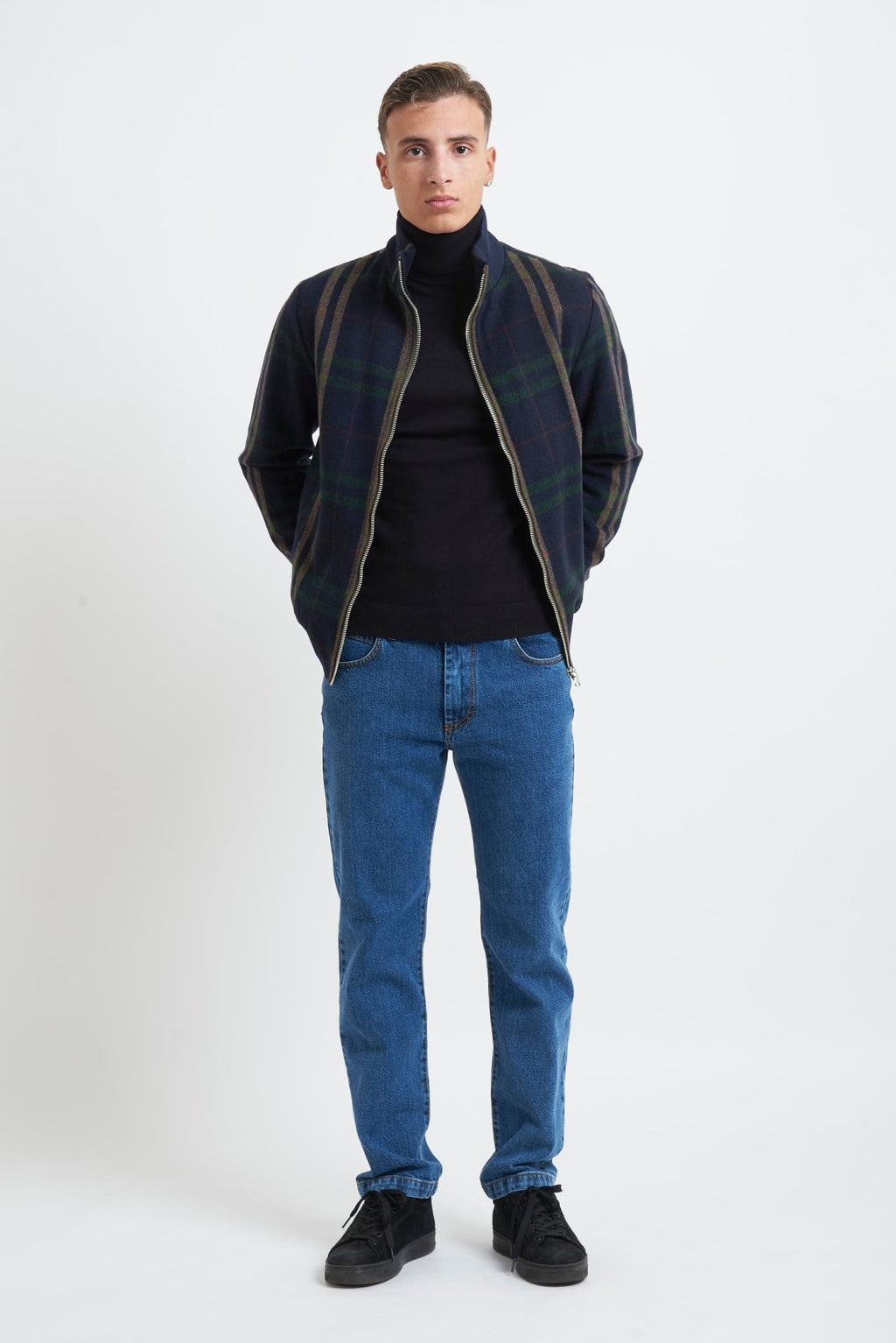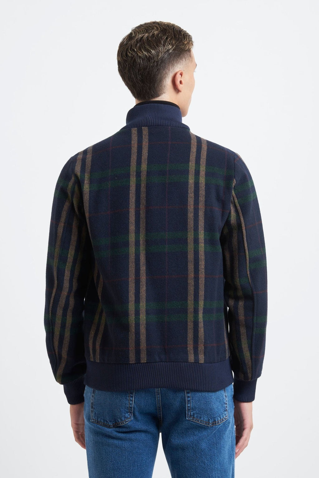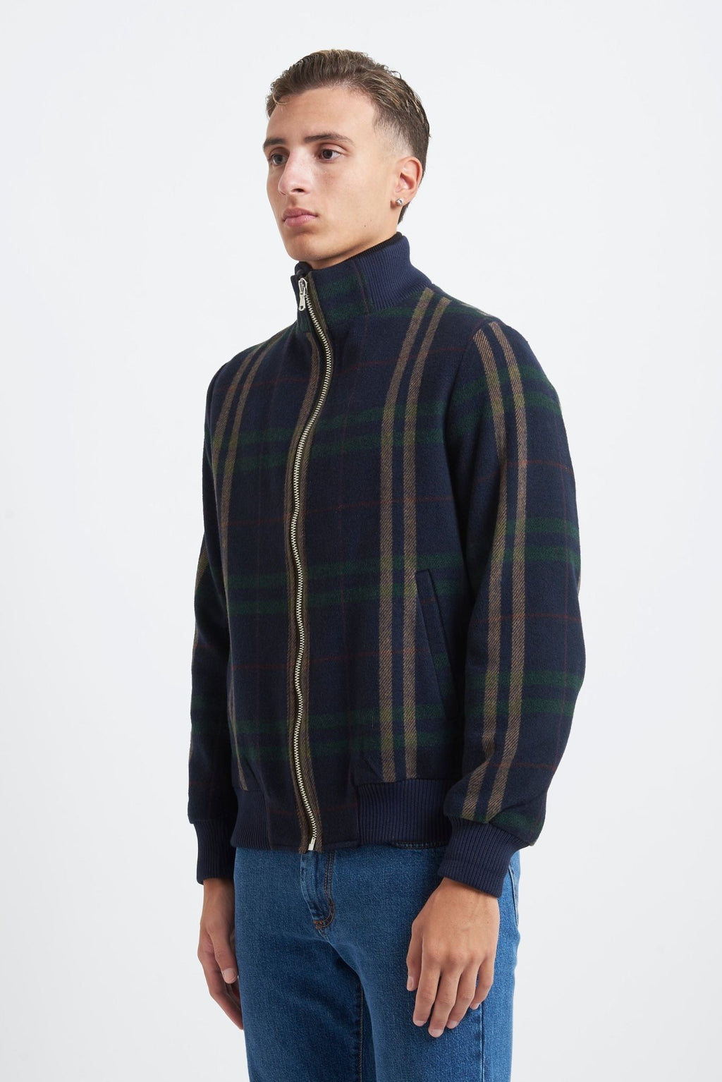 Checked bomber jacket with zip fastening, two front pockets, elasticated collar, cuffs and hem