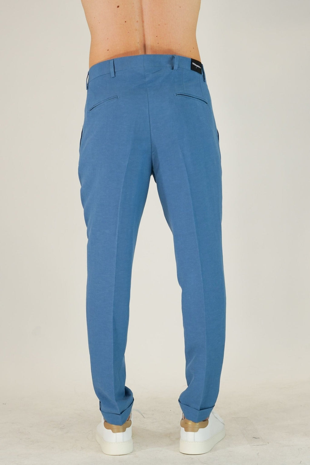 Pantalone con doppia pence , con tasca america, tasca a filo sul retro, abbottonatura con gancio e bottone, con risvoltino cucito di 3 cm