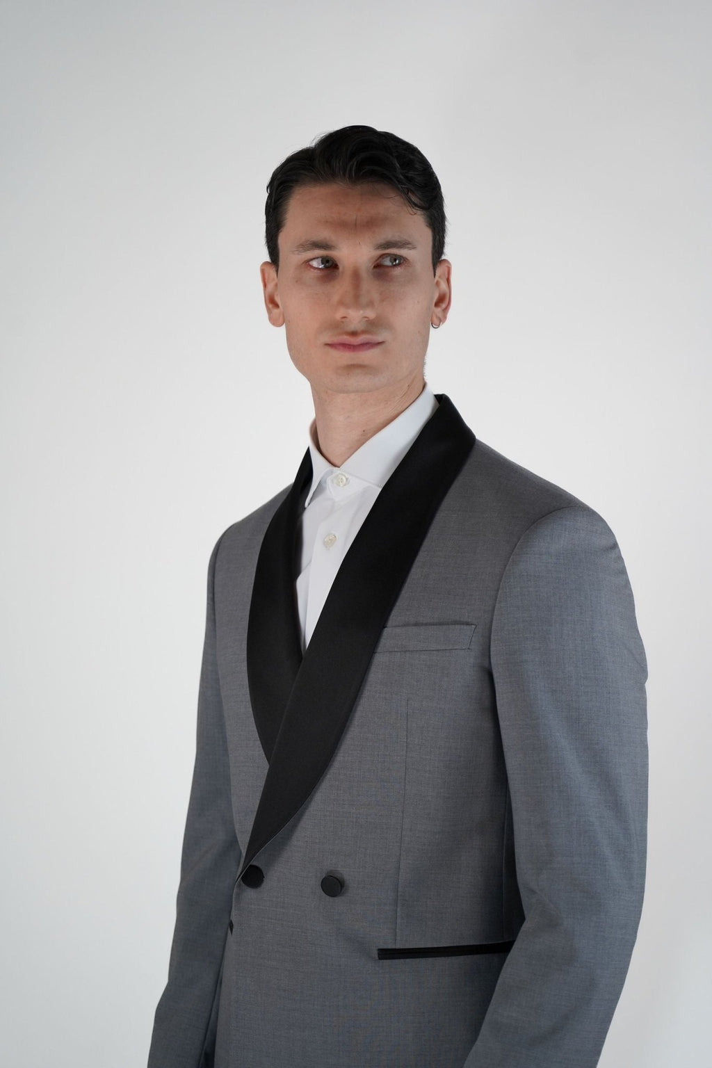 Abito doppiopetto foderato drop 8 con rever sciallato in raso . Giacca: chiusura due bottoni ricoperti, due tasche a filo in raso in contrasto e un taschino frontali, due spacchi laterali sul retro, quattro bottoni ricoperti ai polsi. Pantalone: slim fit, due tasche america frontali e due a filo sul retro con bottoncino, passanti in vita, chiusura con zip, gancio e bottone.