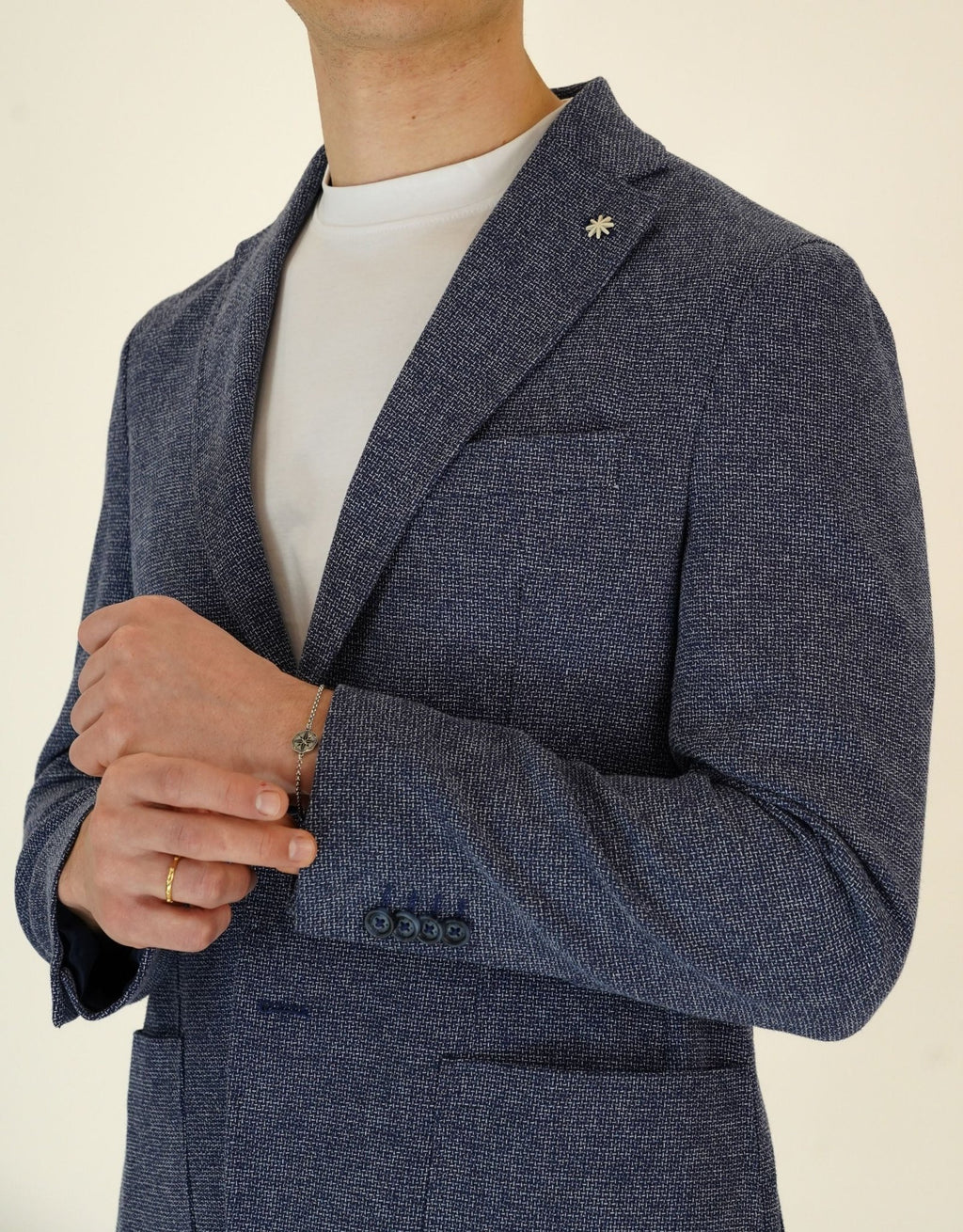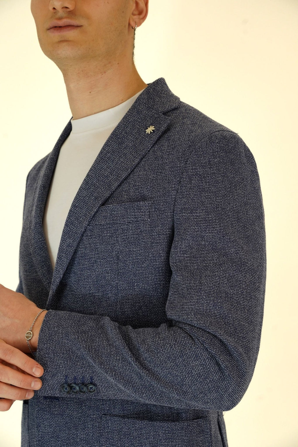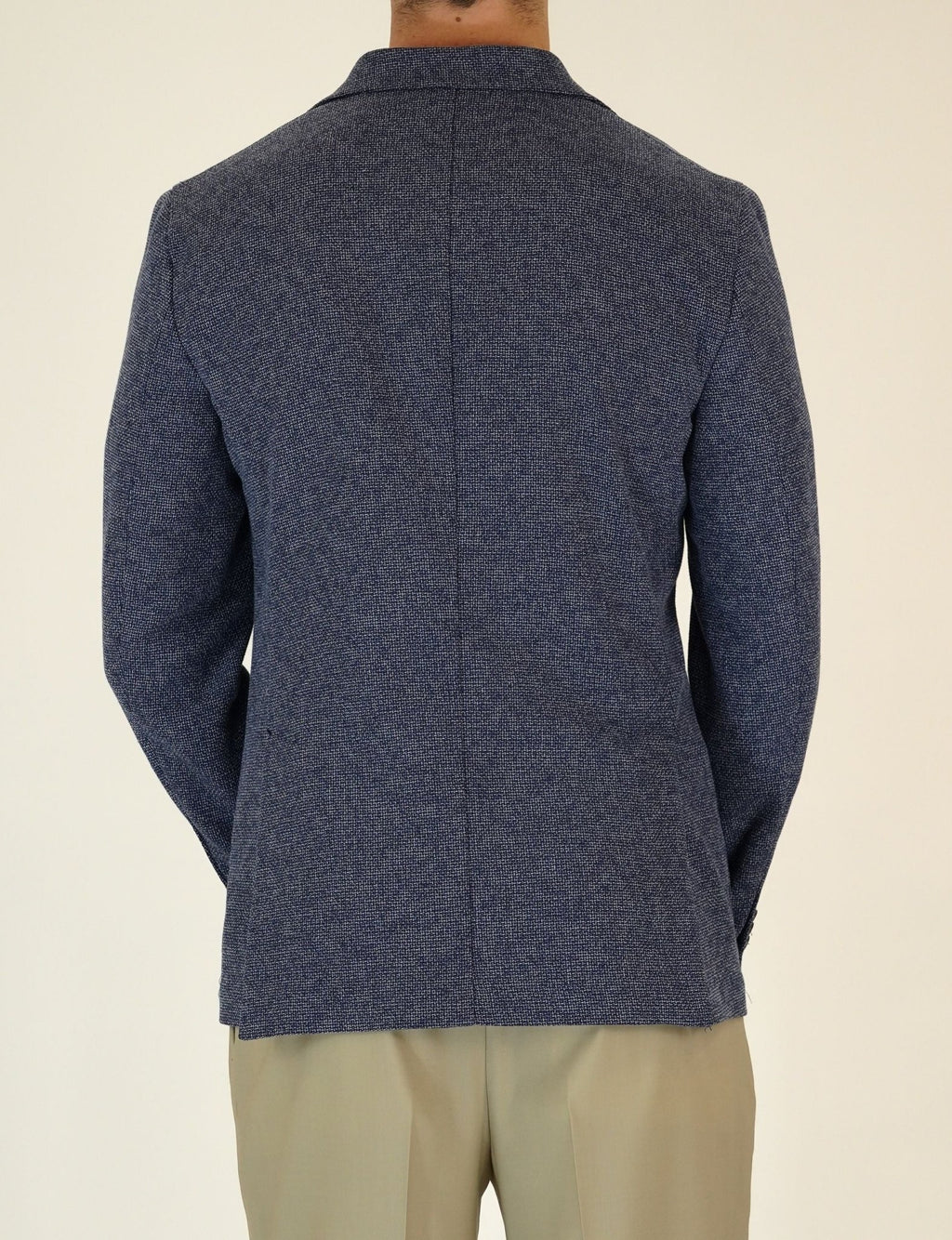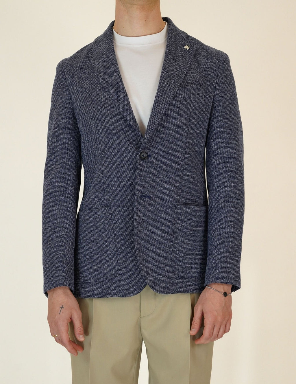 Giacca sfoderata, chiusura due bottoni, due tasche a toppa e un taschino frontali, due spacchi sul retro, quattro bottoni ai polsi, finiture con impunture.
