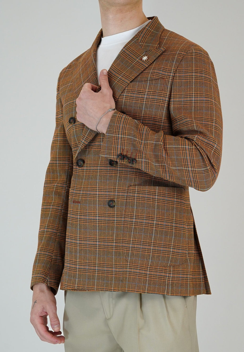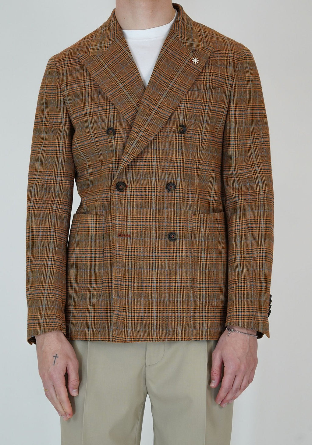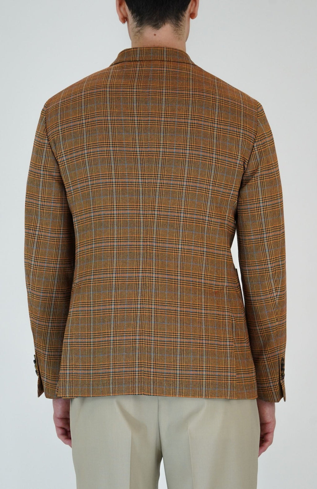 Giacca NUVOLA doppiopetto sfoderata, rever a lancia, due tasche a toppa e un taschino frontali, due spacchi sul retro, quattro bottoni ai polsi, finiture con impunture. Galles in misto cotone stretch