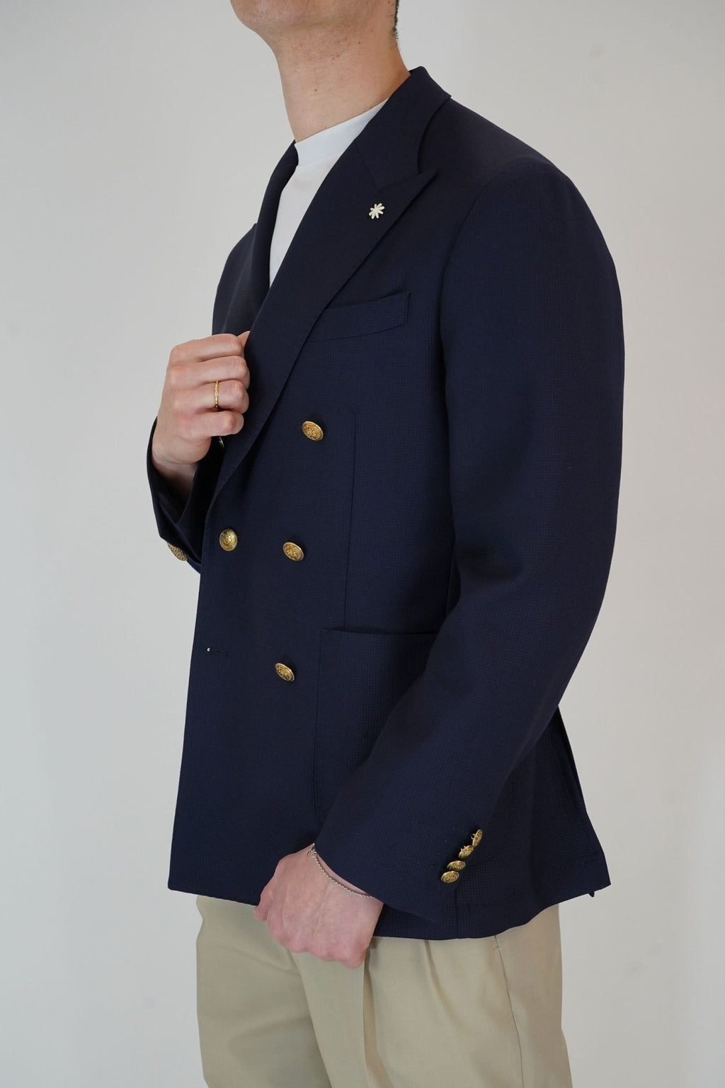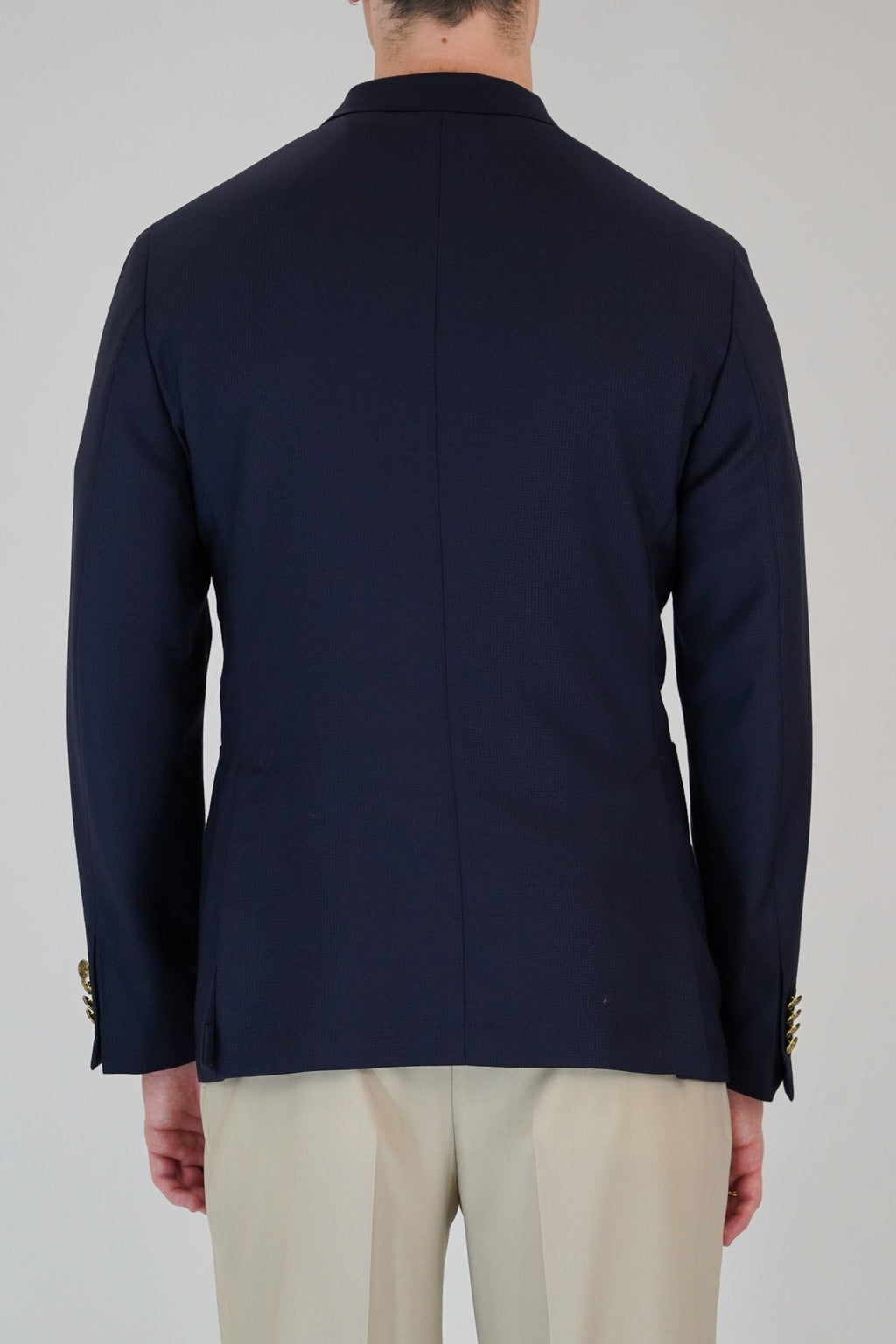Giacca sfoderata doppiopetto, bottoni oro, ampio rever a lancia, chiusura sei bottoni, due tasche a toppa e un taschino frontali, due spacchi sul retro, quattro bottoni ai polsi, finiture con impunture A.M.F.