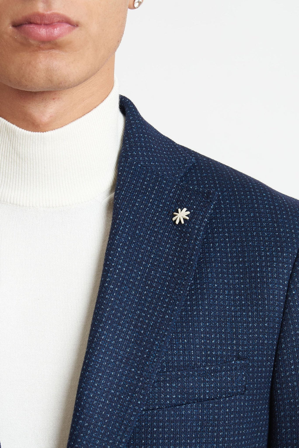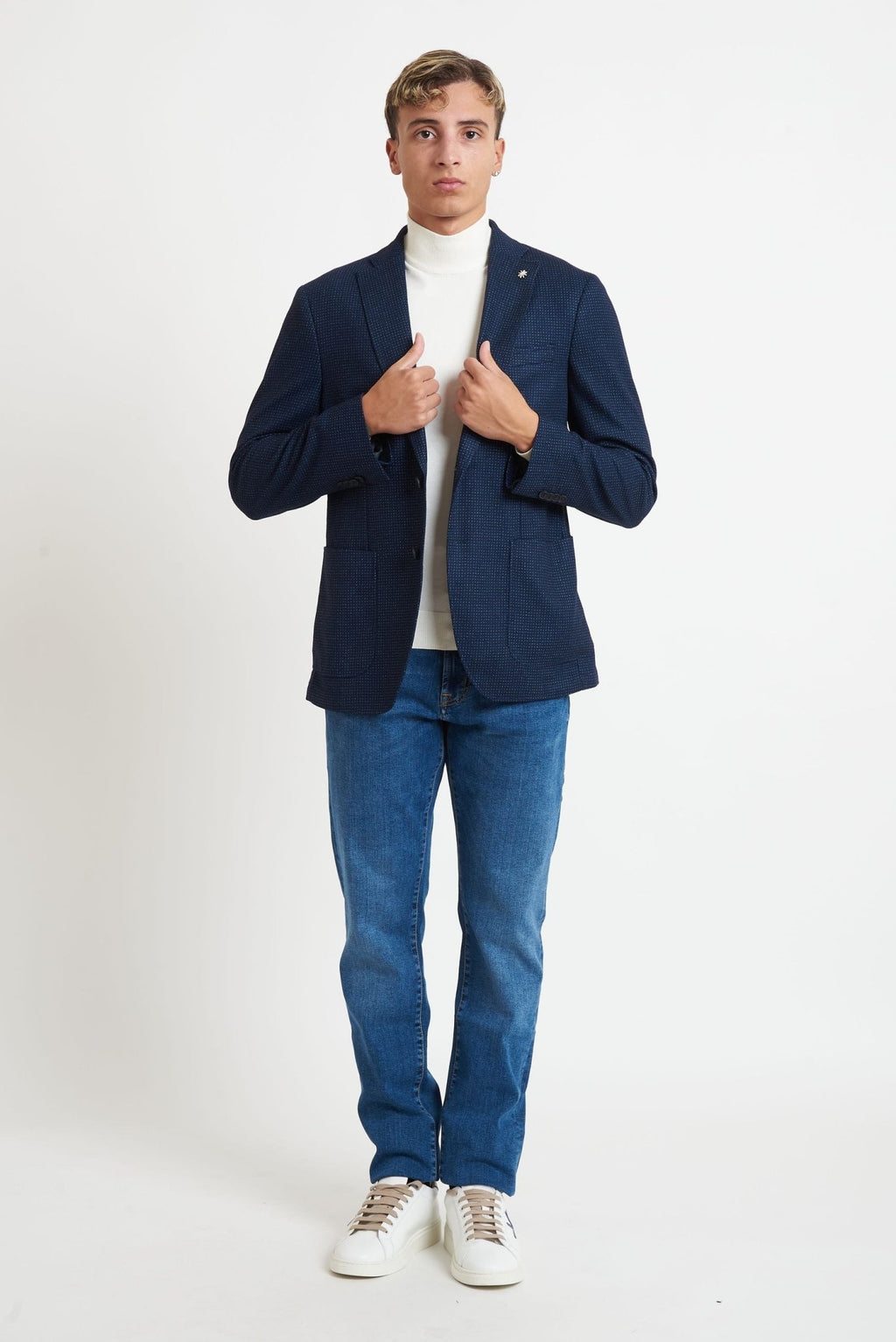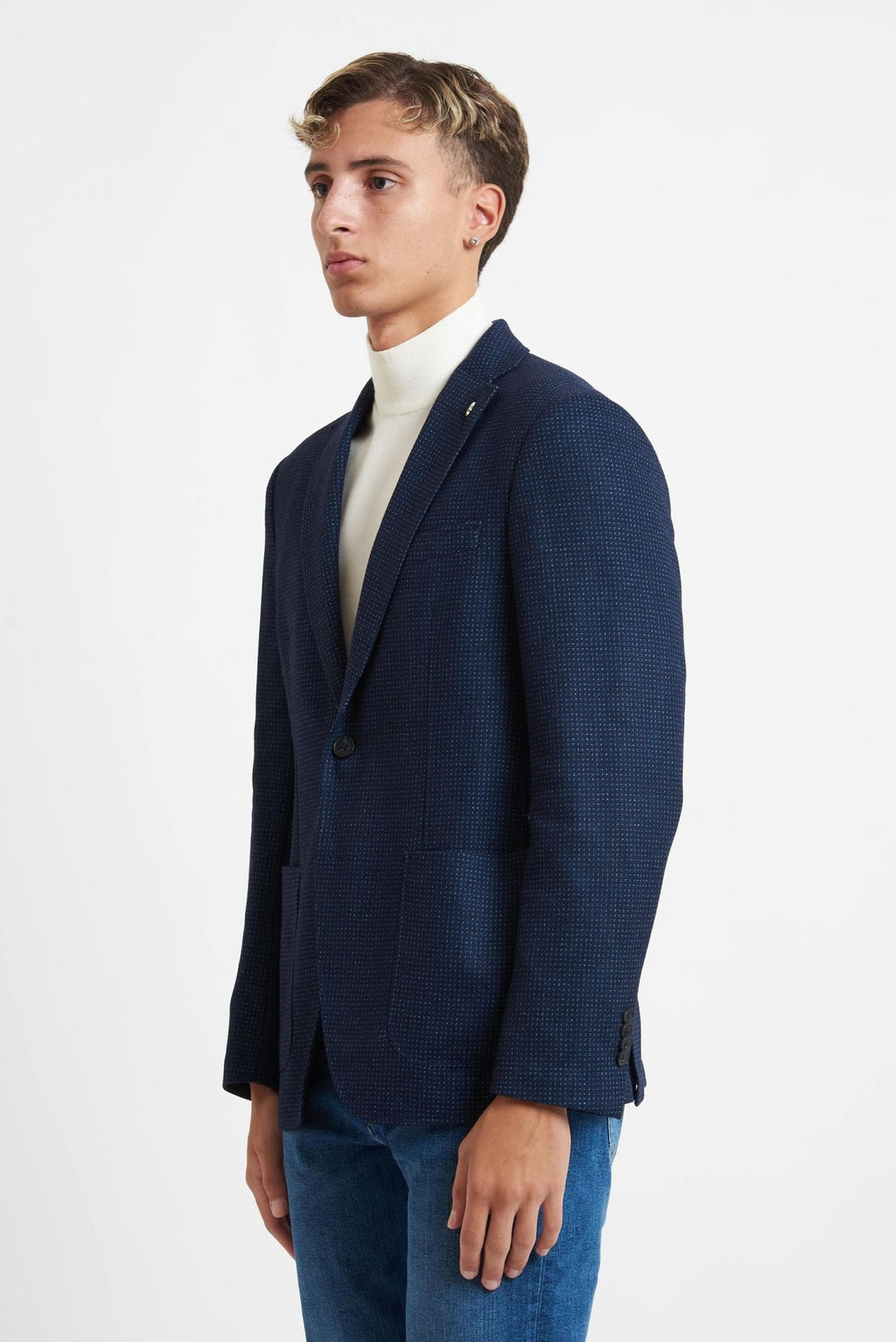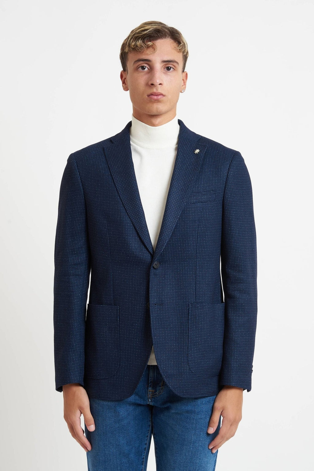 Realizzata in tessuto piquet in misto cotone stretch (36% poliammide, 33% poliestere, 31% viscosa), questa giacca offre leggerezza, comfort ed elasticità, ideale per look formali, smart casual o outfit quotidiani.