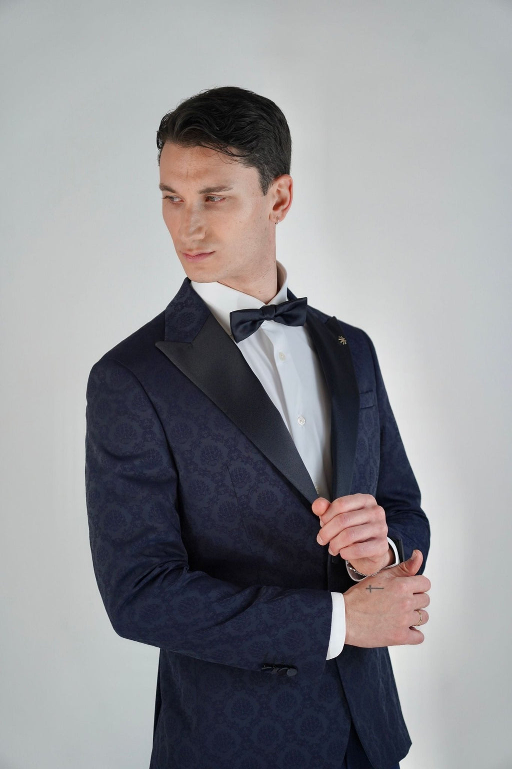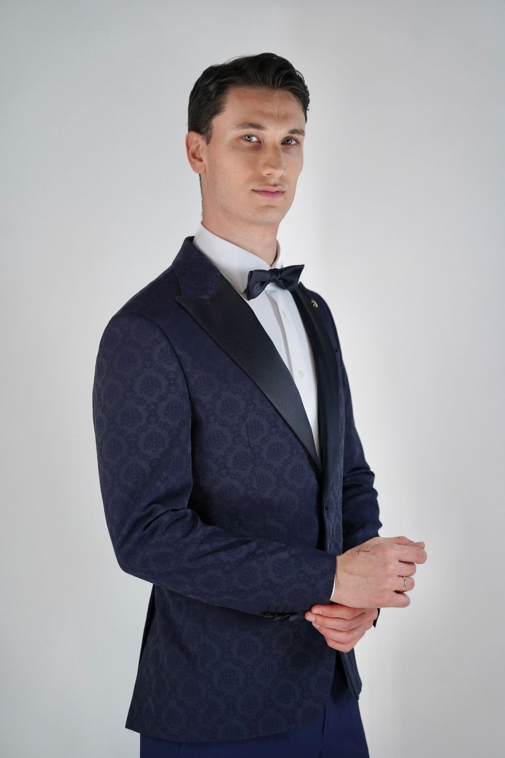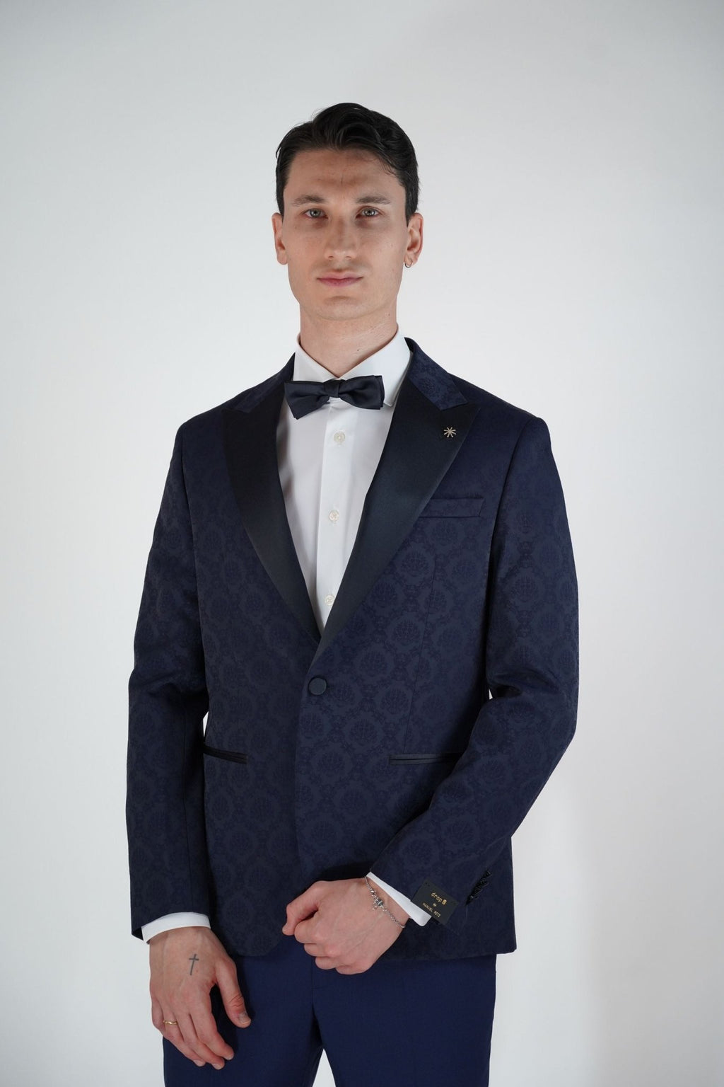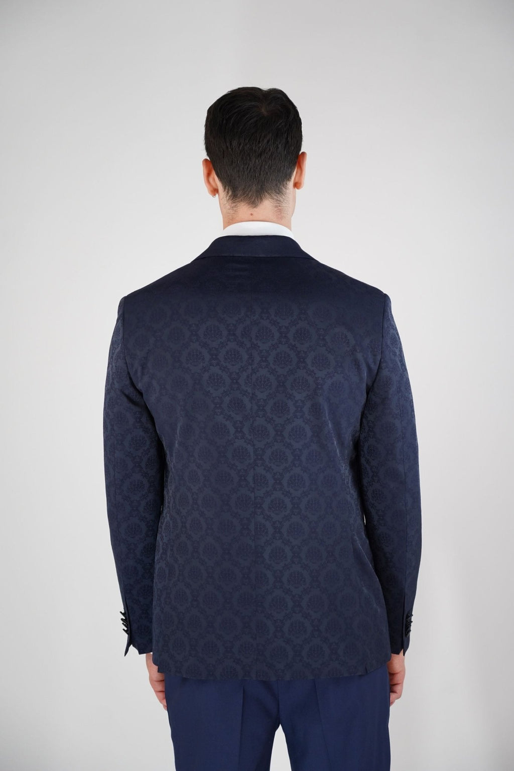 Giacca Smoking drop 8 foderata, con fantasia stilizzata, ampio rever a lancia, chiusura un botton, due tasche a filo e un taschino frontali, due spacchi sul retro, quattro bottoni ai polsi, lunghezza 72 cm.
