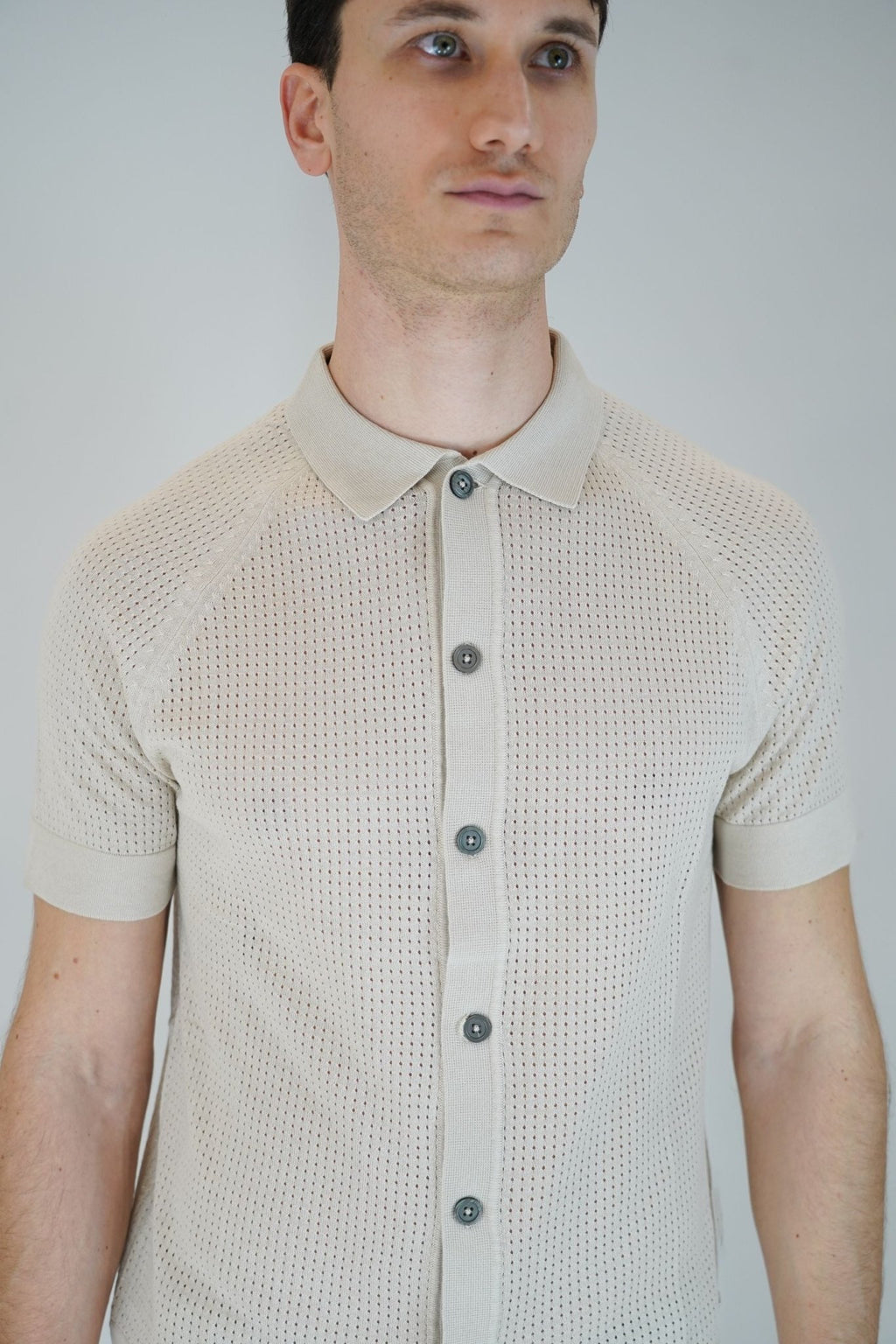 Polo cardigan in maglia manica corta con bottoni madre perla traforata.