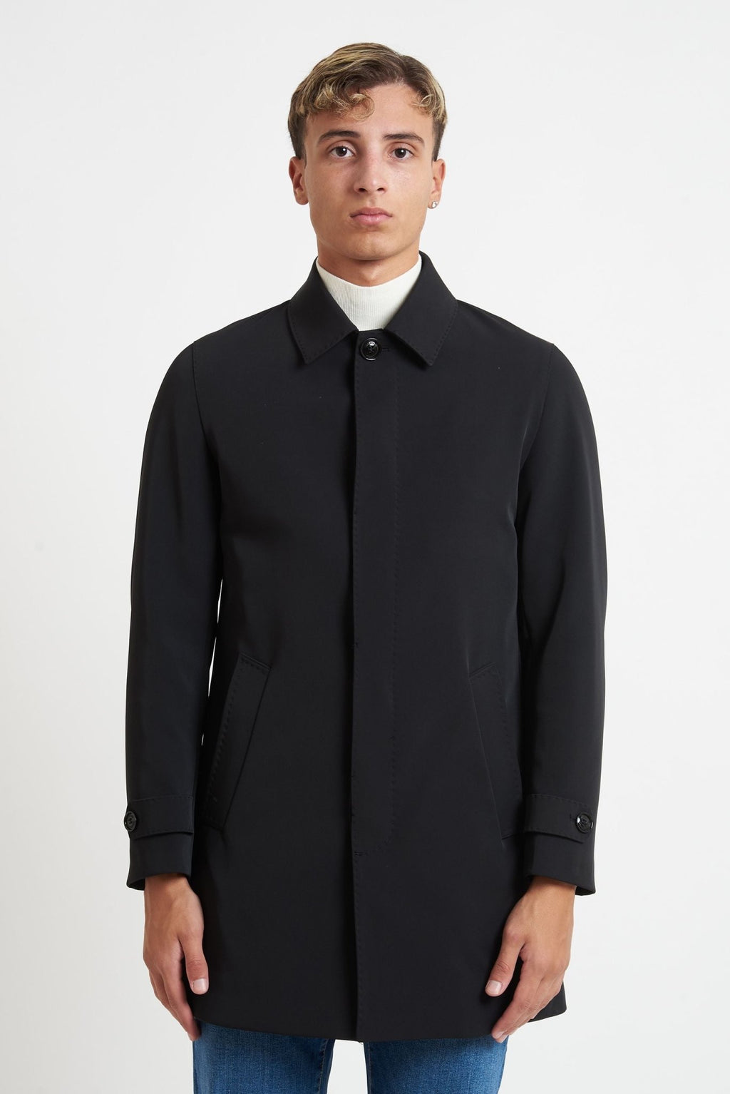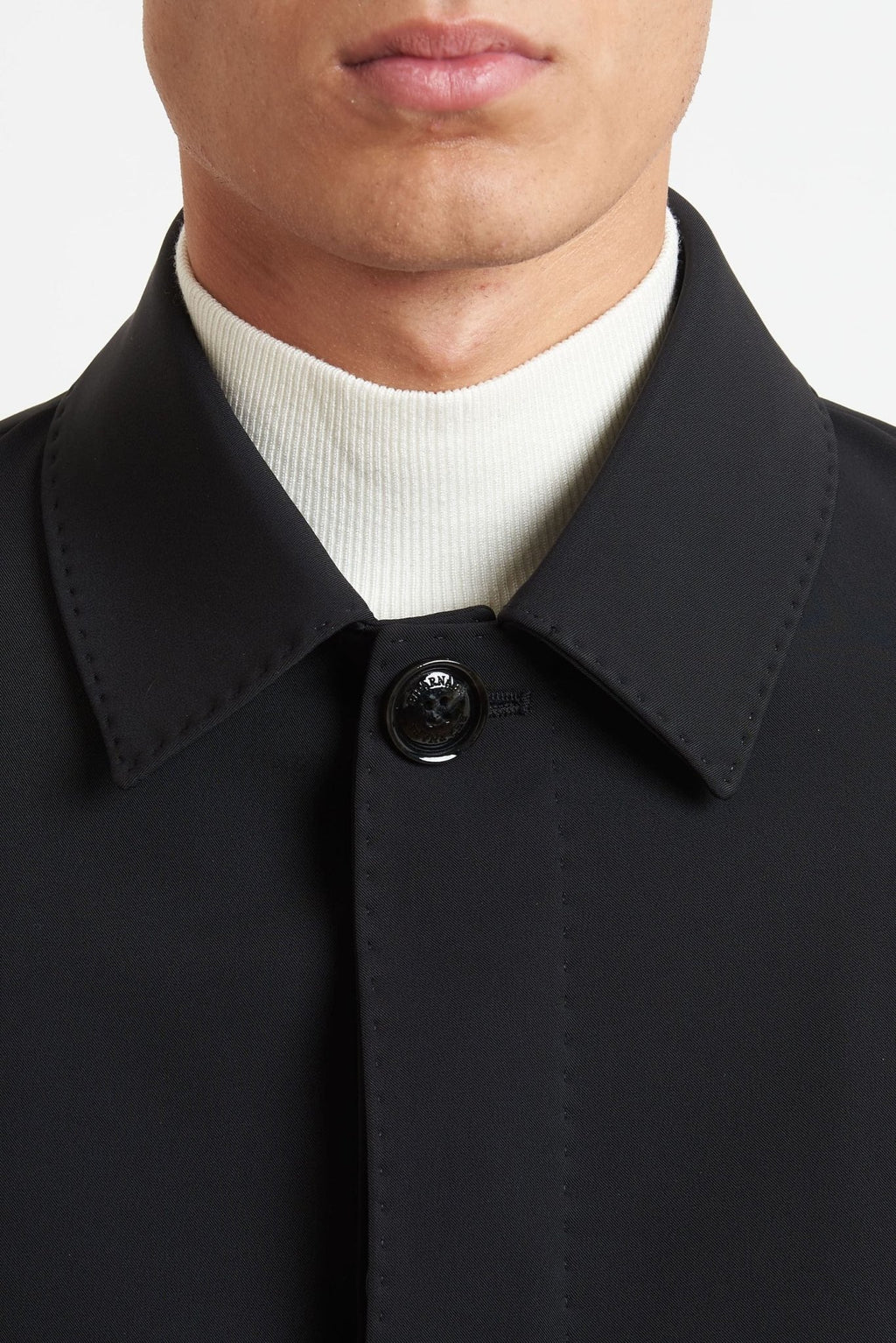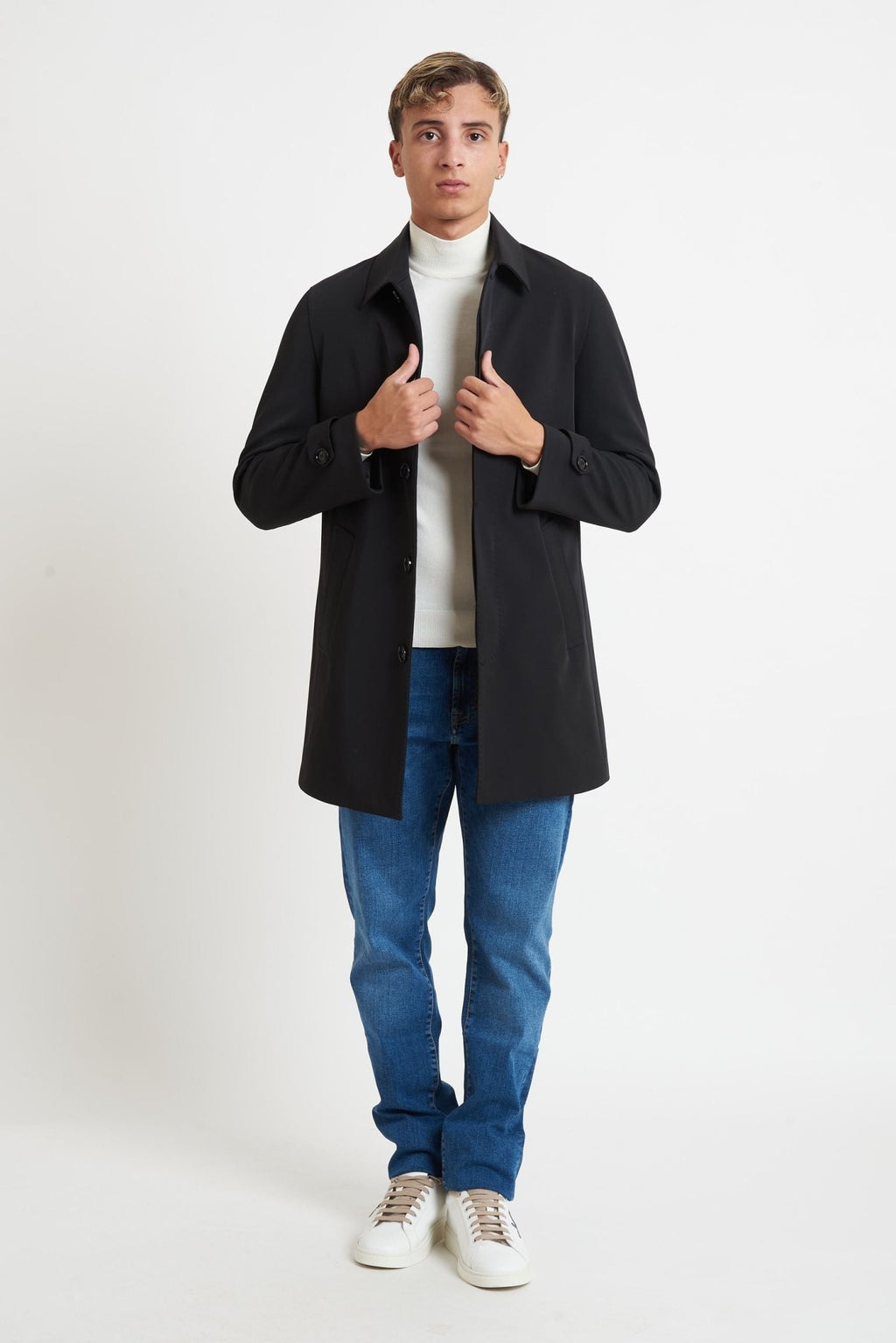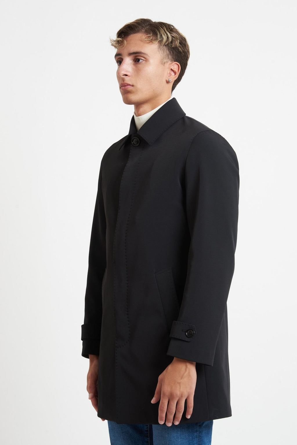 Eleganza e funzionalità si incontrano in questo trench da uomo impermeabile, caratterizzato da cuciture impunturate per un look raffinato e resistente alle intemperie. La chiusura con bottoni ricoperti e le tasche a filo verticali completano il design minimal e moderno, perfetto per outfit formali o smart casual.