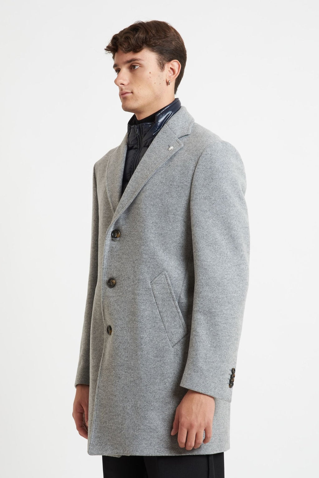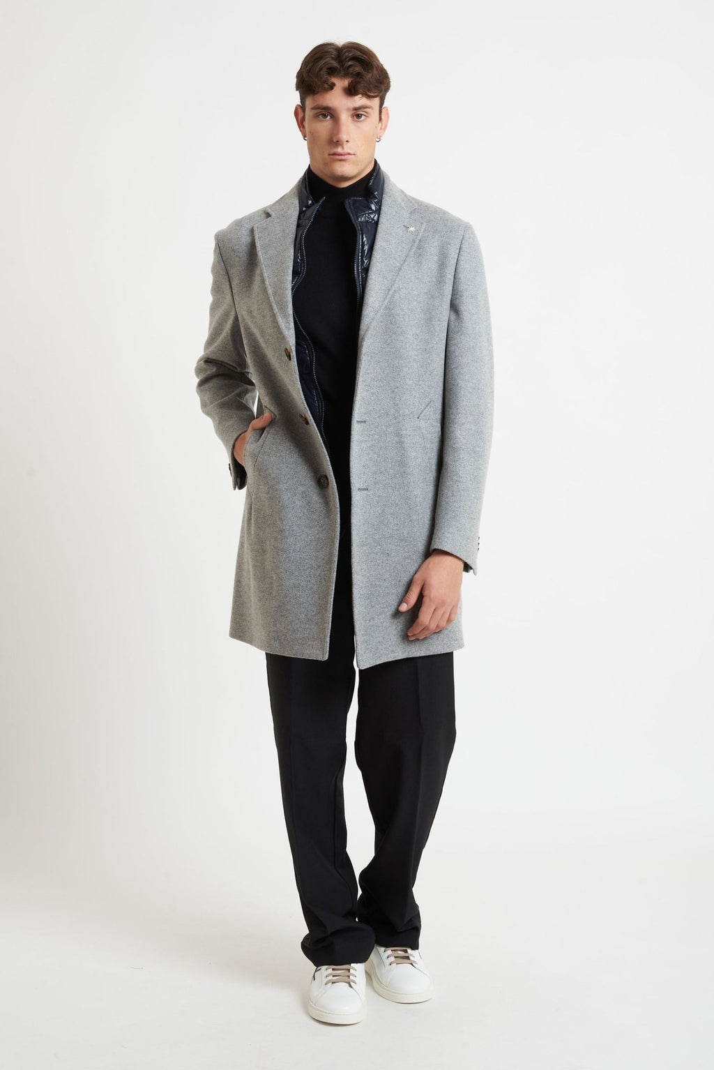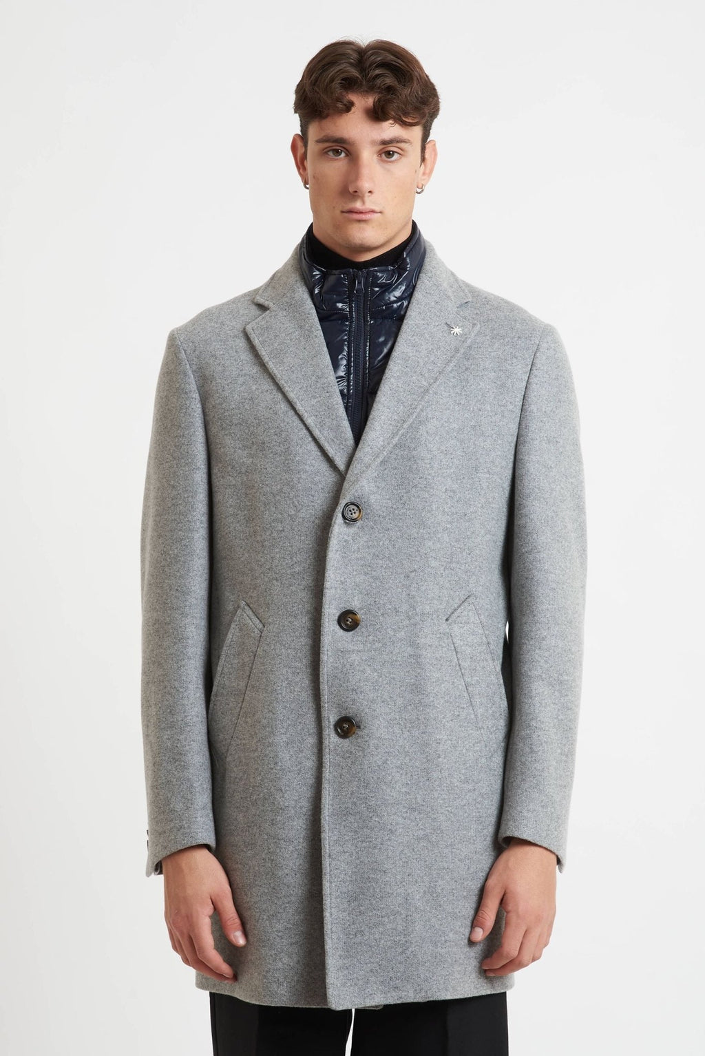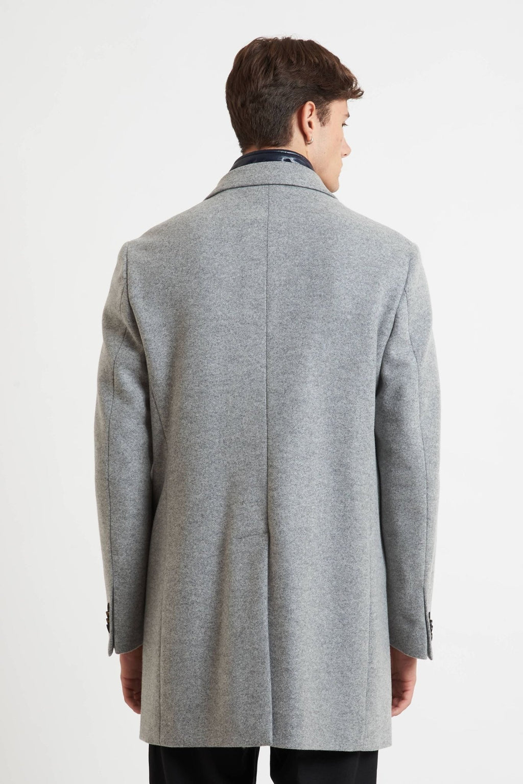 Elegante e versatile, questo cappottino monopetto da uomo è realizzato in un pregiato tessuto misto poliestere, acetato e lana, ideale per la stagione fredda. Il design classico grigio è impreziosito da una pettorina interna removibile blu notte, che aggiunge un tocco contemporaneo e garantisce maggiore protezione dal freddo. Dotato di rever classico, chiusura con bottoni, spacco singolo sul retro e due tasche frontali, unisce stile e funzionalità in un capo impeccabile.