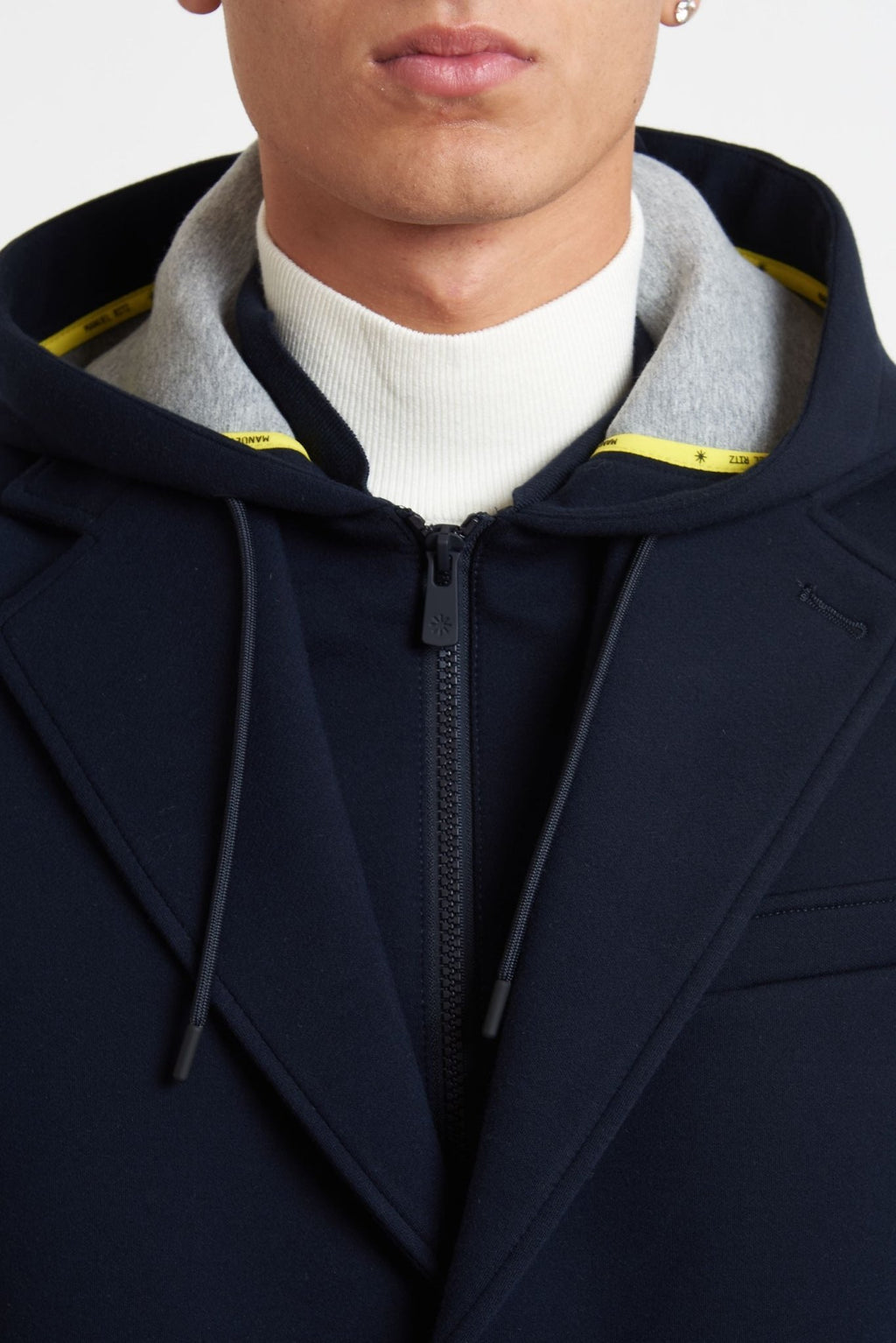 Realizzato in diagonale in jersey accoppiato con neoprene (83% cotone, 10% poliammide, 7% elastan), questo cappotto unisce morbidezza, resistenza e una vestibilità moderna, perfetto per outfit casual e smart casual.