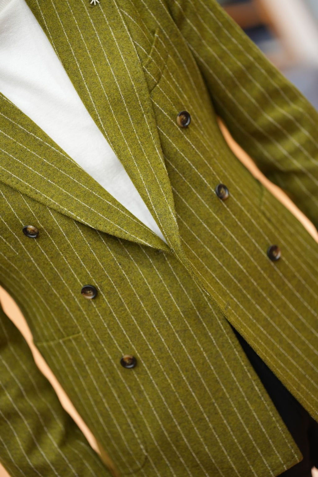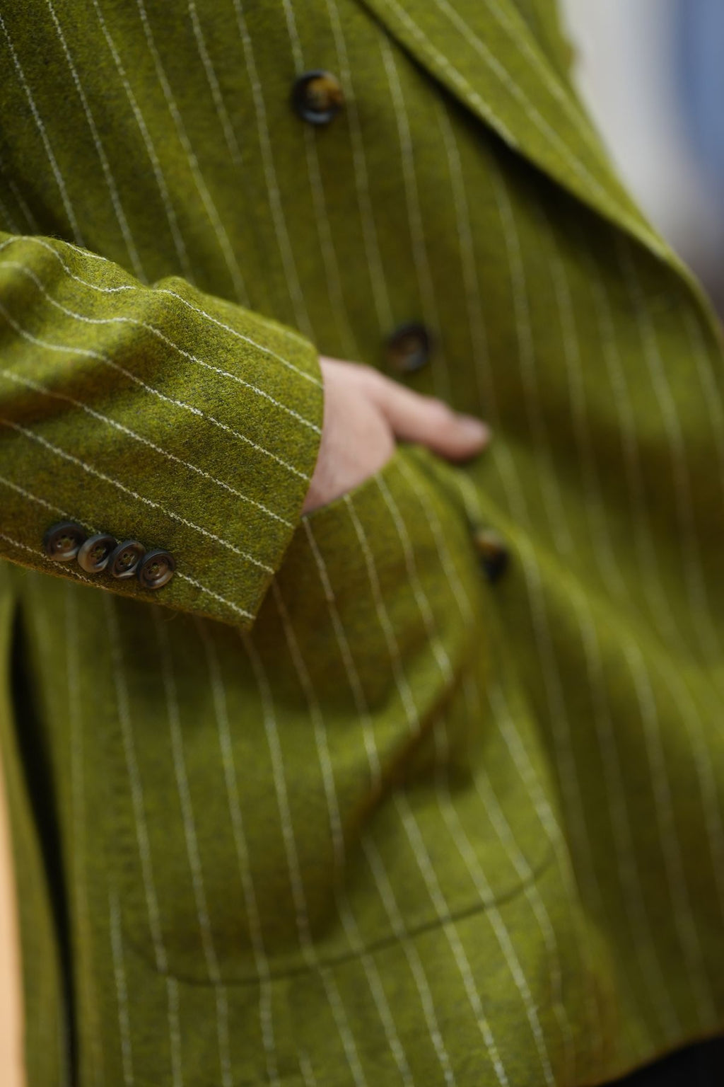 Design: Giacca doppiopetto gessata con rever a lancia e sei bottoni frontali
