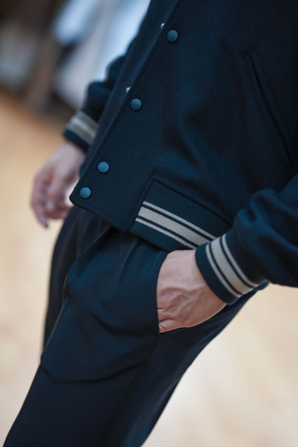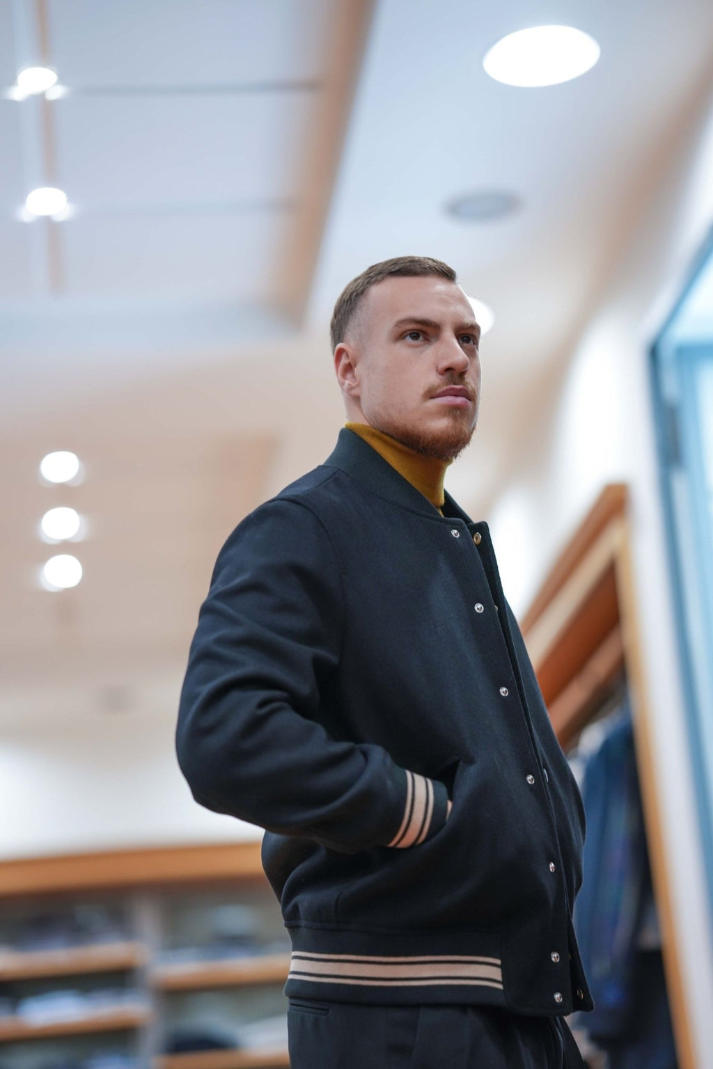 Moderno e dinamico, questo giubbino bomber combina stile sportivo e raffinatezza urbana.Realizzato in un pregiato tessuto misto lana e poliestere, offre calore, comfort e una vestibilità impeccabile.