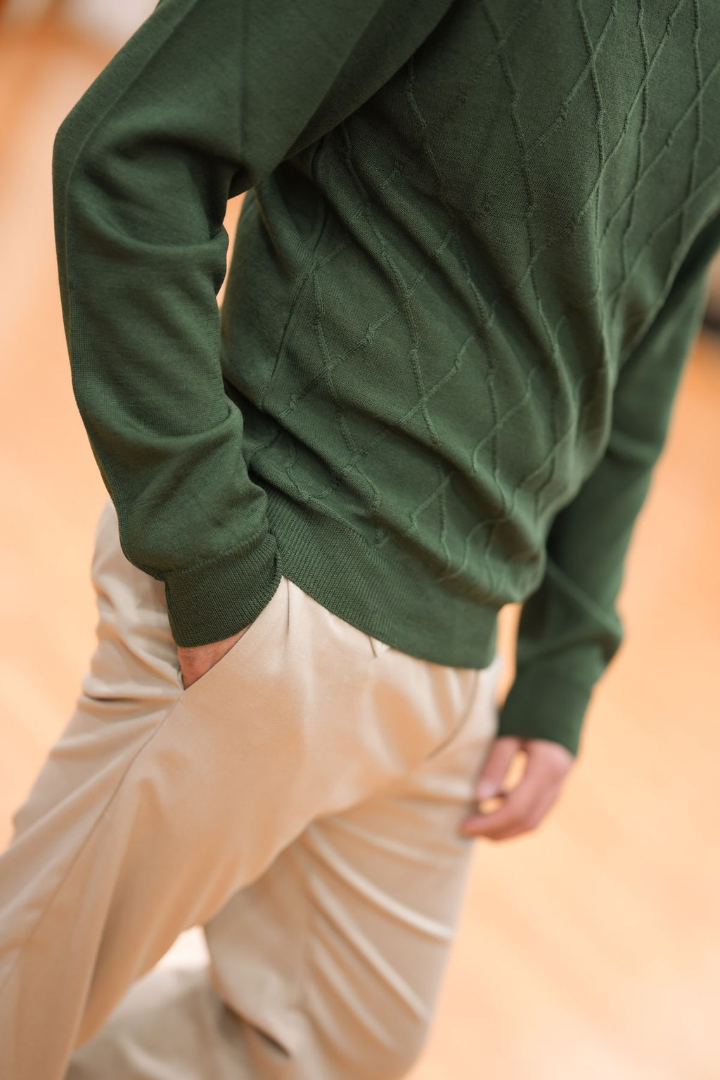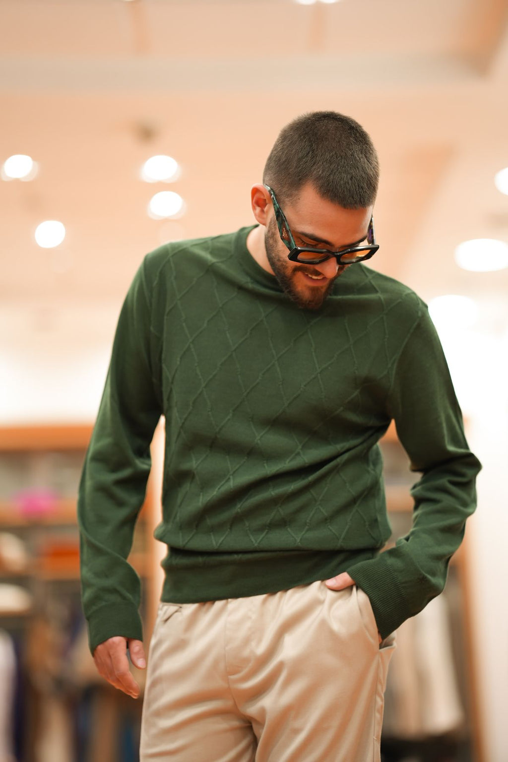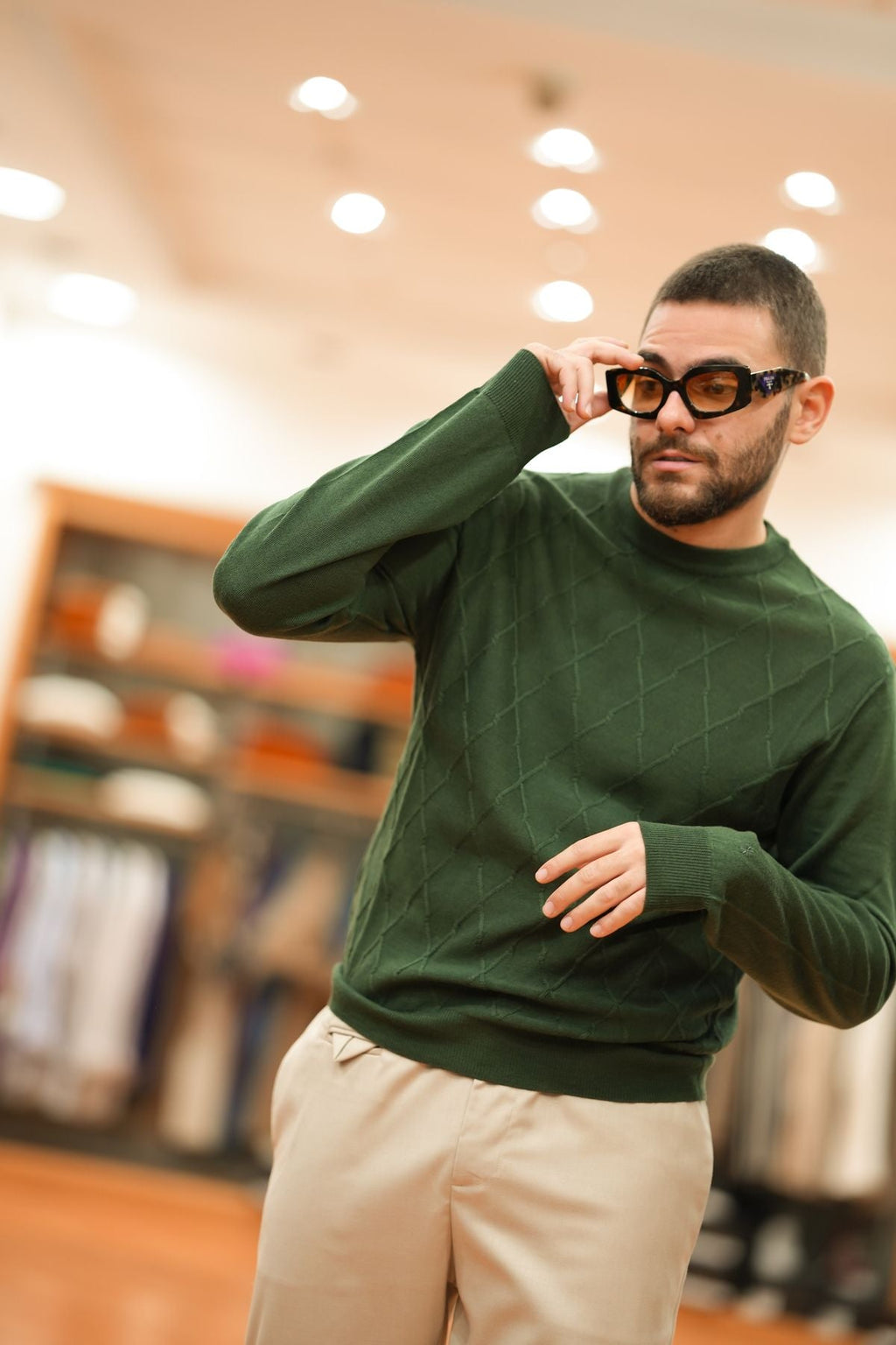 Classica e moderna, questa maglia da uomo girocollo è caratterizzata da una fantasia a quadri tono su tono sul tessuto, con polsi e fondo elasticizzati per garantire comfort e una vestibilità ottimale.