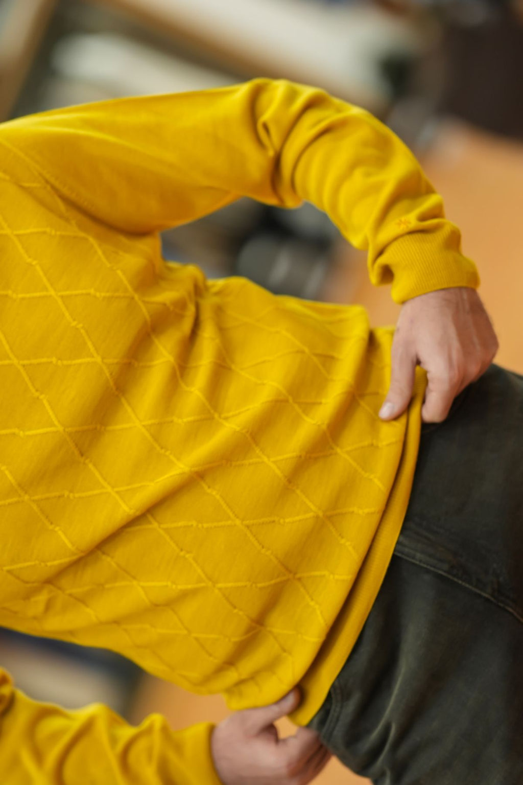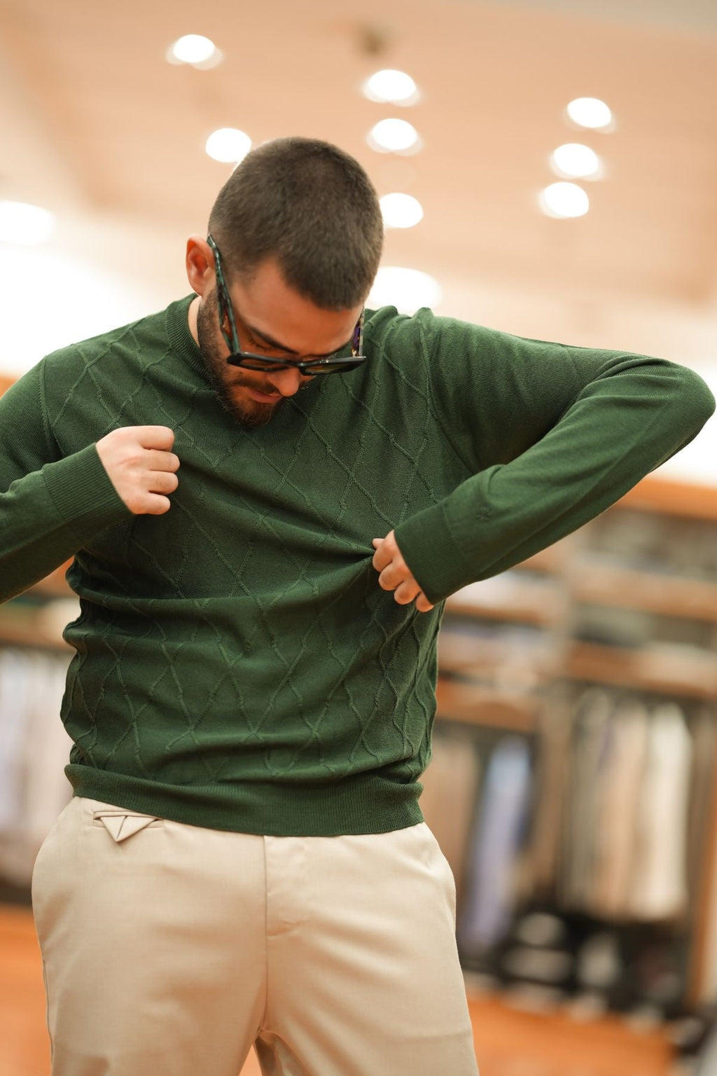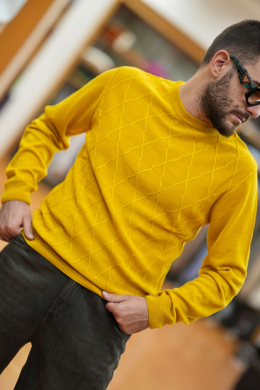 Classica e moderna, questa maglia da uomo girocollo è caratterizzata da una fantasia a quadri tono su tono sul tessuto, con polsi e fondo elasticizzati per garantire comfort e una vestibilità ottimale.