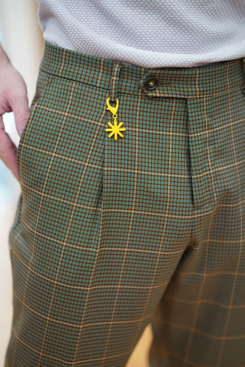 Il design include due tasche america frontali, due tasche posteriori a filo con bottone, chiusura con zip, gancio e bottone e fondo da 17 cm, ideale da abbinare a scarpe eleganti o mocassini.