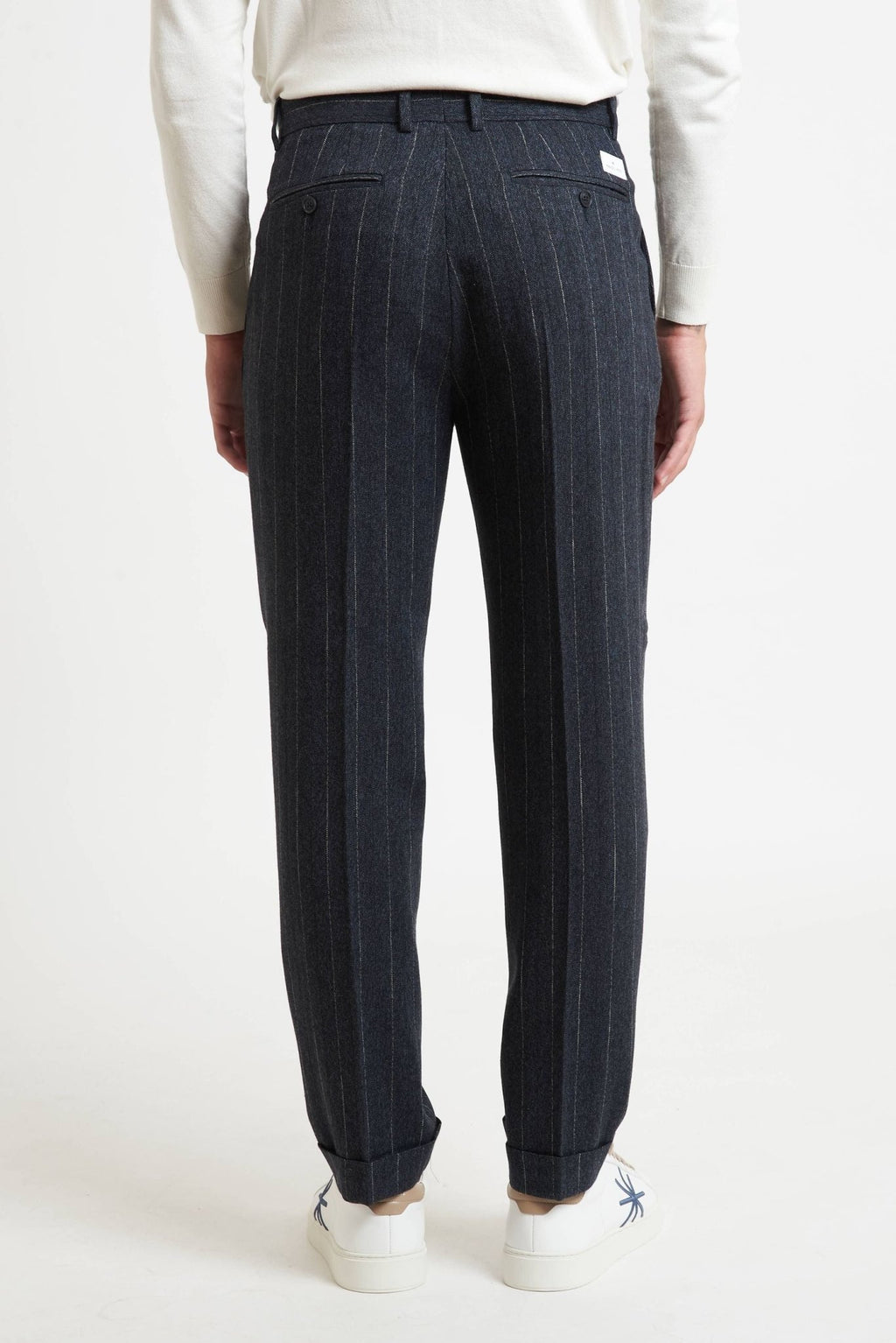 Un capo elegante e versatile, questi pantaloni da uomo con una pinces presentano due tasche America frontali e due tasche posteriori a filo con pattina e bottoncino, risvolto sul fondo e chiusura con bottoni, perfetti per un look raffinato e sartoriale. La fantasia gessata aggiunge un tocco classico e distintivo.
