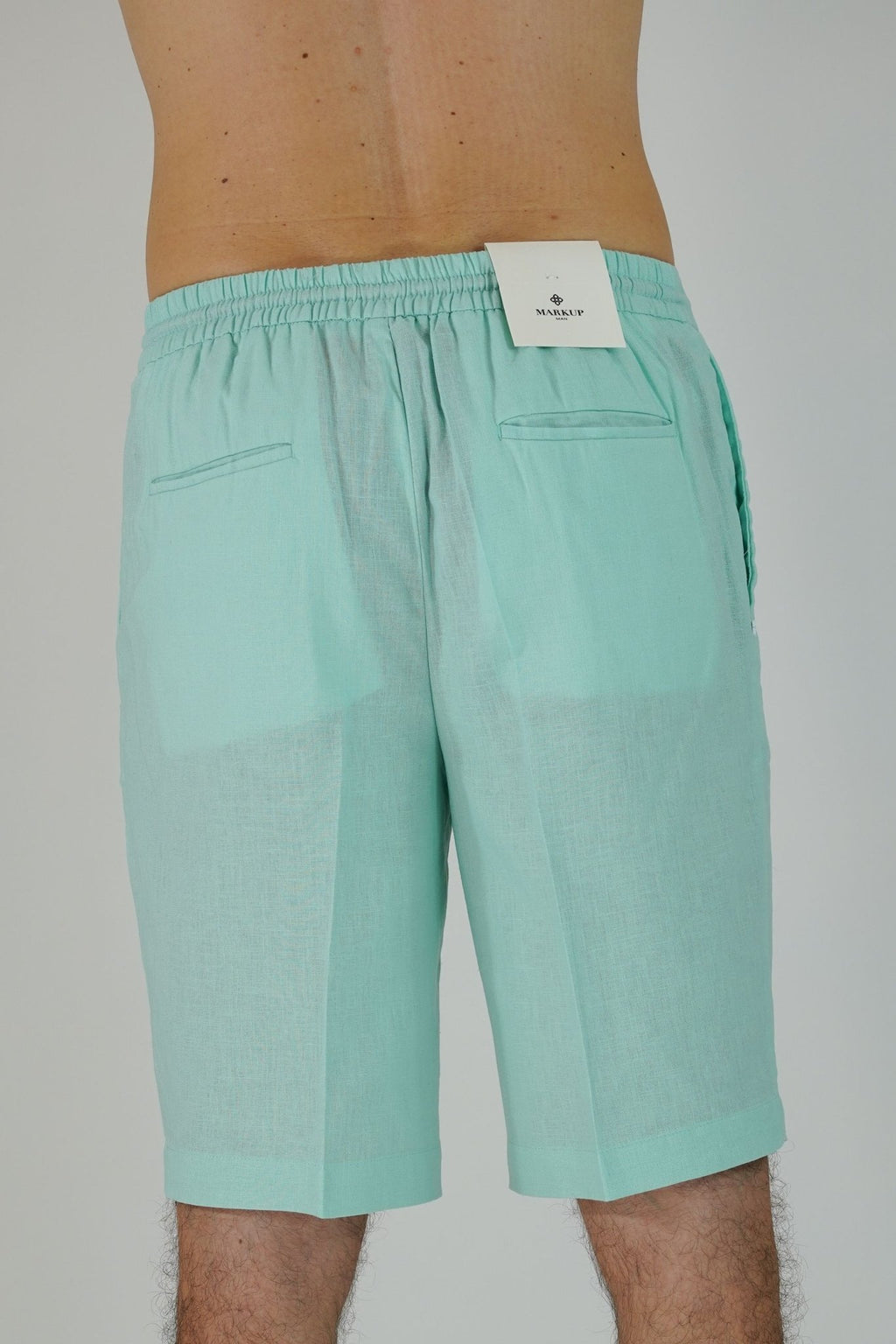 Bermuda con pience, tasca america, elastico sul retro del punto vita e con laccio regolatore interno,chiusura con bottone e cerniera due tasche a friso sul retro.