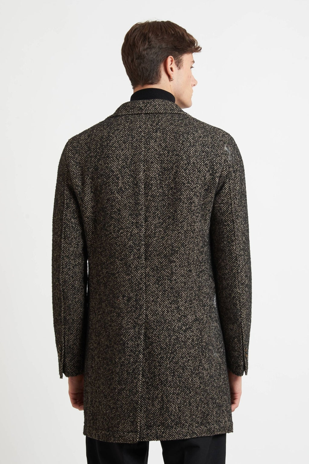 Raffinato e intramontabile, questo cappottino a petto a lancia è realizzato in un tessuto misto con elegante fantasia spina di pesce, perfetto per completare look formali o casual chic durante la stagione fredda.La chiusura frontale con bottoni e le due tasche a toppa con pattina uniscono praticità e stile, mentre il taglio sartoriale valorizza la silhouette mantenendo una vestibilità confortevole.