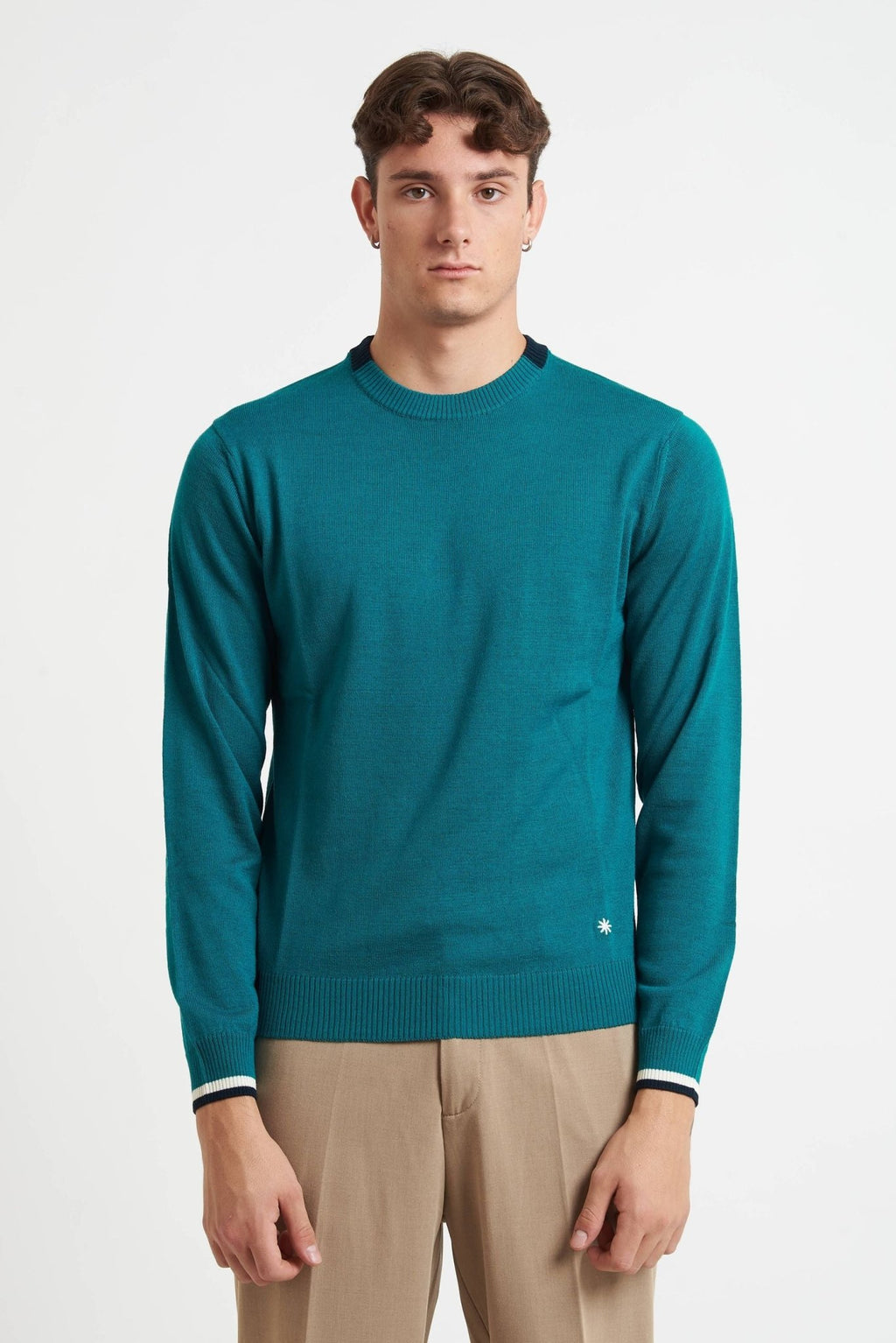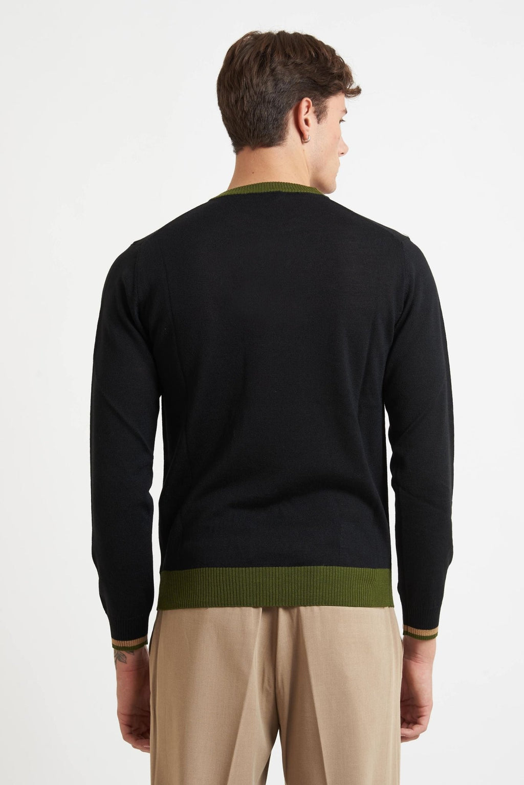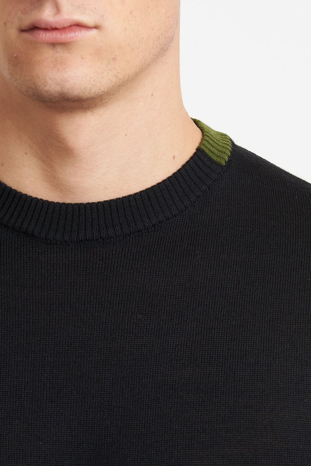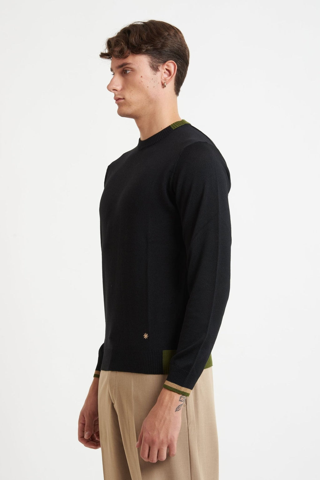Design: Maglia girocollo con contrasto colore su collo, polsi e fondo