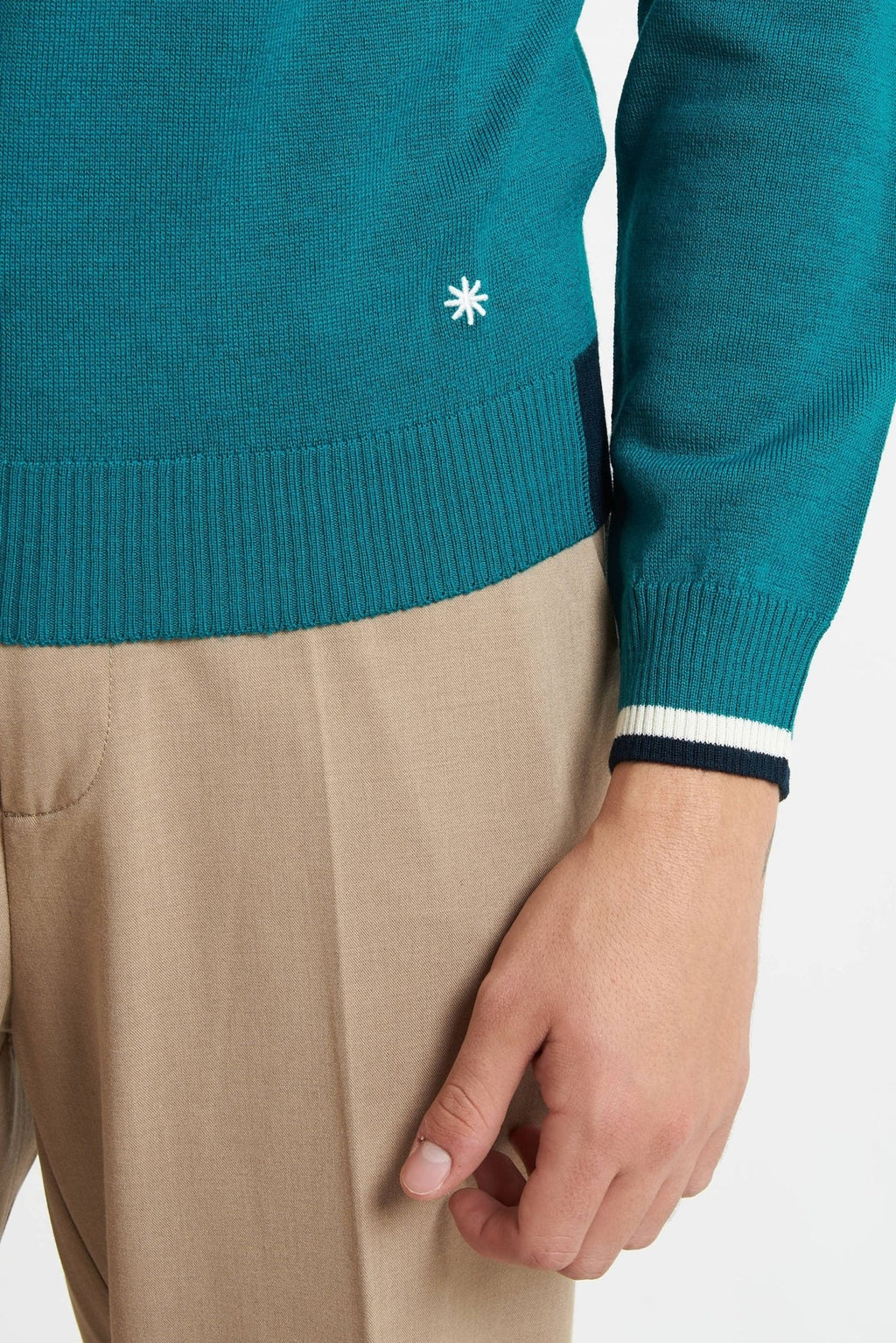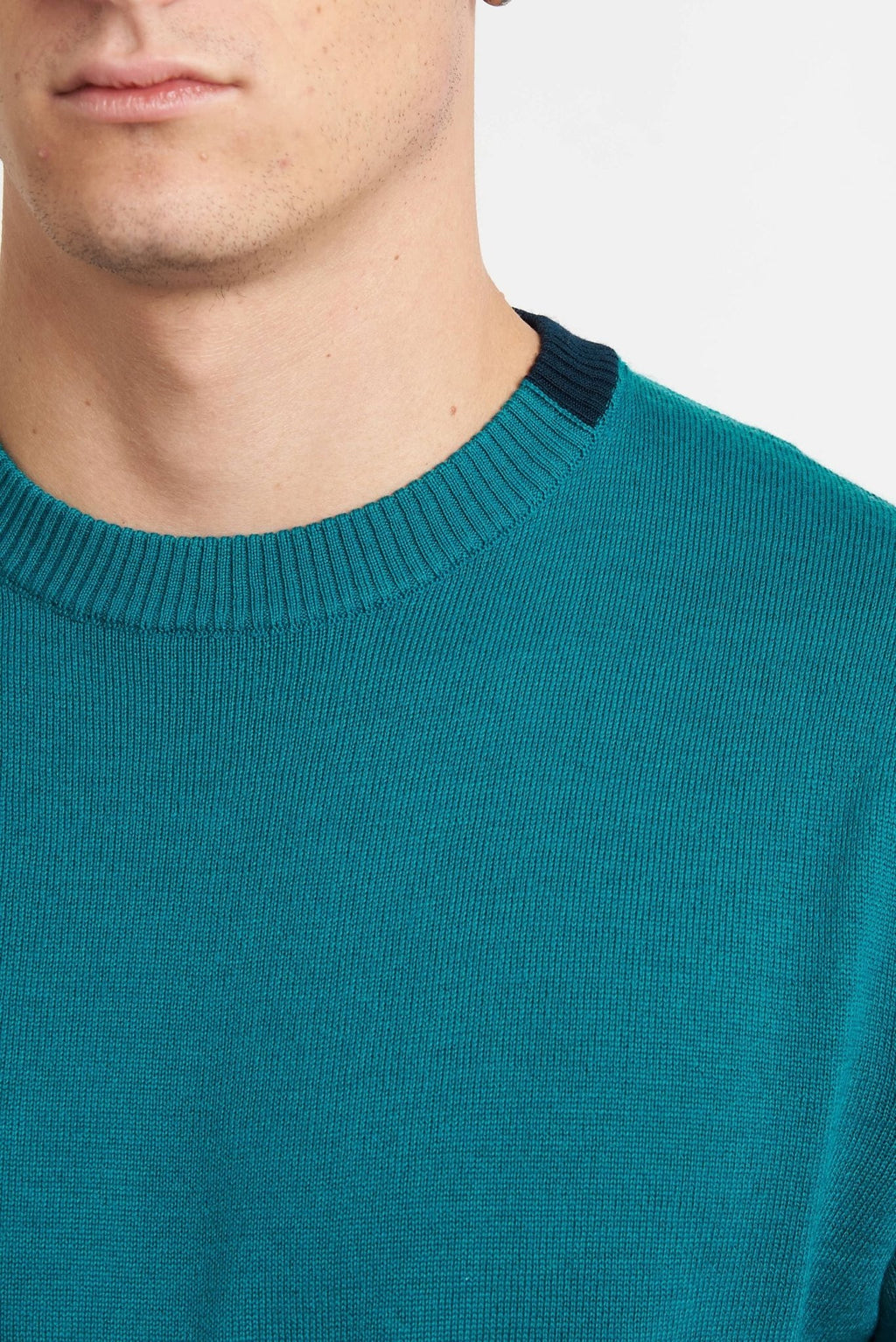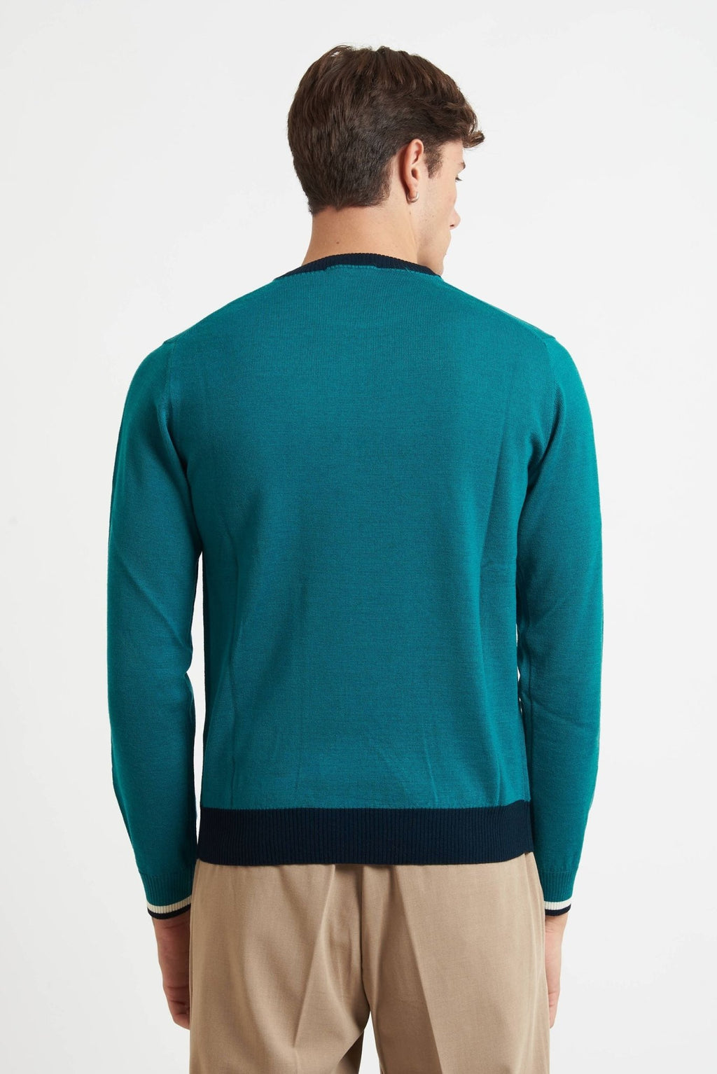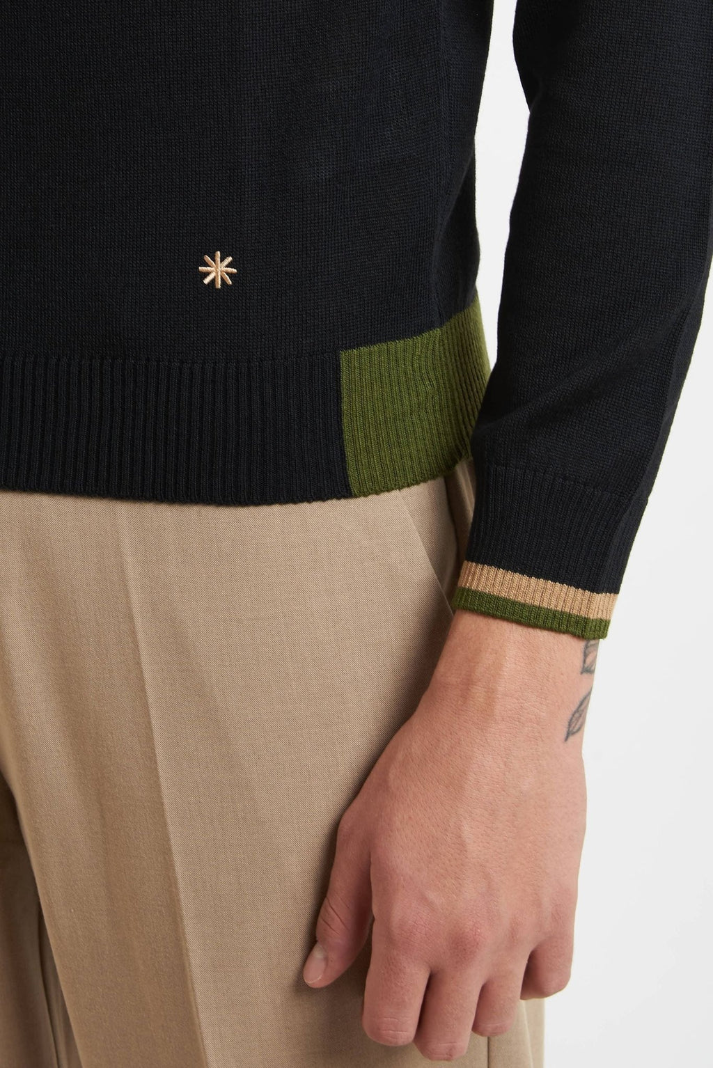 Design: Maglia girocollo con contrasto colore su collo, polsi e fondo
