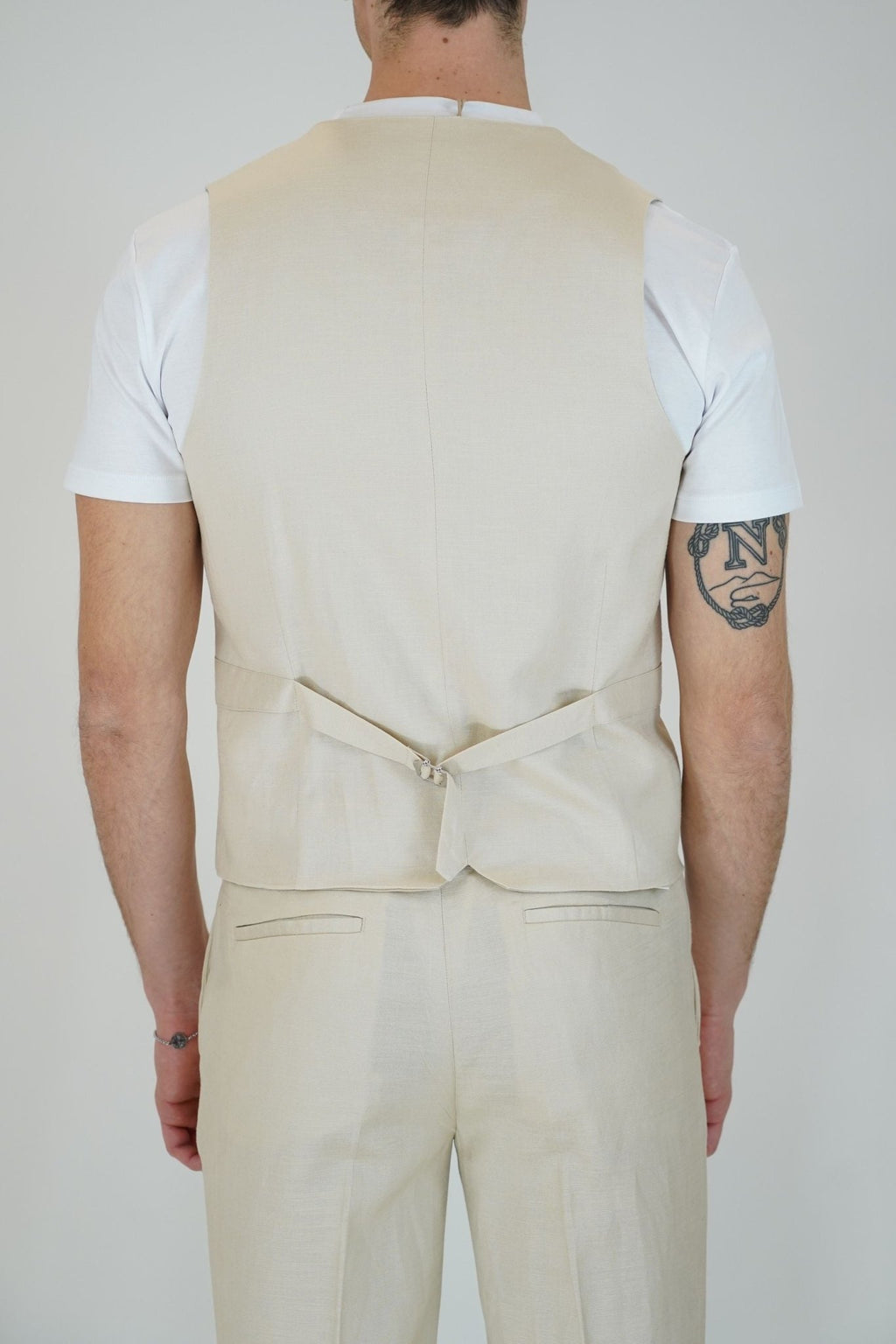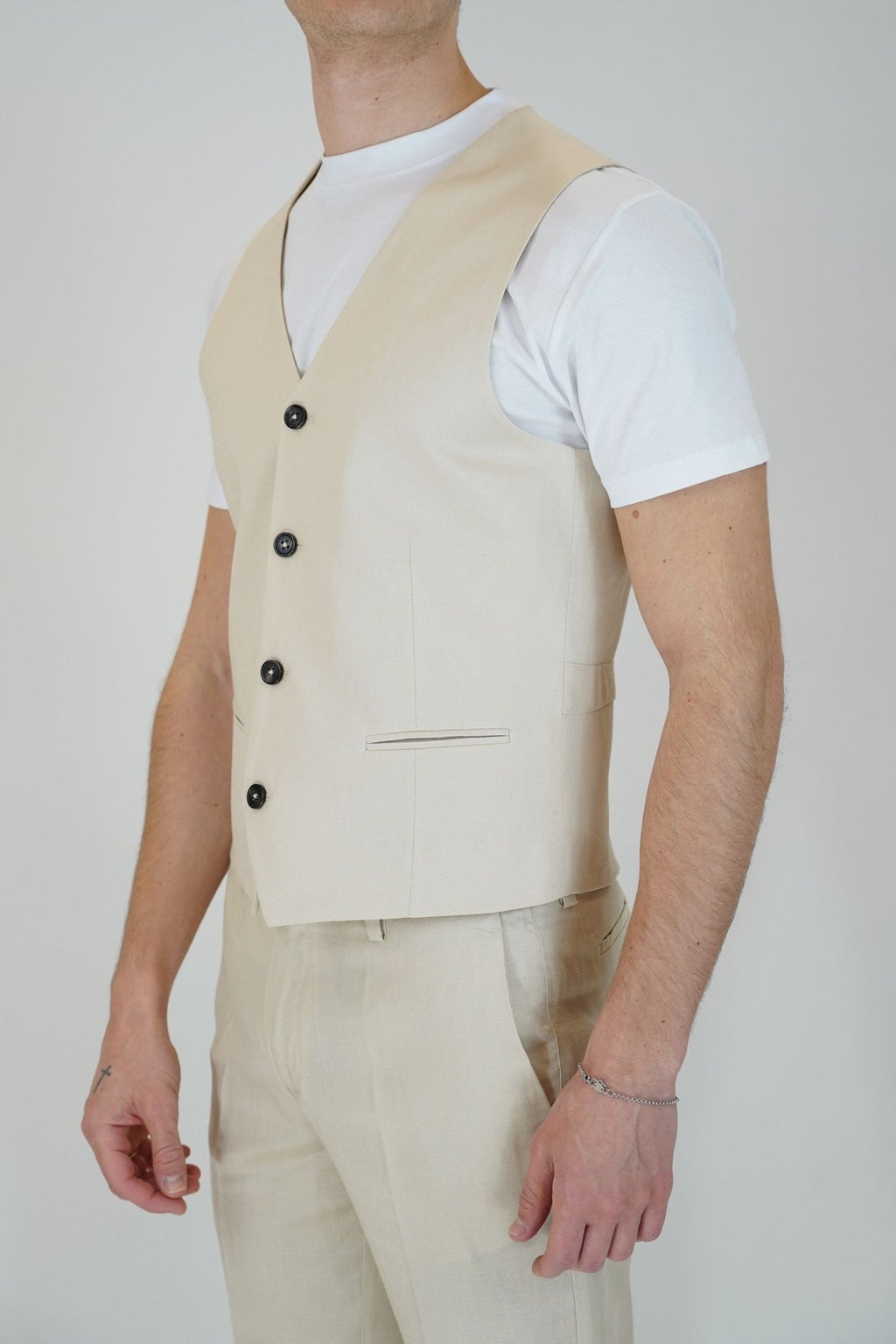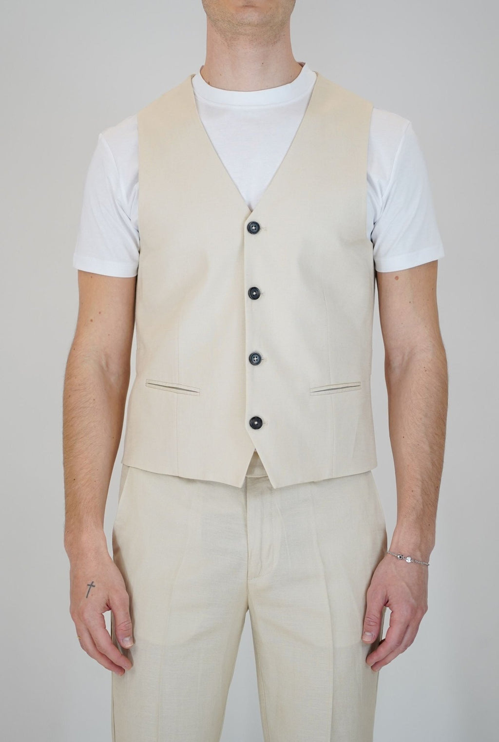 Gilet monopetto con tasche frontali a filo, 5 bottoni, e laccetto regolabile sul retro
