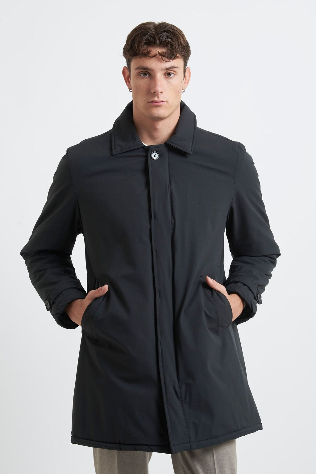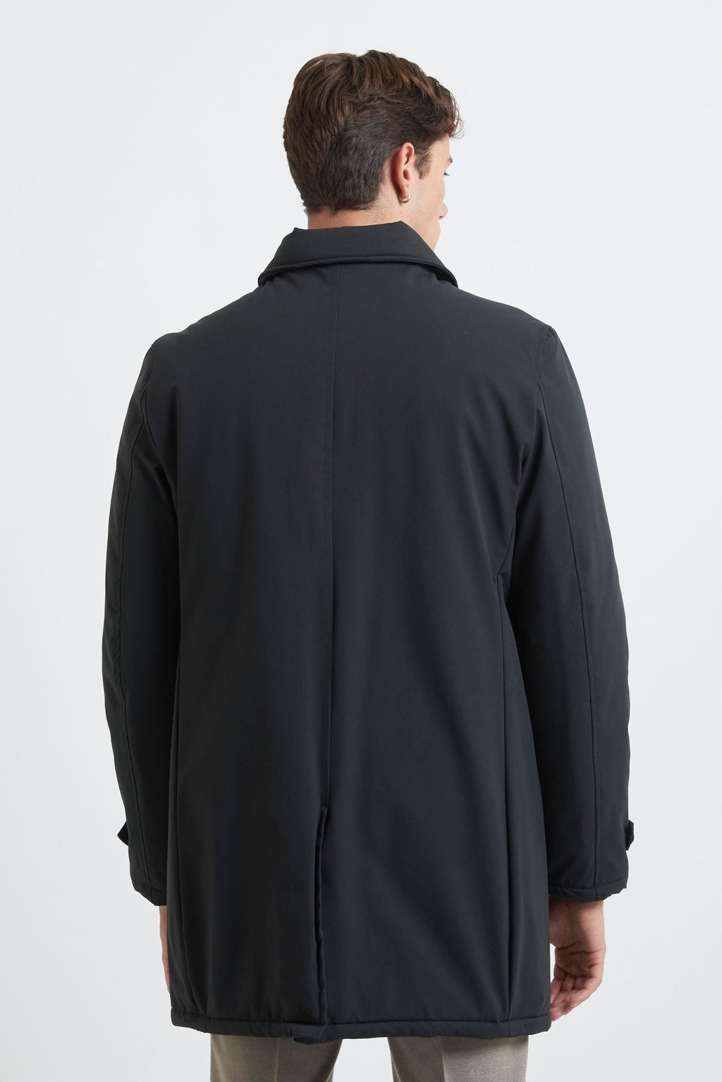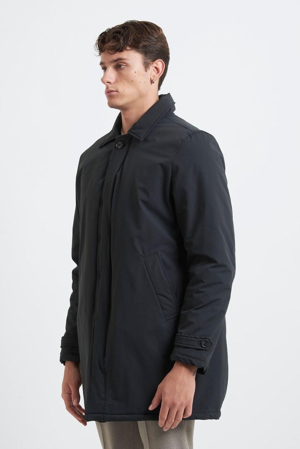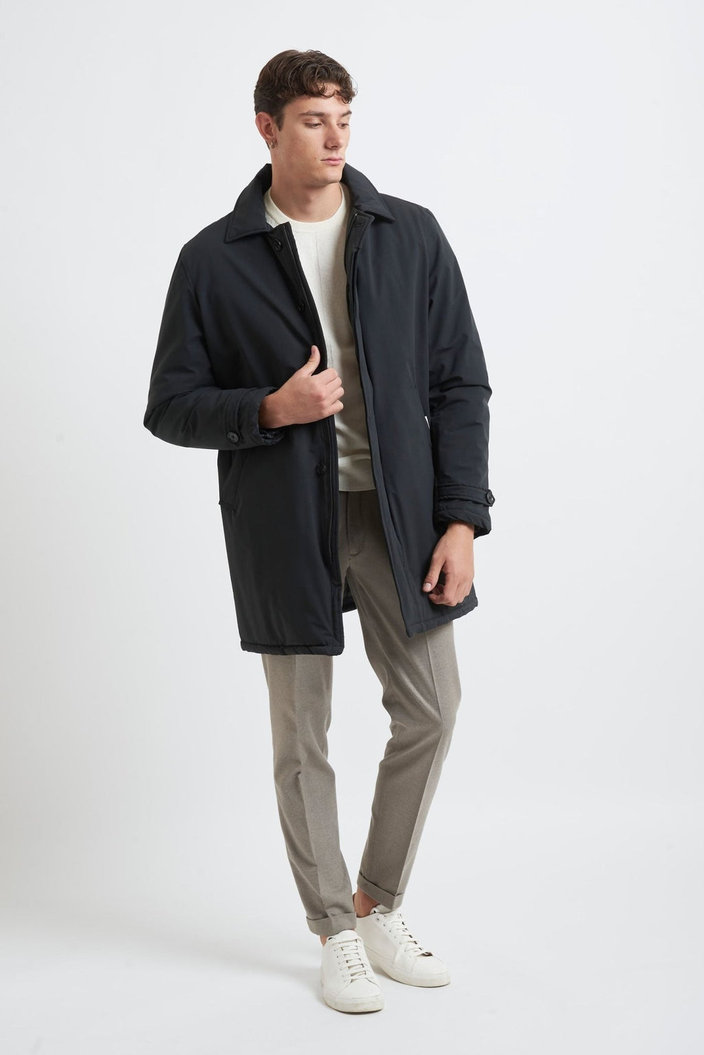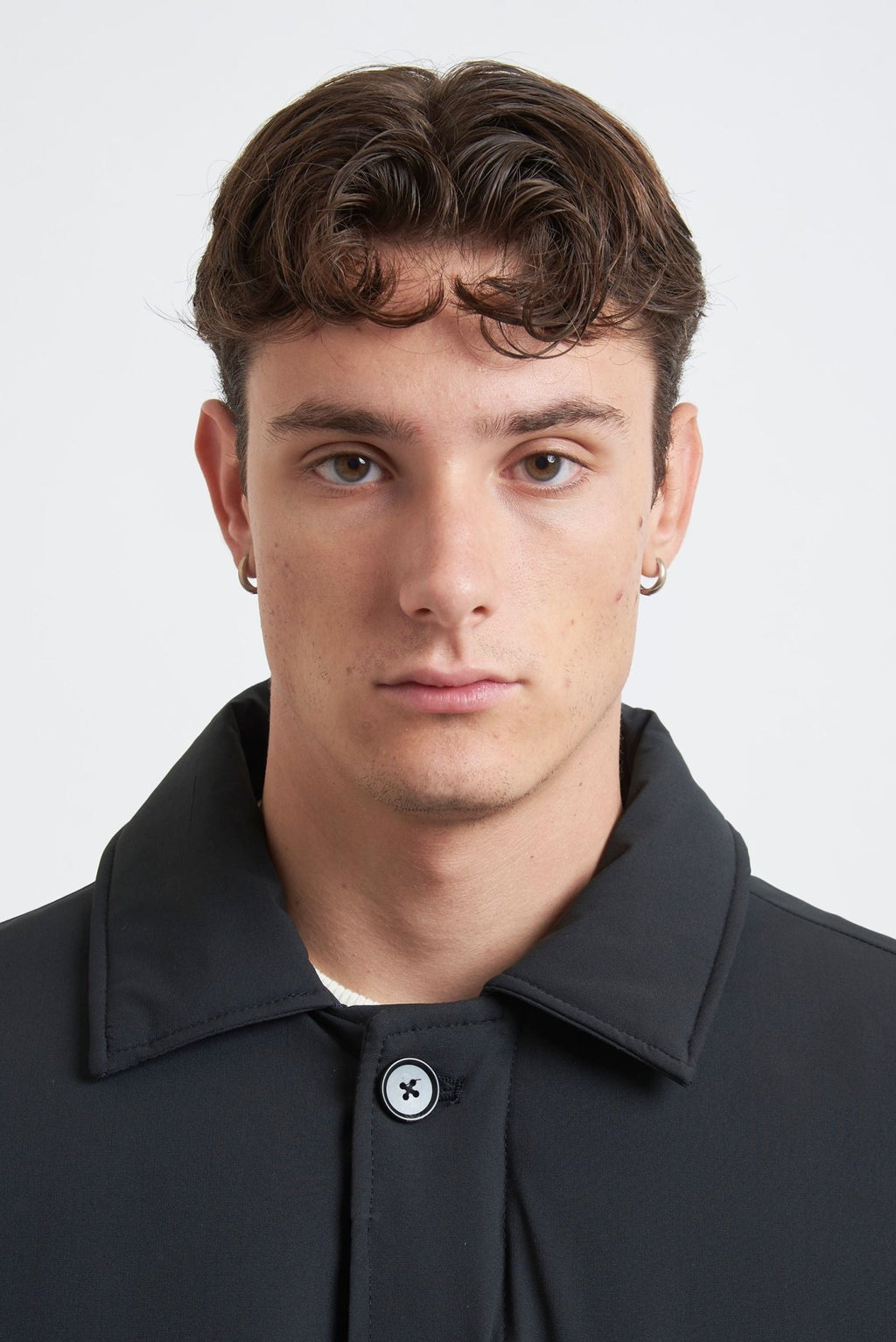 Pratico e moderno, questo cappottino tecnico da uomo modello loden è caratterizzato da chiusura frontale con cerniera termosaldata e bottoni con fintone ricoperto, tasca a filo frontale e spacco centrale sul retro, perfetto per look urbani contemporanei e protezione dalle intemperie.