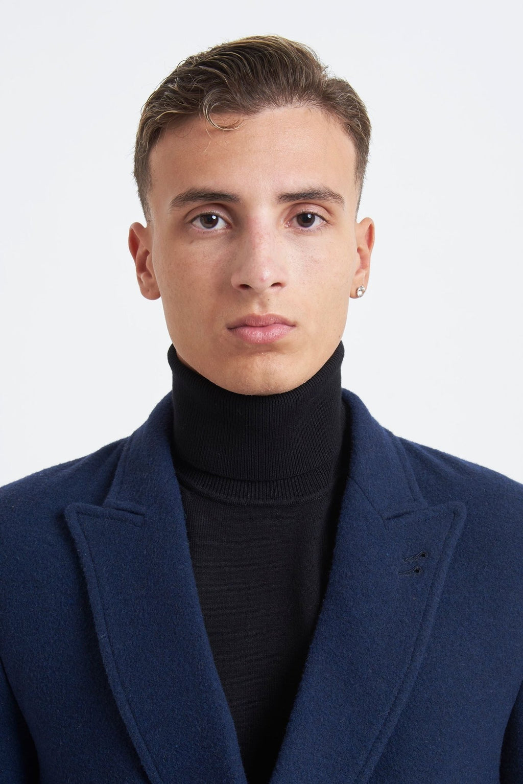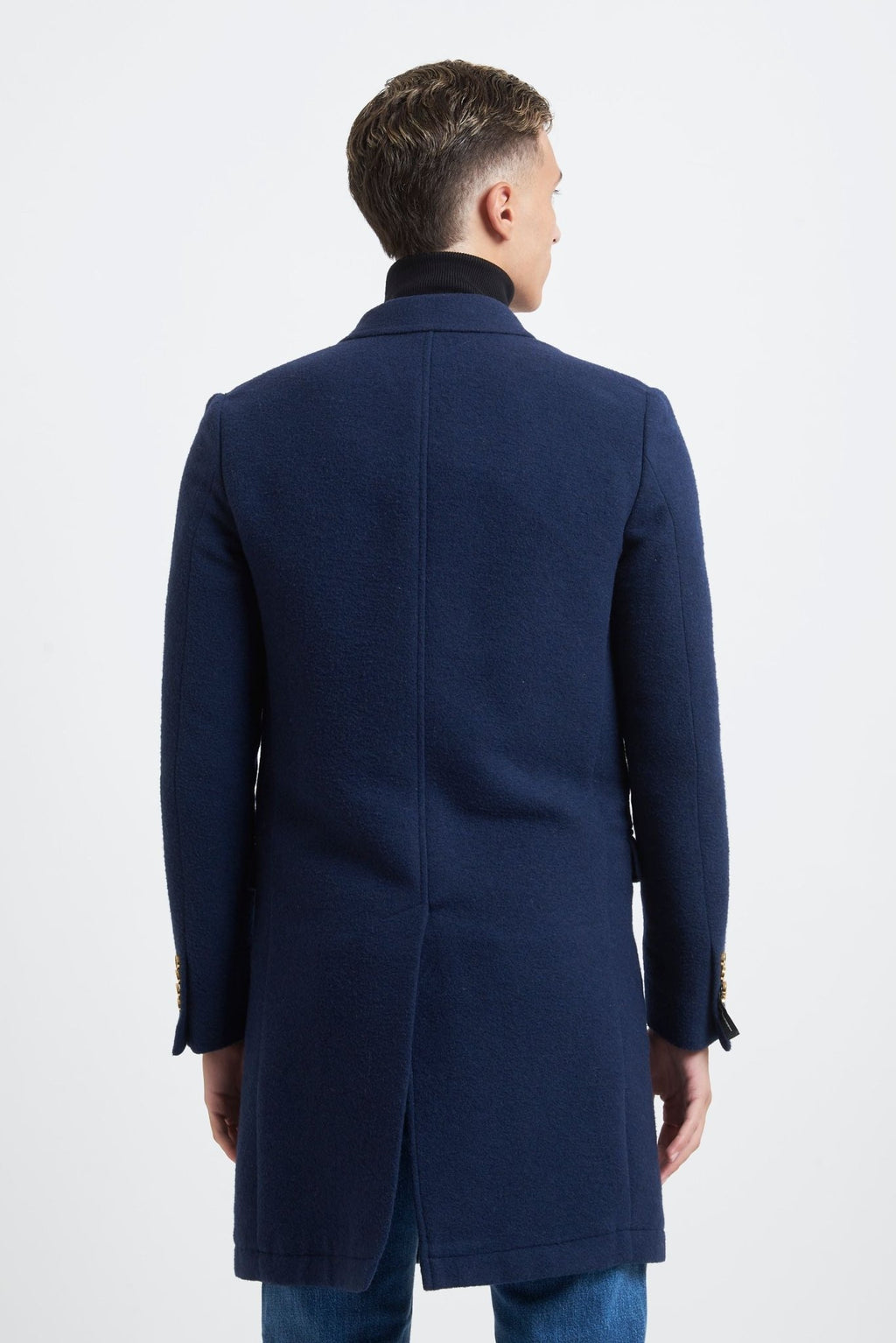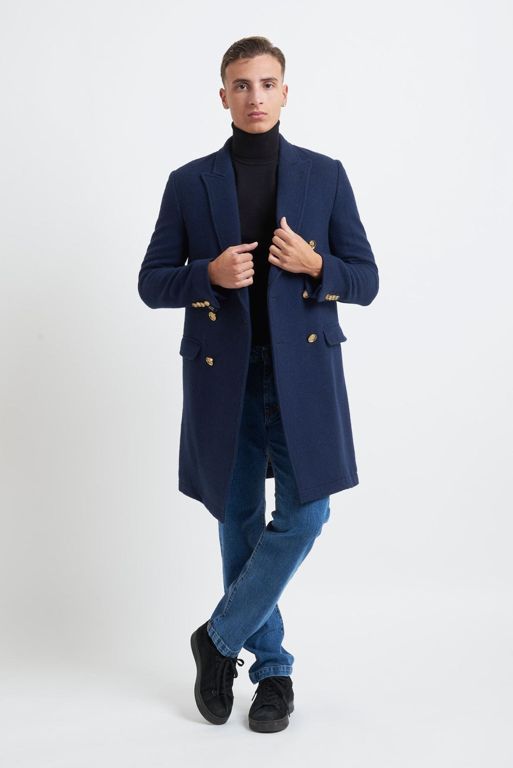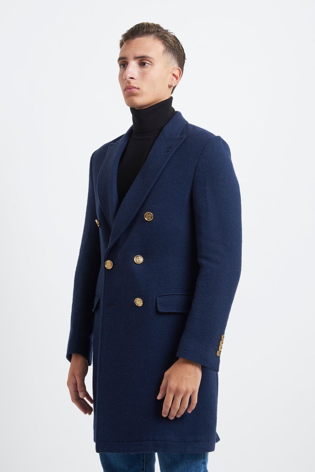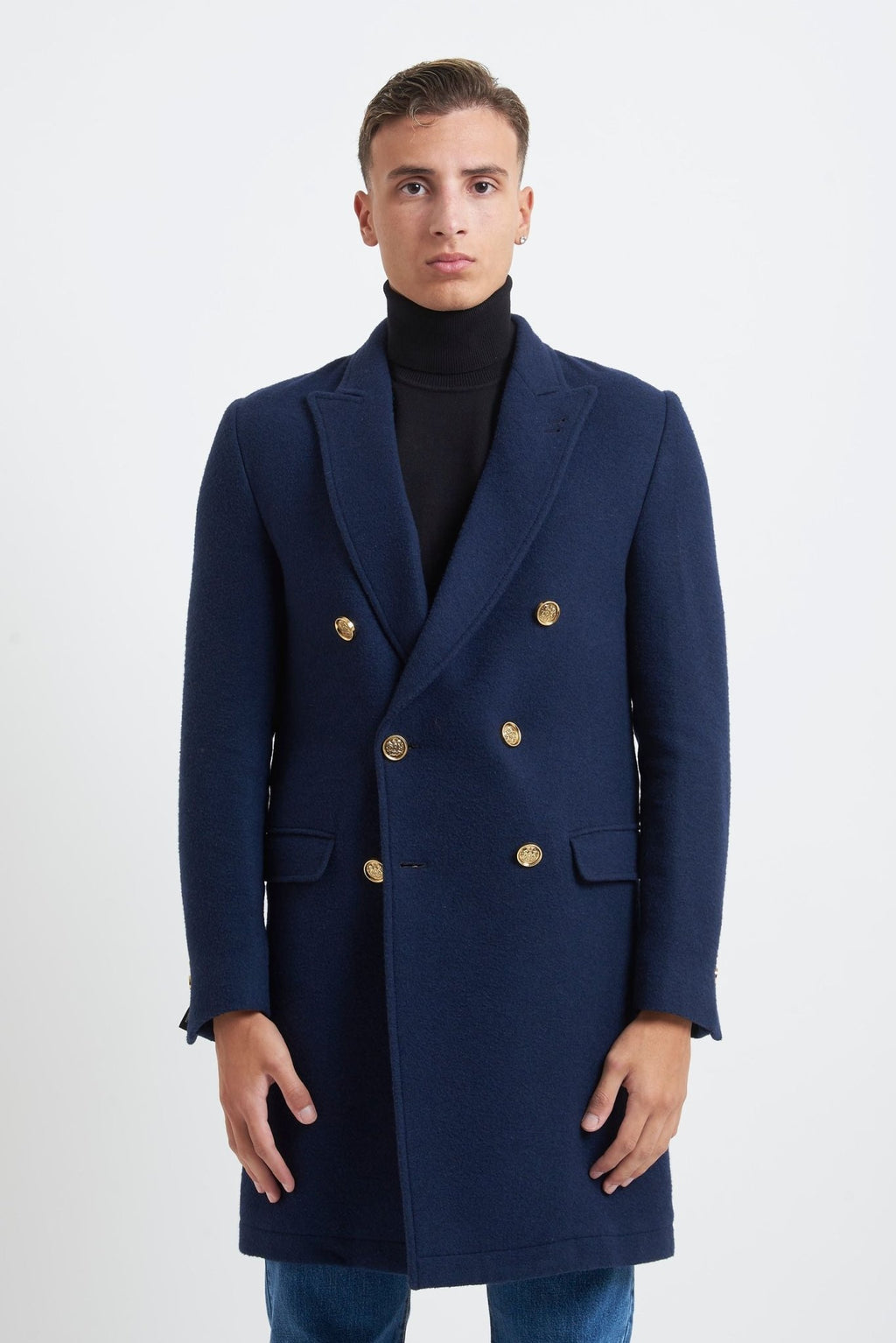 Elegante e raffinato, questo cappottino doppiopetto da uomo è caratterizzato da sei bottoni oro, rever a lancia e due tasche frontali con pattina, ideale per look formali, business o outfit sofisticati da giorno e da sera.