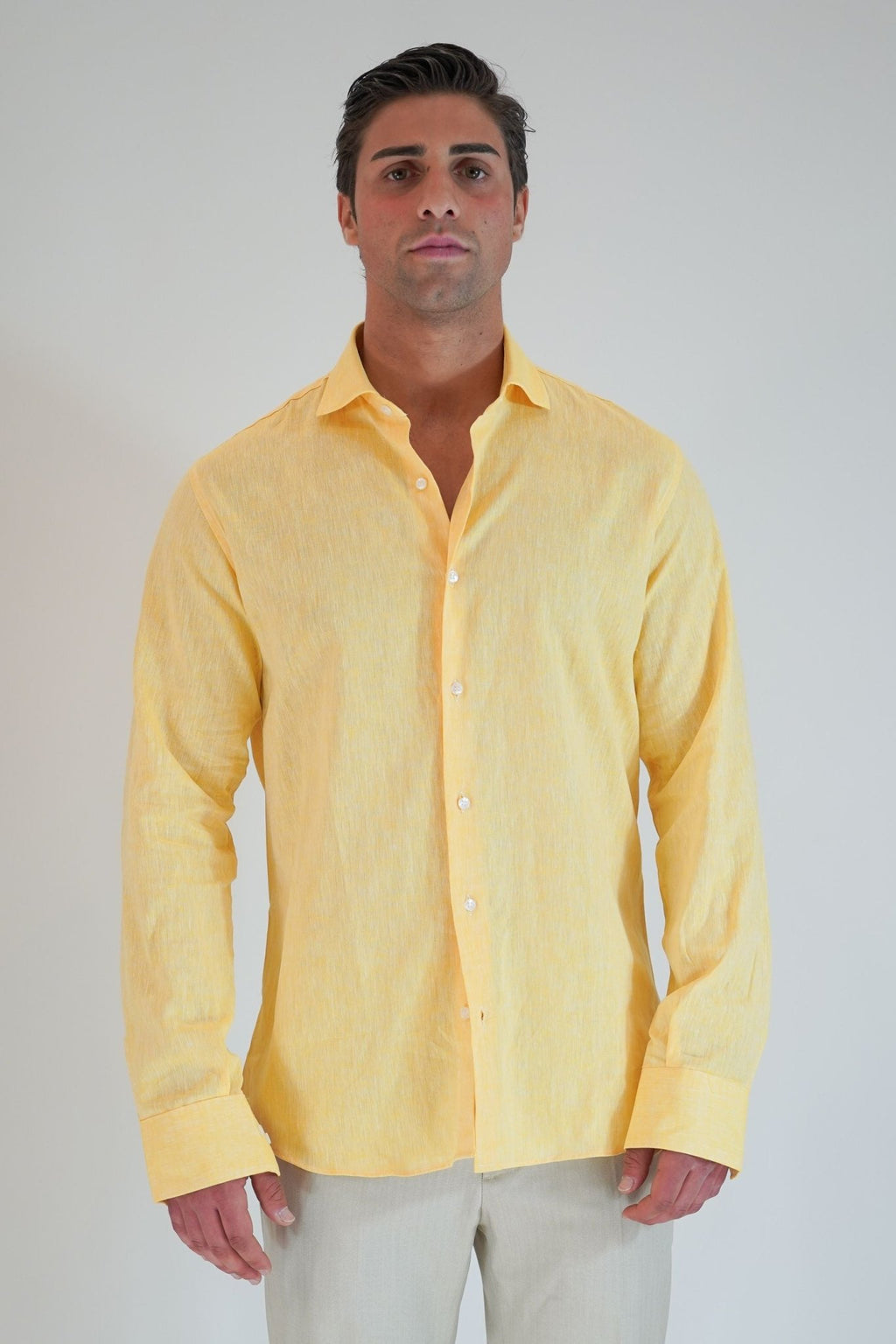 Camicia in lino, chiusura bottoni, con collo mezzo francese riprese sul retro