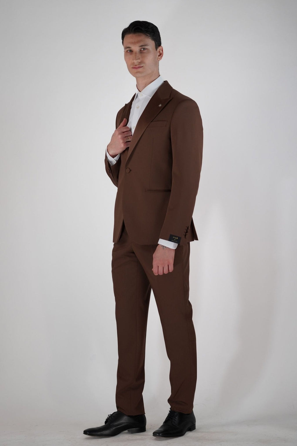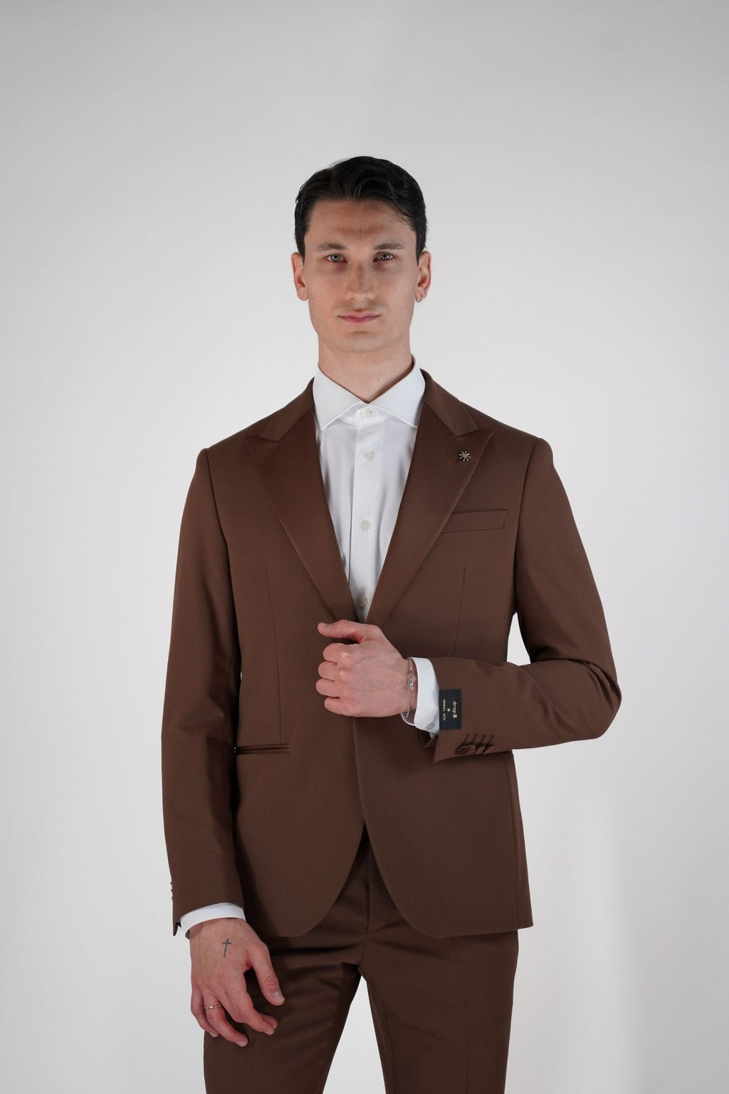 Smoking drop 8 foderato.Giacca: ampio rever a lancia, chiusura un botton, due tasche a filo e un taschino frontali, due spacchi sul retro, quattro bottoni ai polsi, lunghezza 72 cm. Pantalone: slim fit, due tasche america sul davanti, due a filo sul retro con bottoncino, chiusura con zip, gancio e bottone, fondo 17 cm.