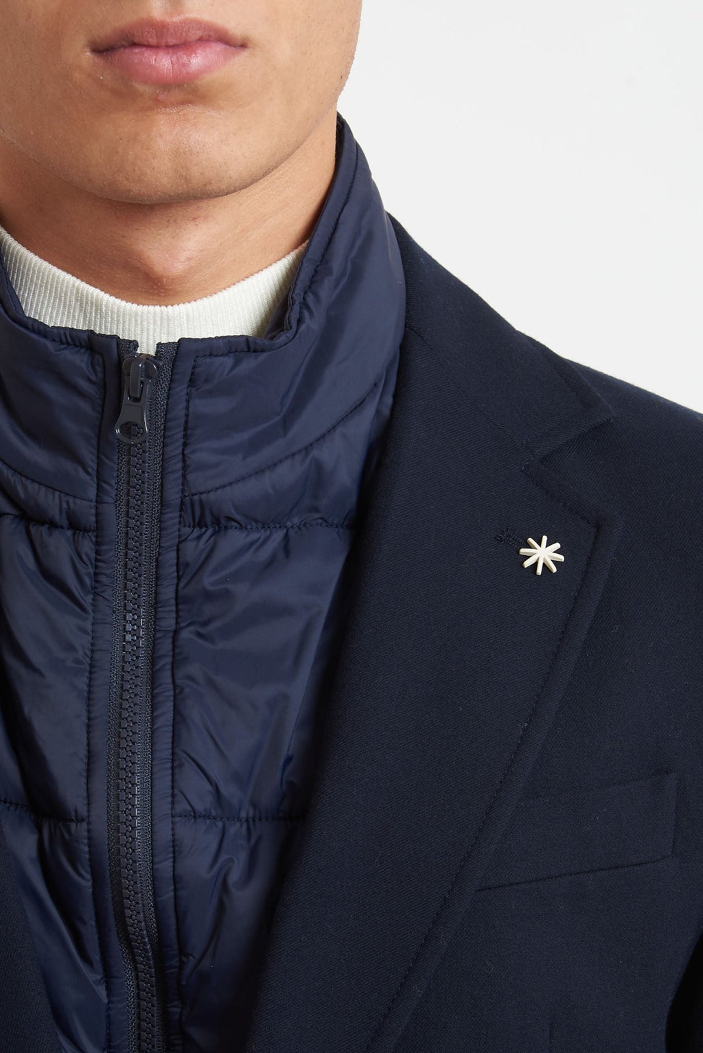 Il design include pettorina drop otto, chiusura a due bottoni, due tasche a toppa e un taschino frontale, due spacchi sul retro e quattro bottoni ai polsi, con finiture a impunture AMF, per un look curato e sofisticato.