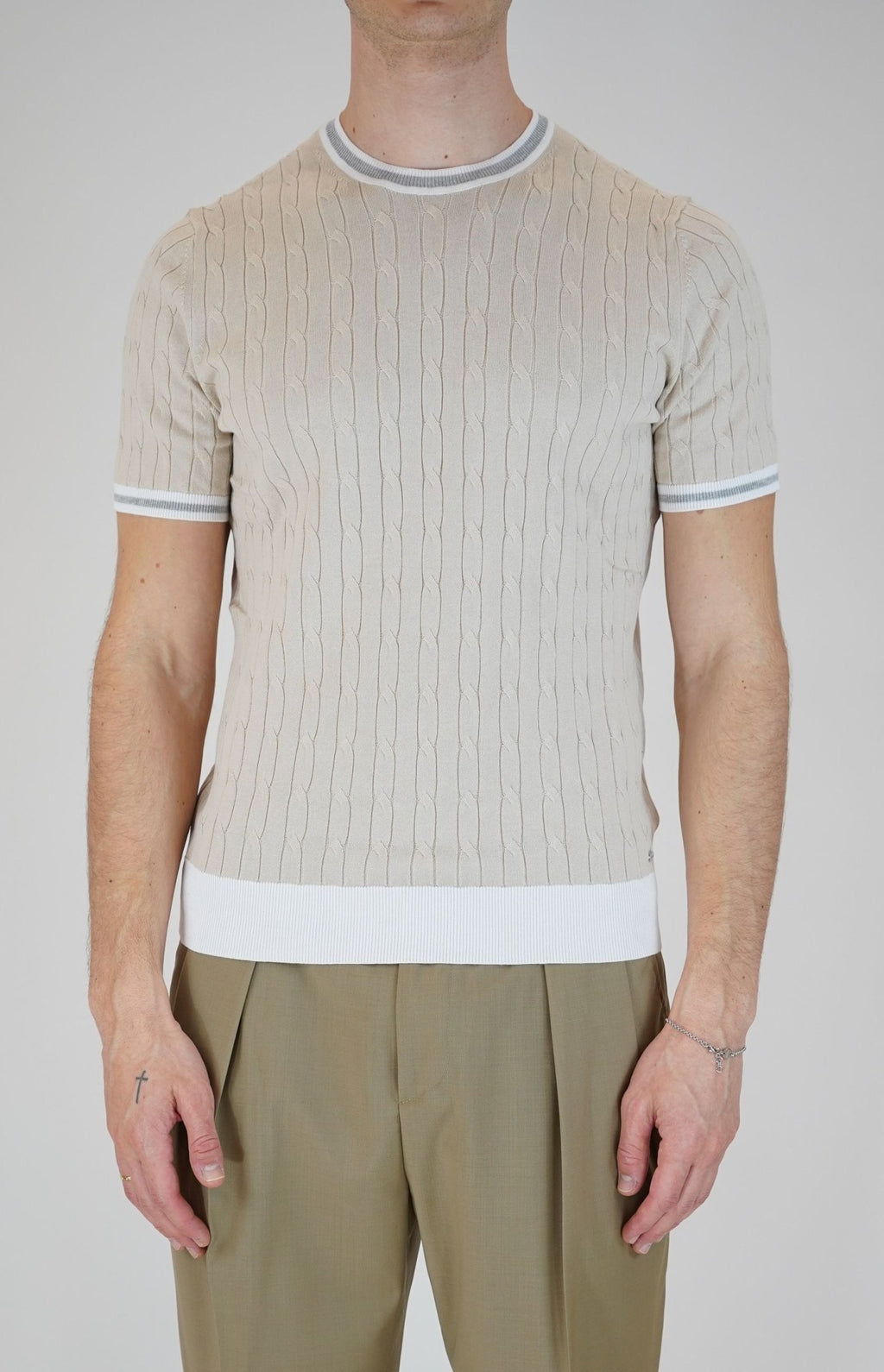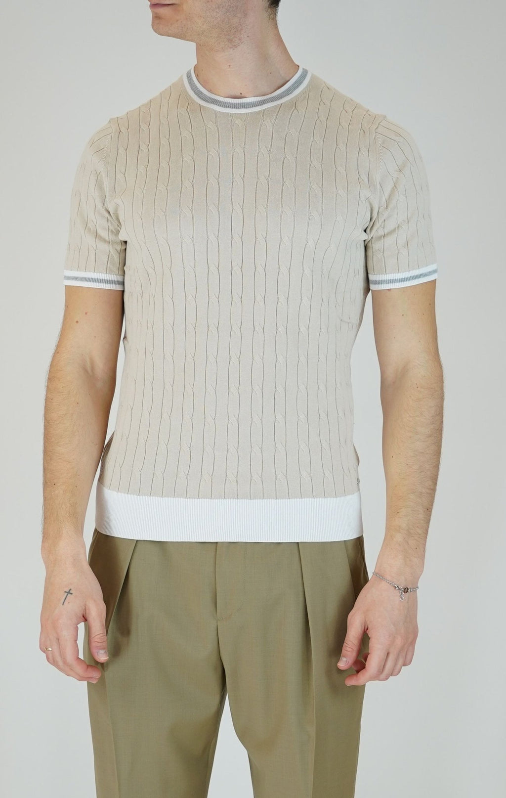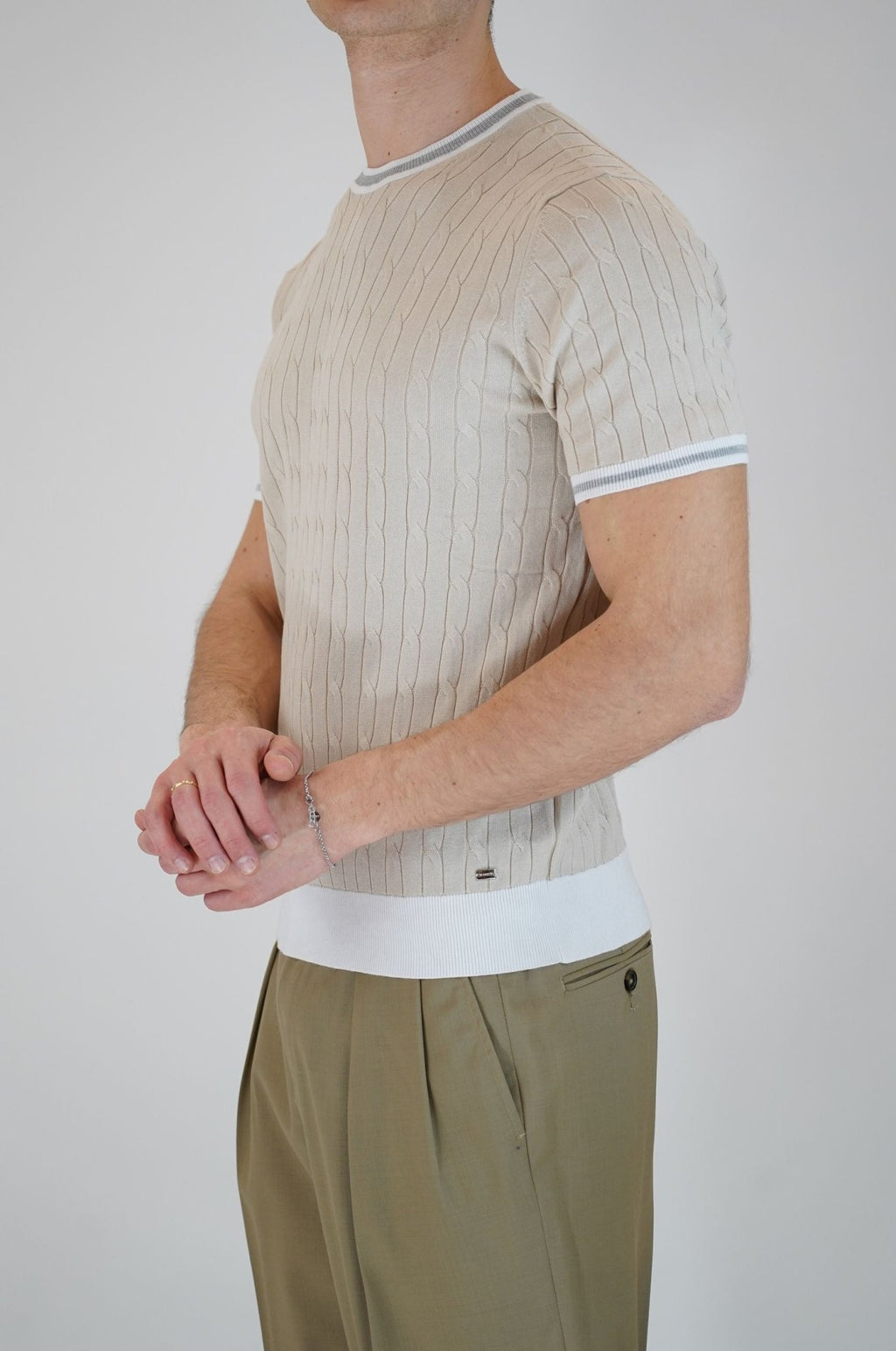 T-shirt girocollo in cotone con fantasia trecce , collo , manica e fondo elasticizzato a contrasto