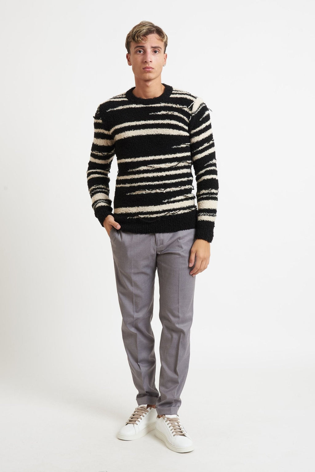Moderna e distintiva, questa maglia girocollo unisce stile contemporaneo e comfort, ideale per look casual chic o smart casual.Realizzata in tessuto misto 64% lana, 24% acrilico e 12% nylon, garantisce calore, morbidezza e vestibilità ottimale.